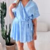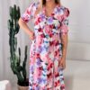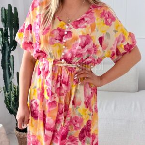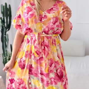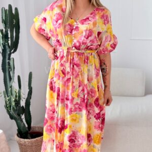 Fason z delikatnie zaznaczoną talią dzięki wszytej gumce pięknie podkreśla sylwetkę, zapewniając jednocześnie wygodę i swobodę ruchów. Dekolt w kształcie serka wysmukla szyję i dodaje całości lekkości, a ozdobne guziki nadają sukience charakteru i modowego wykończenia.