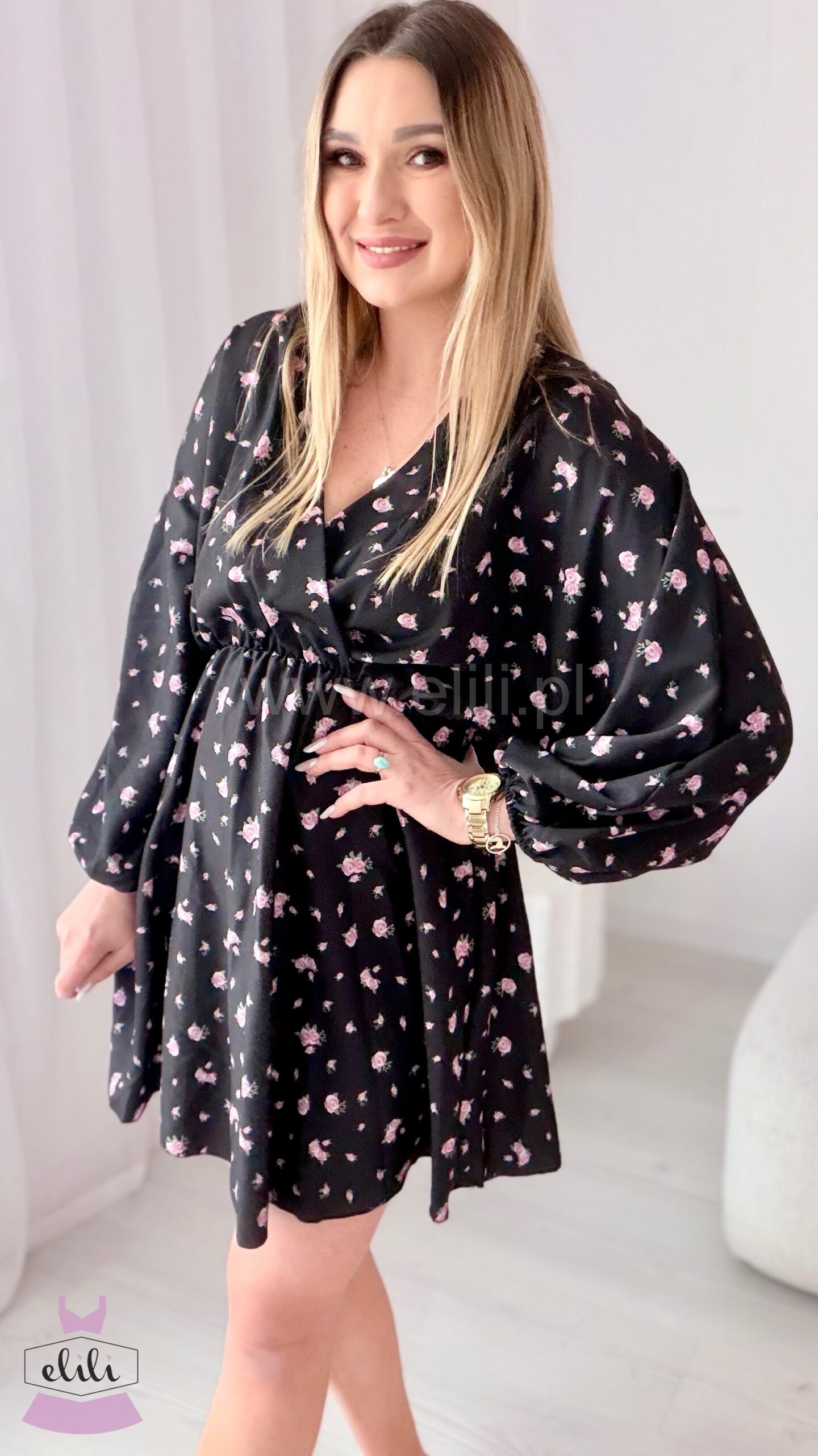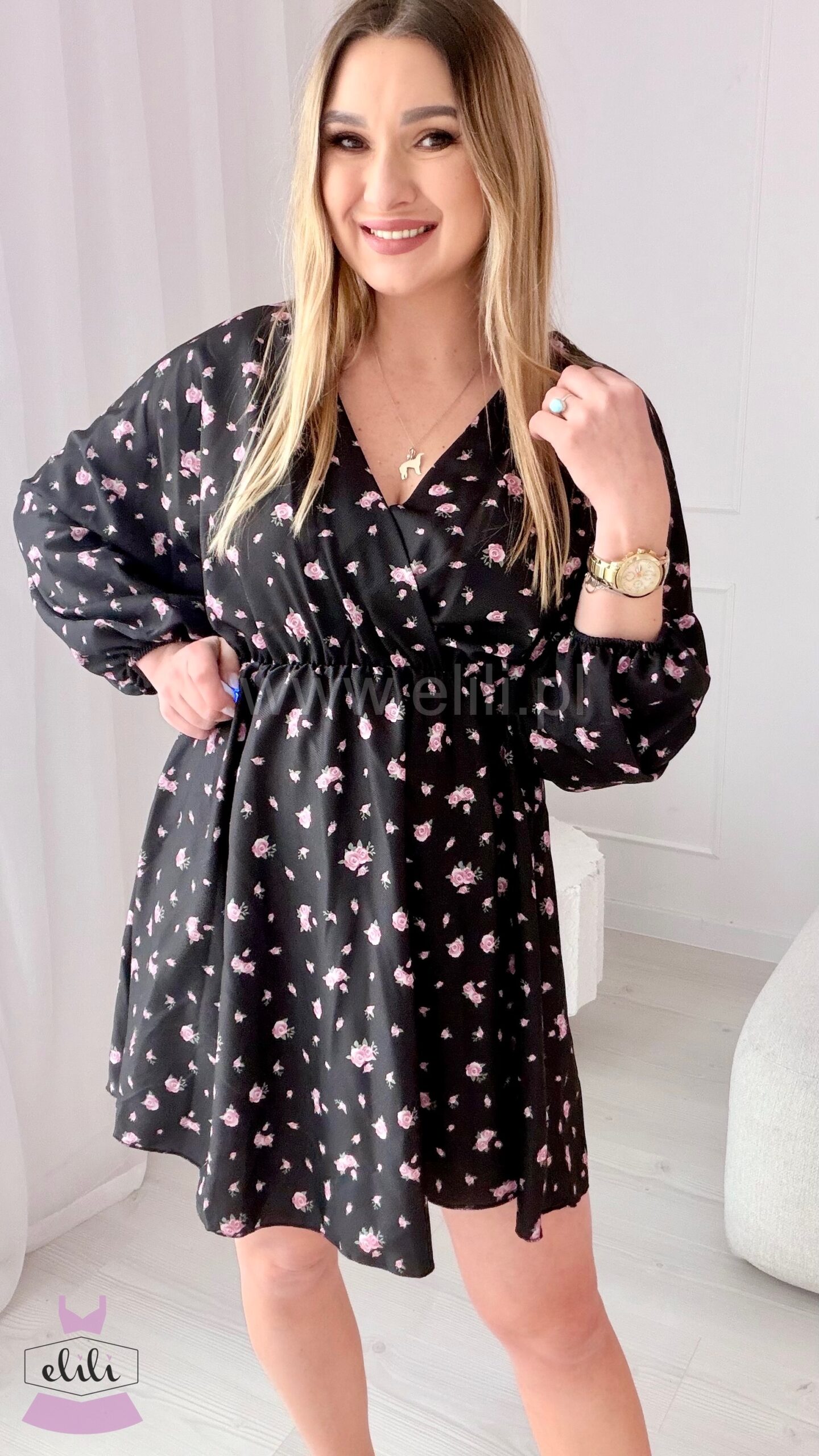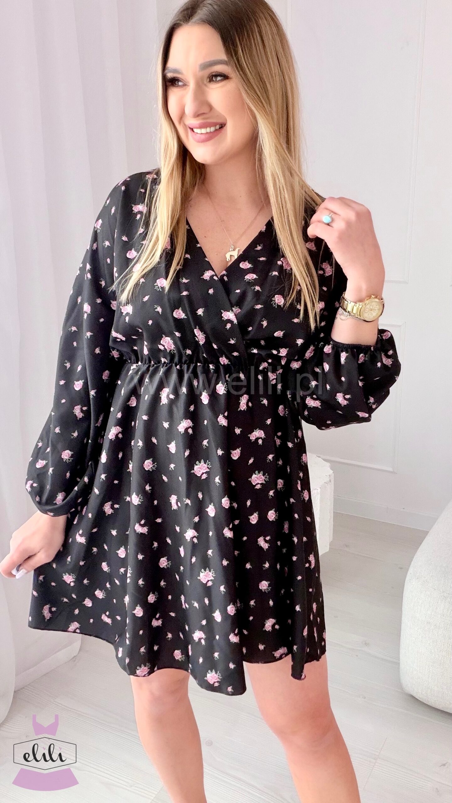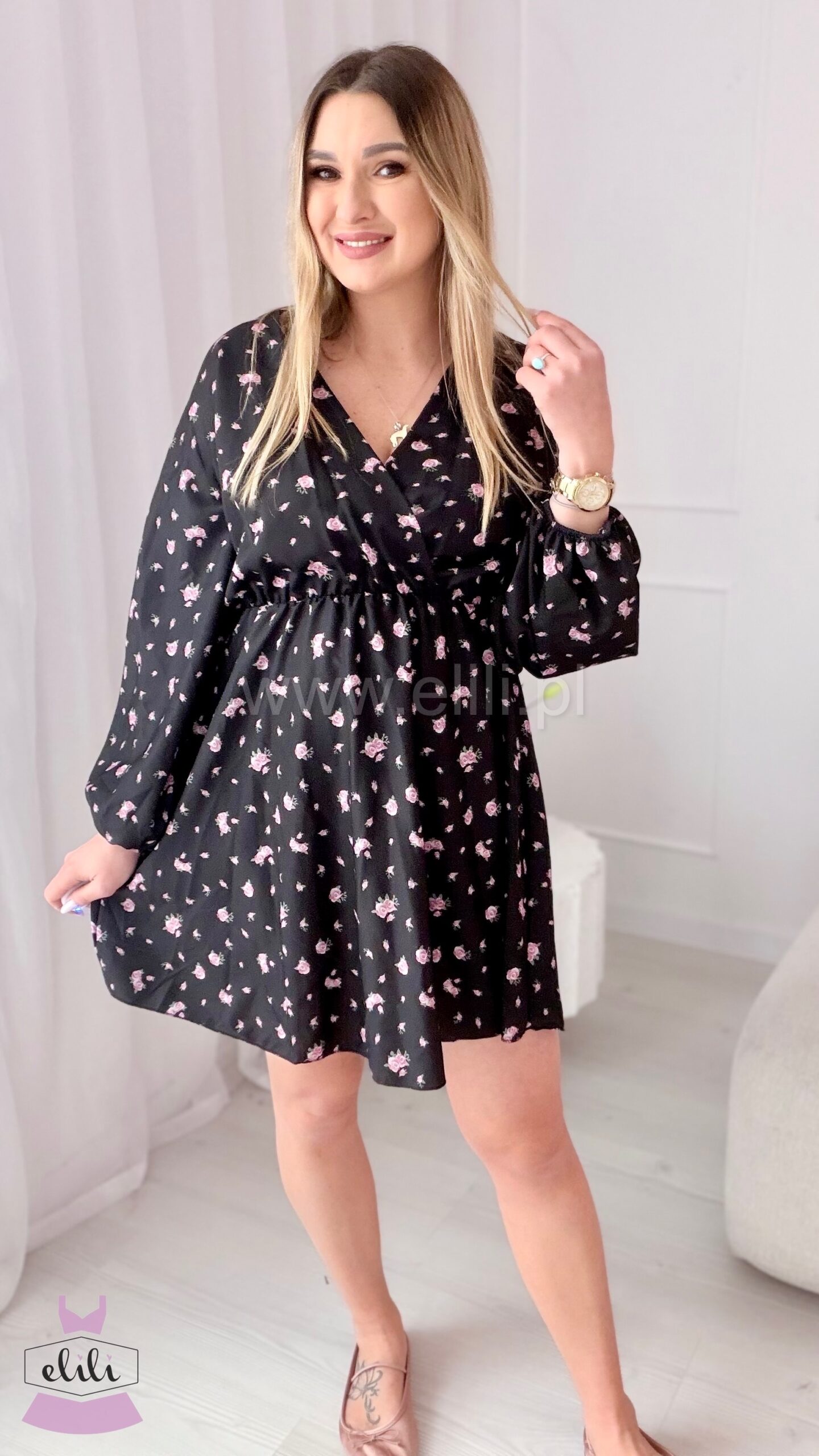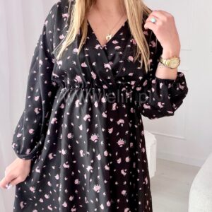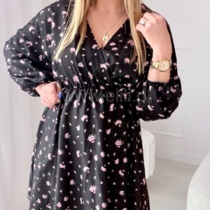 Sukienka Kalina czarna w różowe kwiatuszki