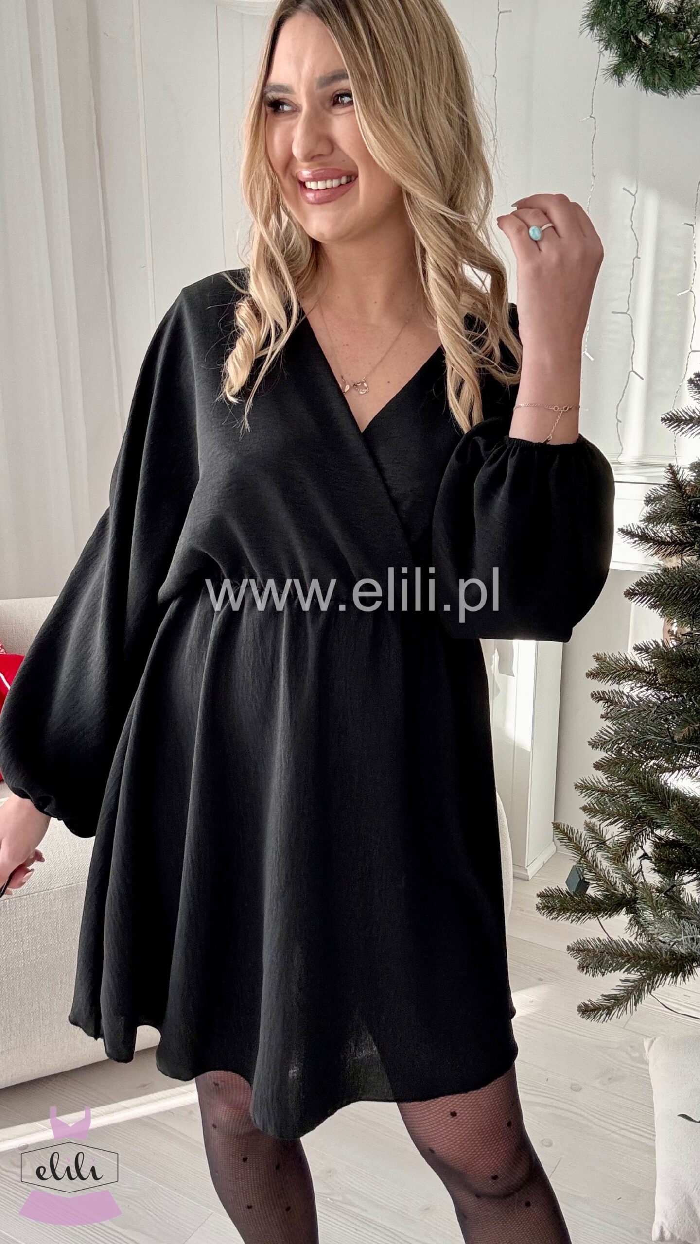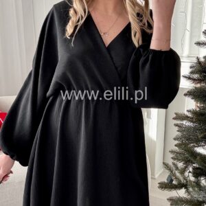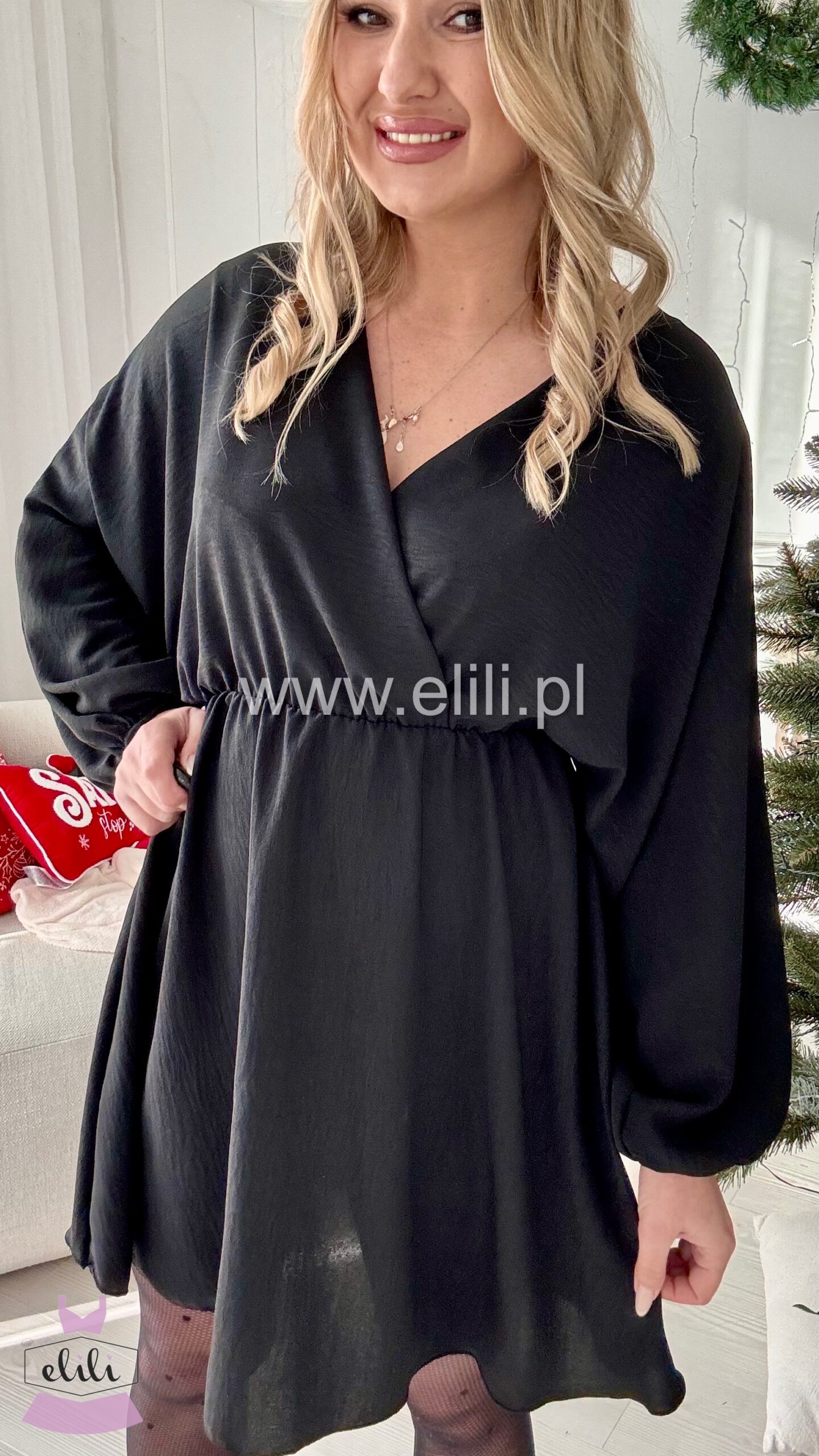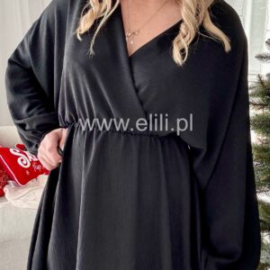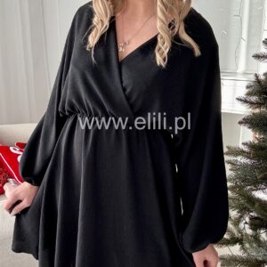 Model z kimonowymi rękawami, gumką w talii i kopertowym dekoltem.