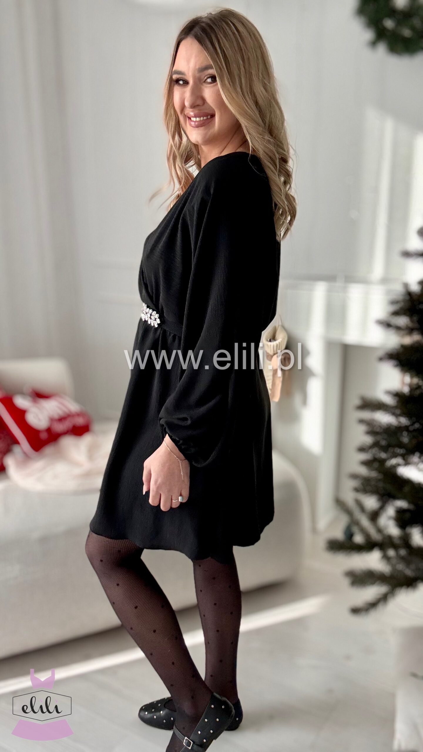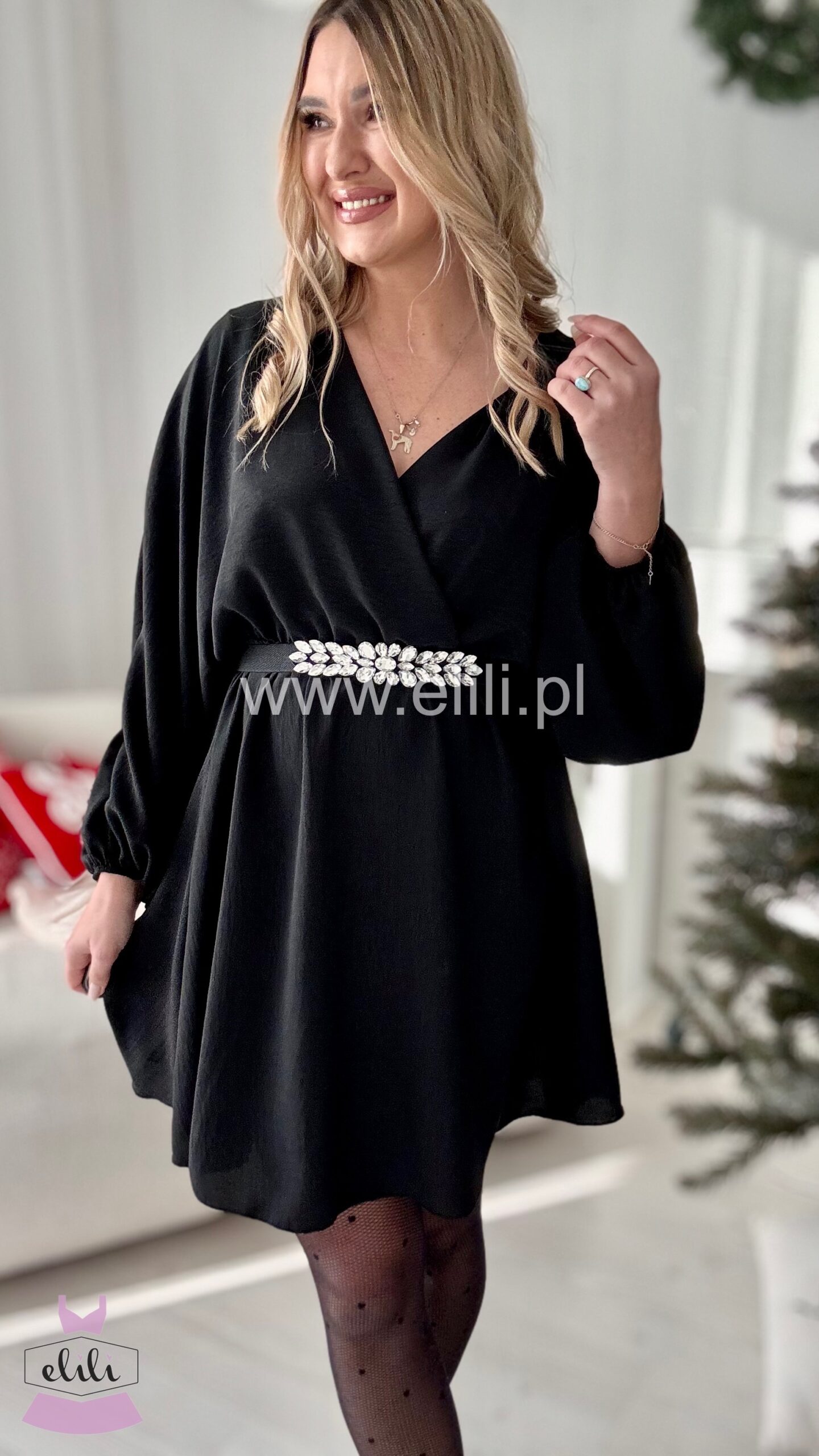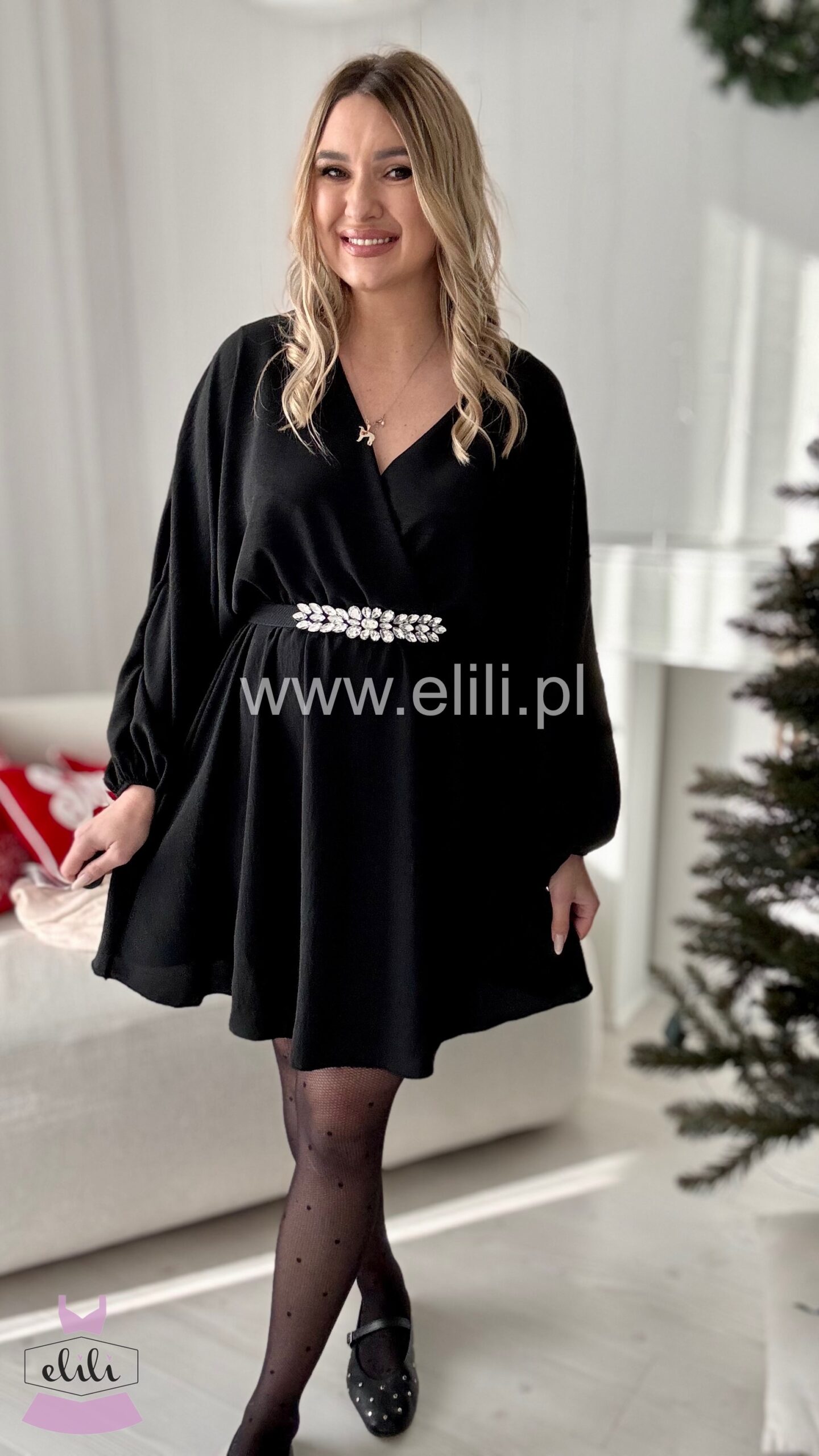 Model z kimonowymi rękawami, gumką w talii i kopertowym dekoltem.