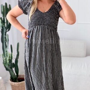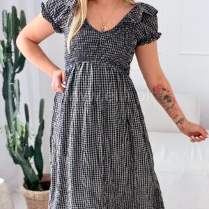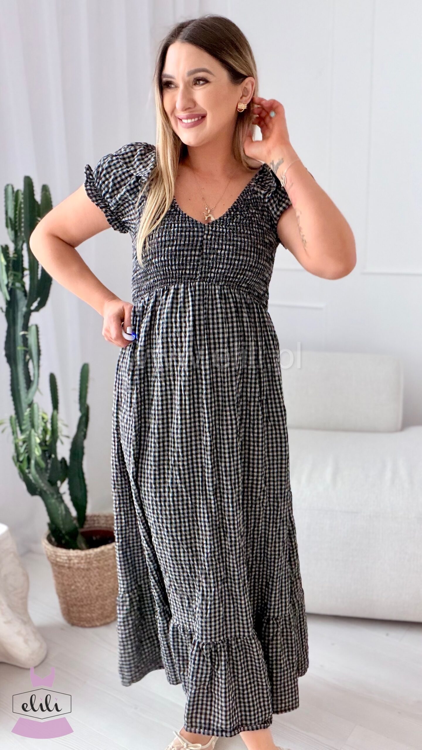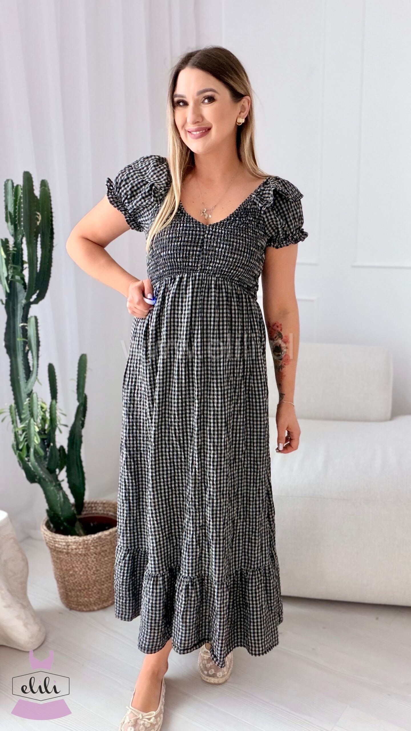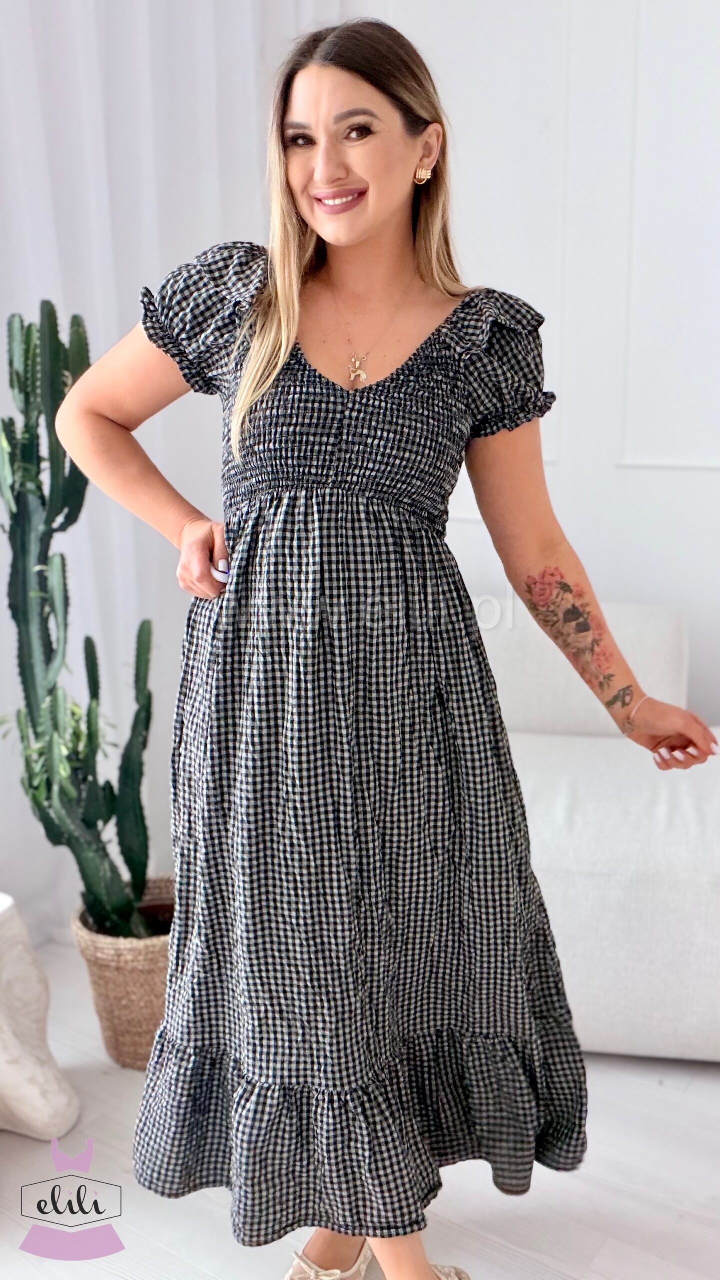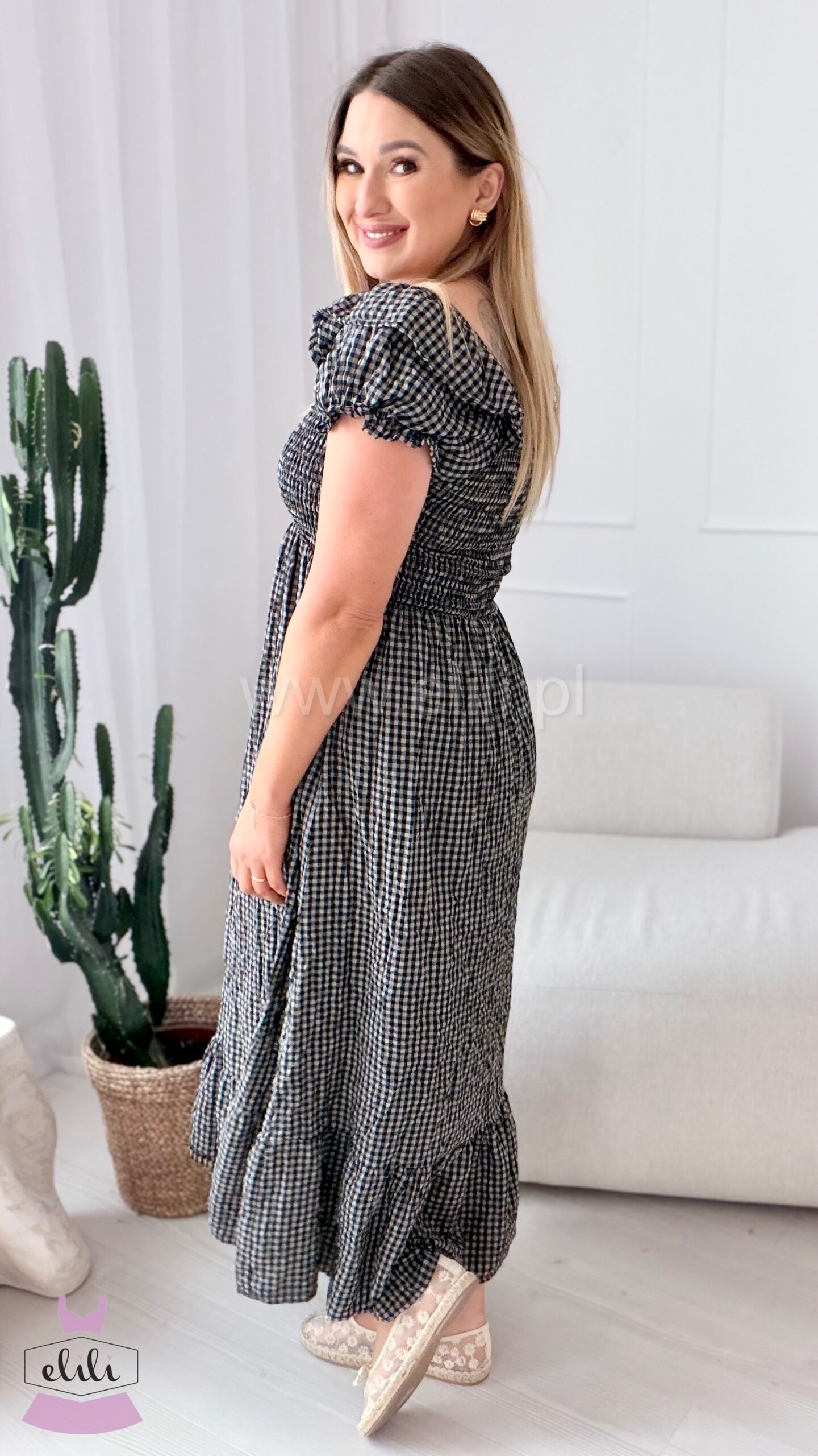 Model możesz nosić również jako hiszpankę, odsłaniając ramiona i dodając stylizacji kobiecego, letniego charakteru. Długość prawie maxi nadaje jej lekkości i elegancji, a delikatna krateczka wprowadza subtelny, modny akcent.