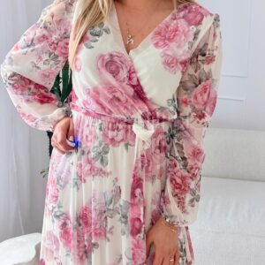 Kopertowy dekolt subtelnie podkreśla biust i optycznie wysmukla sylwetkę, a gumka w talii dopasowuje się do figury, podkreślając jej proporcje. Dodatkowy pasek do przewiązania pozwala jeszcze lepiej zaakcentować talię i nadać stylizacji indywidualnego charakteru.