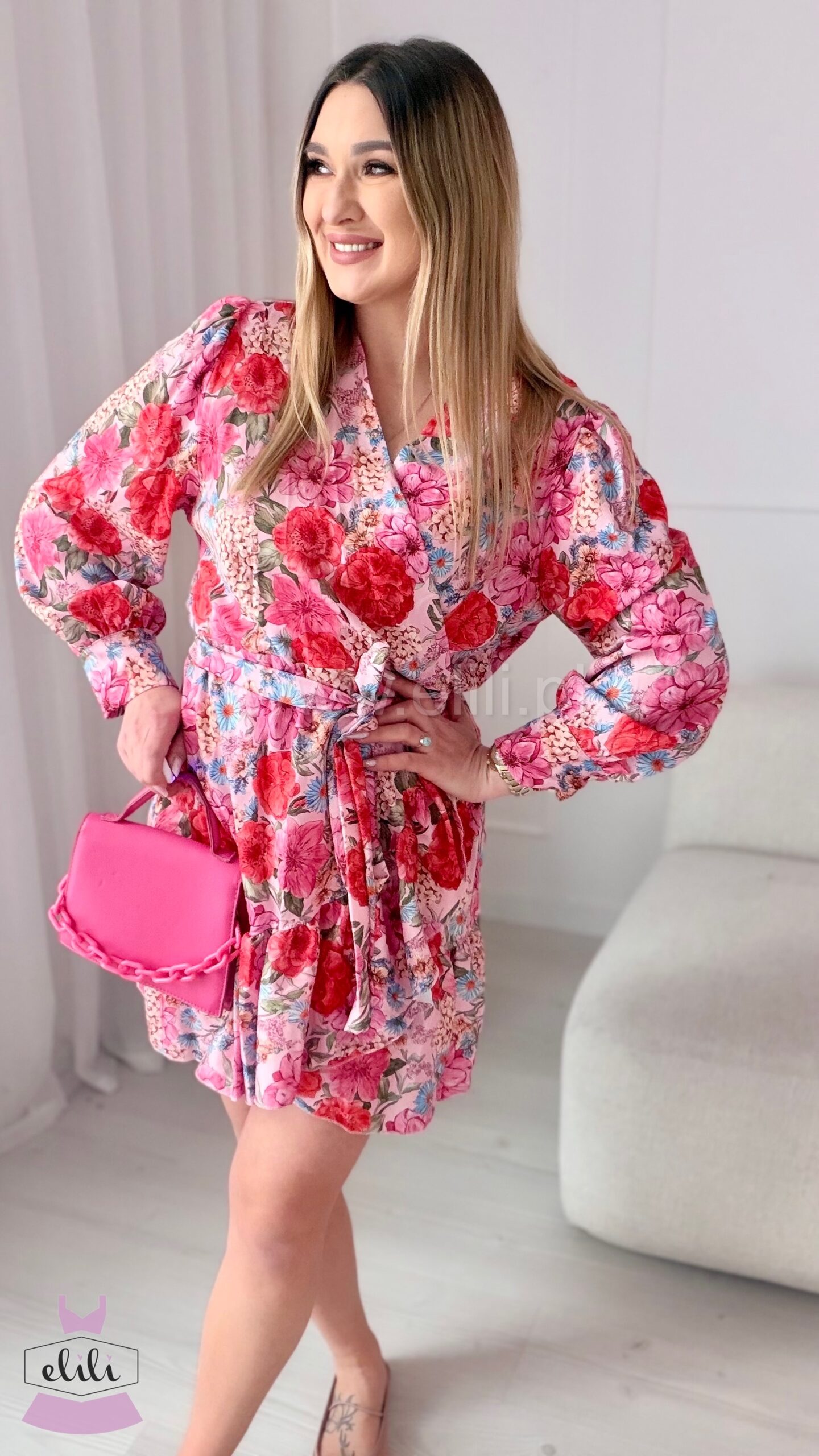 Sukienka Laura różowa w duże kwiaty