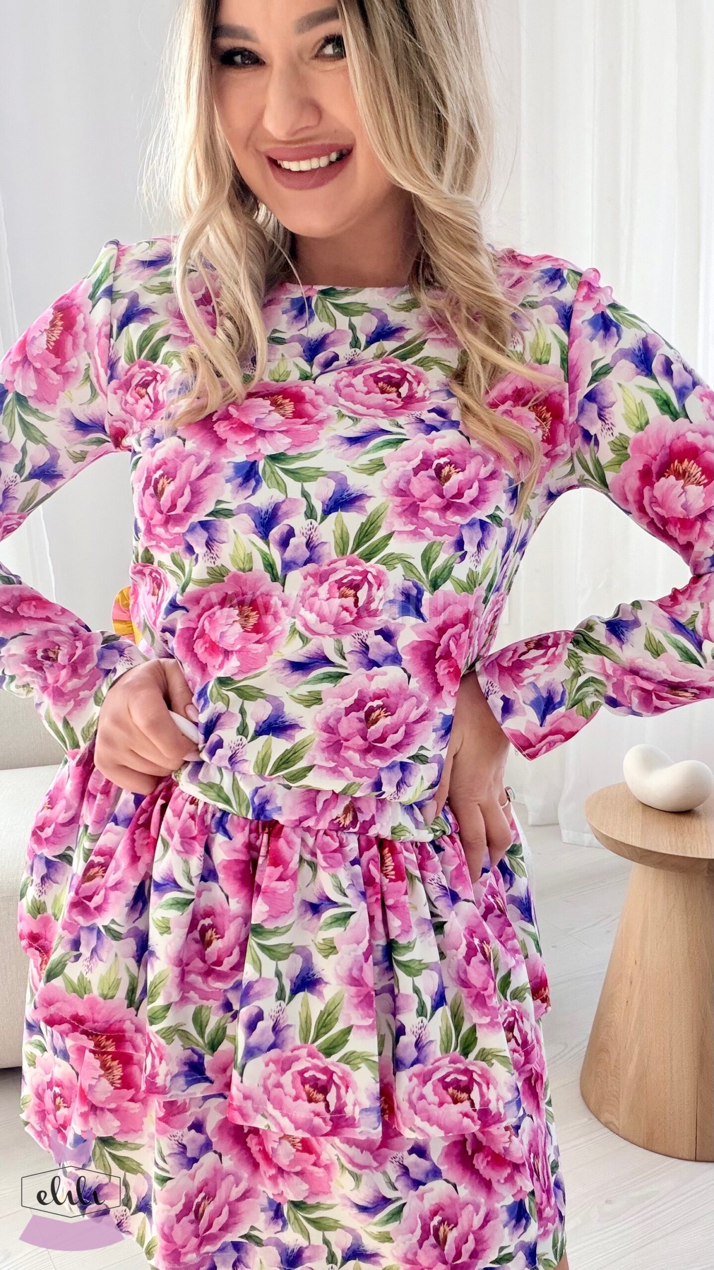 Sukienka Loe z dekoltem pod szyję beżowa w fioletowo różowe kwiaty