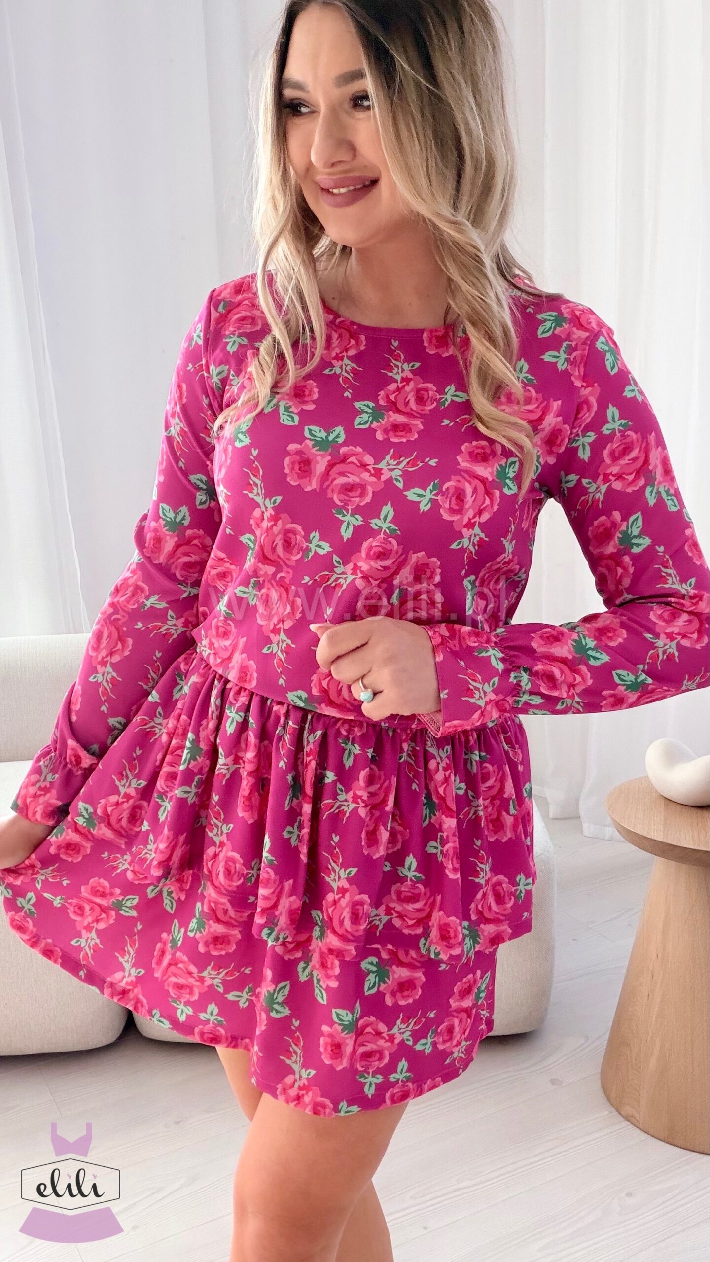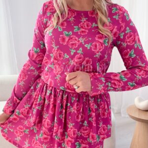 Sukienka Loe z dekoltem pod szyję fuksja w zielone kwiatuszki