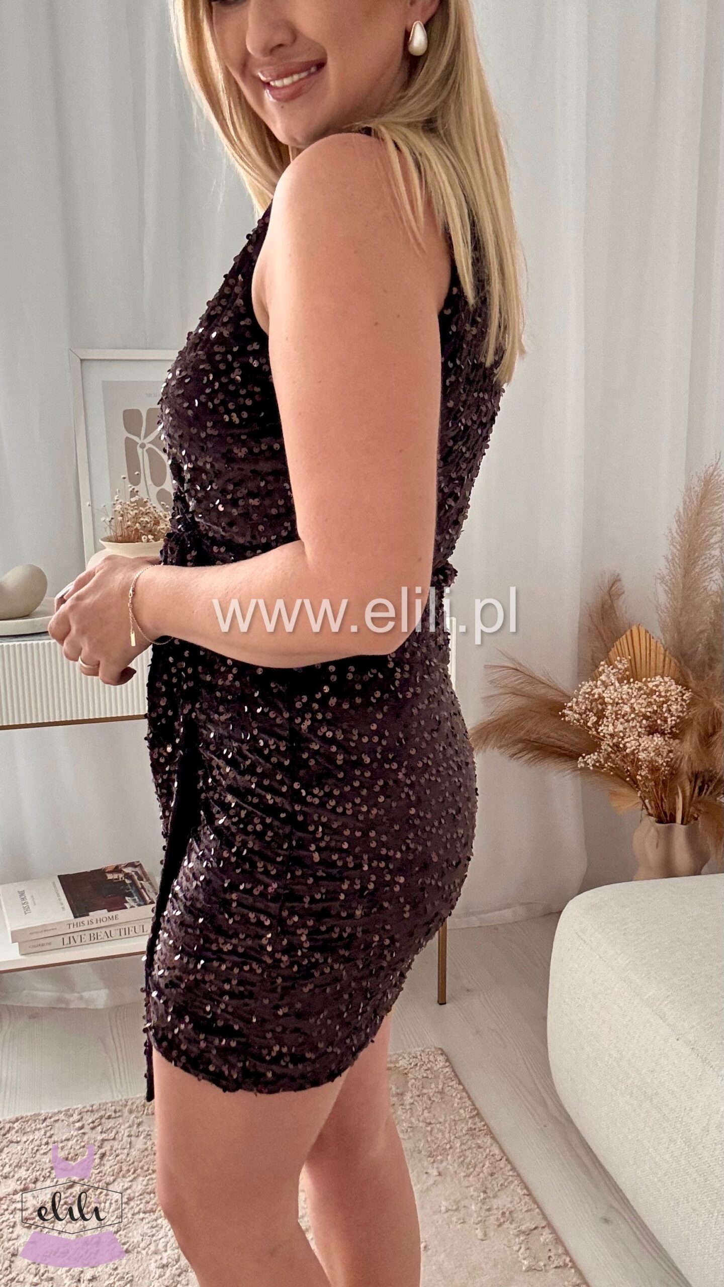Dopasowana cekinowa sukienka na wiskozowej podszewce. Z przodu posiada zakładkę która idealnie ukrywa drobne niedoskonałości. Posiada kopertowy dekolt i gumkę w talii