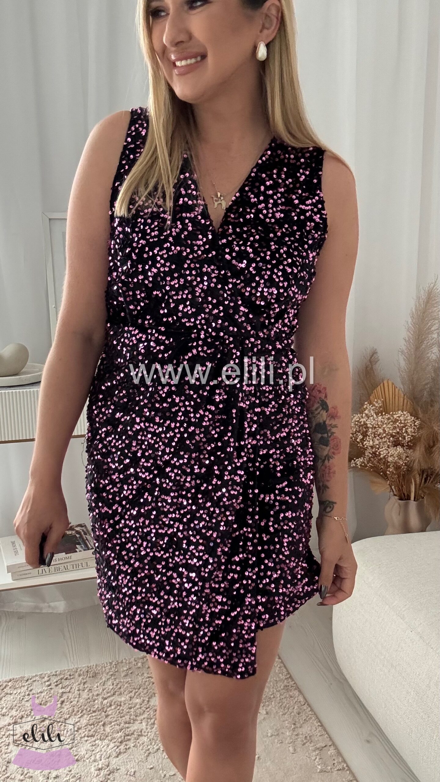 Dopasowana cekinowa sukienka na wiskozowej podszewce. Z przodu posiada zakładkę która idealnie ukrywa drobne niedoskonałości. Posiada kopertowy dekolt i gumkę w talii