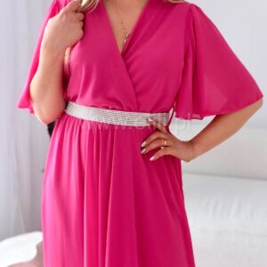Kopertowy dekolt subtelnie podkreśla biust i wysmukla górną część sylwetki, a gumka w talii gwarantuje idealne dopasowanie oraz podkreślenie kobiecych proporcji. Dopełnieniem całości jest elegancki pasek zdobiony cyrkoniami, który dodaje stylizacji blasku i wyjątkowego charakteru.