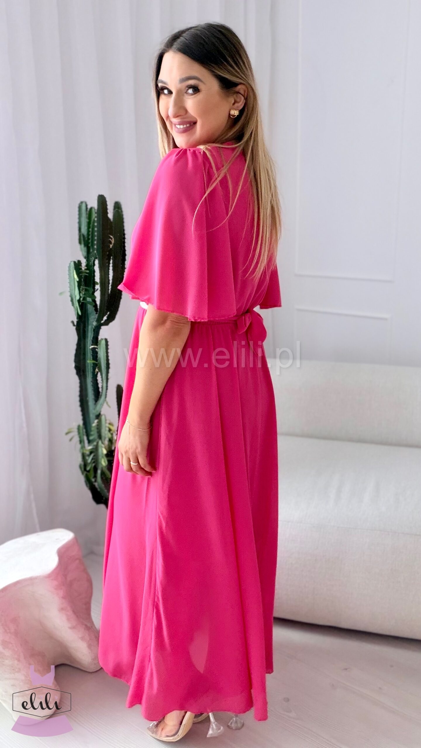 Lekki rękaw typu motylek nadaje sukience zwiewności i romantycznego wyrazu, a długość maxi sprawia, że model prezentuje się niezwykle szykownie.