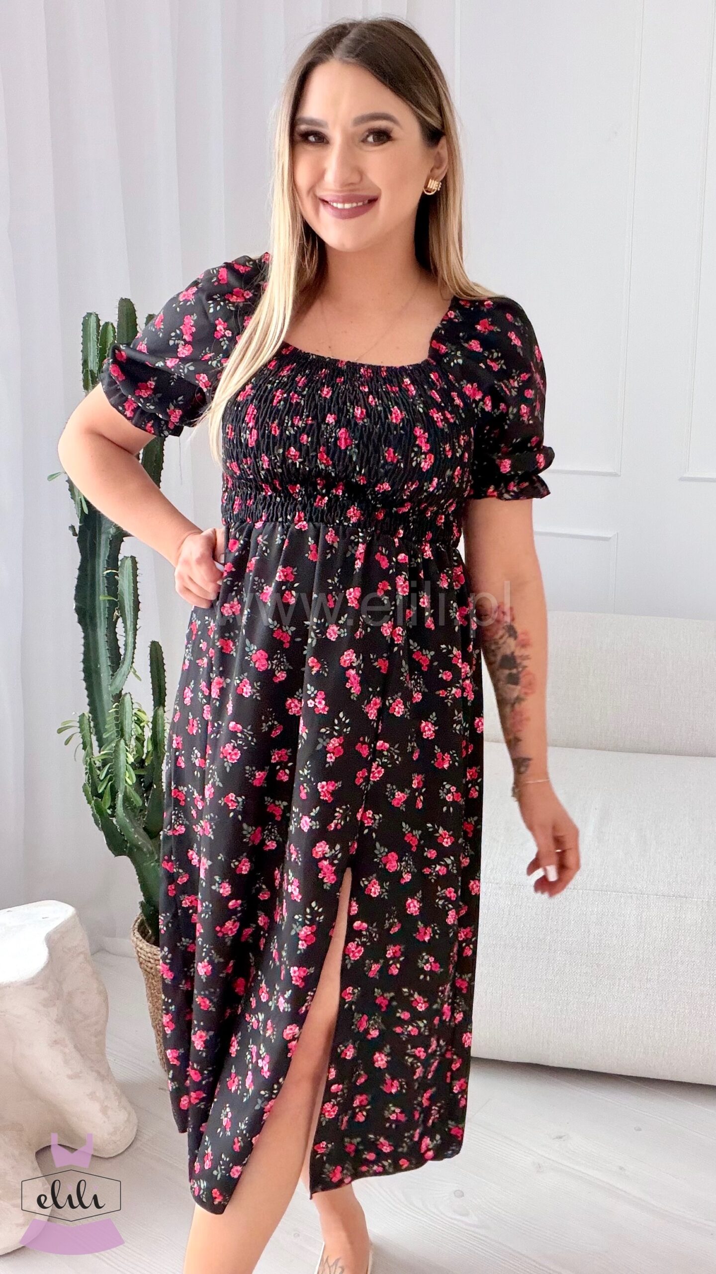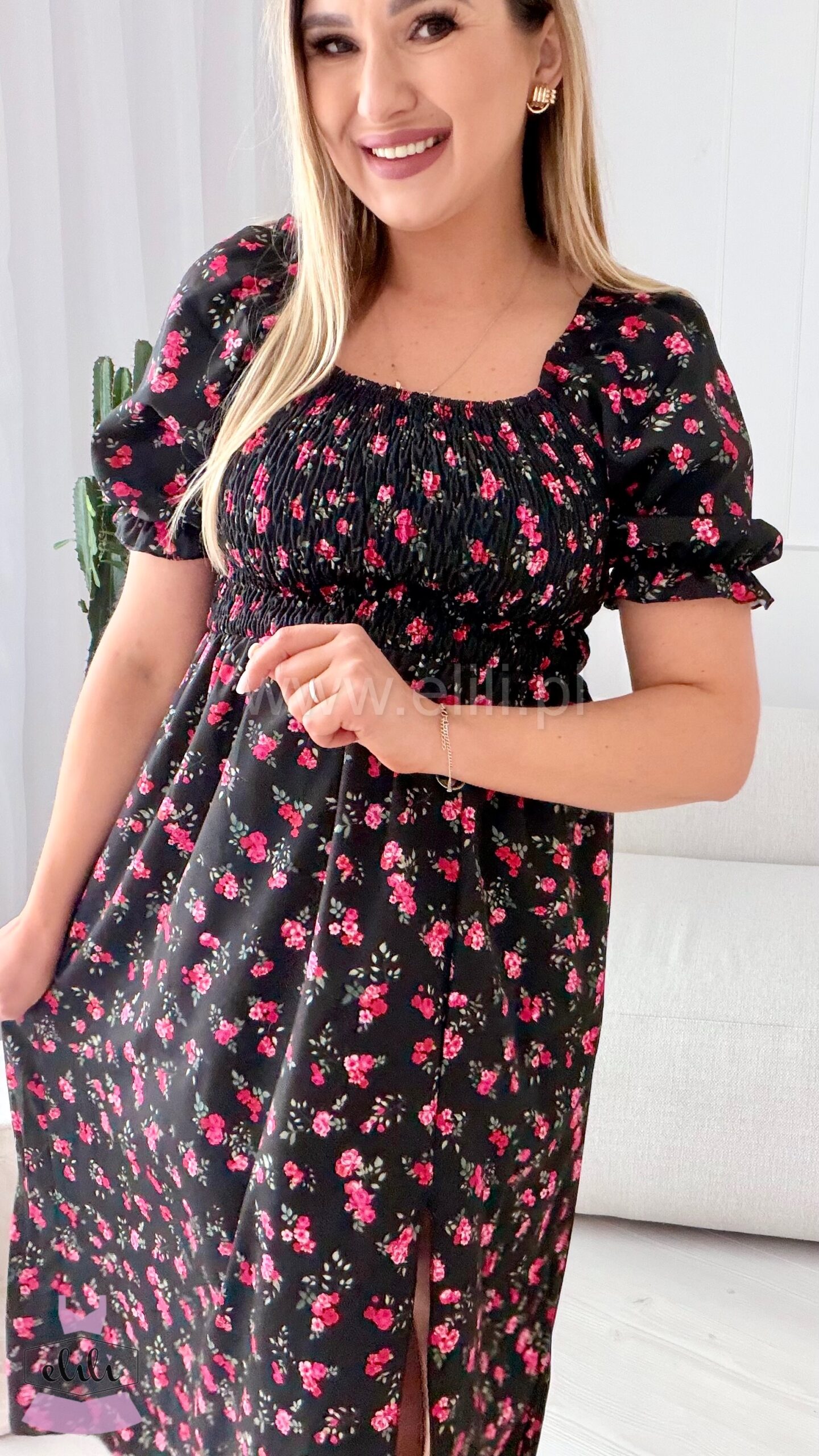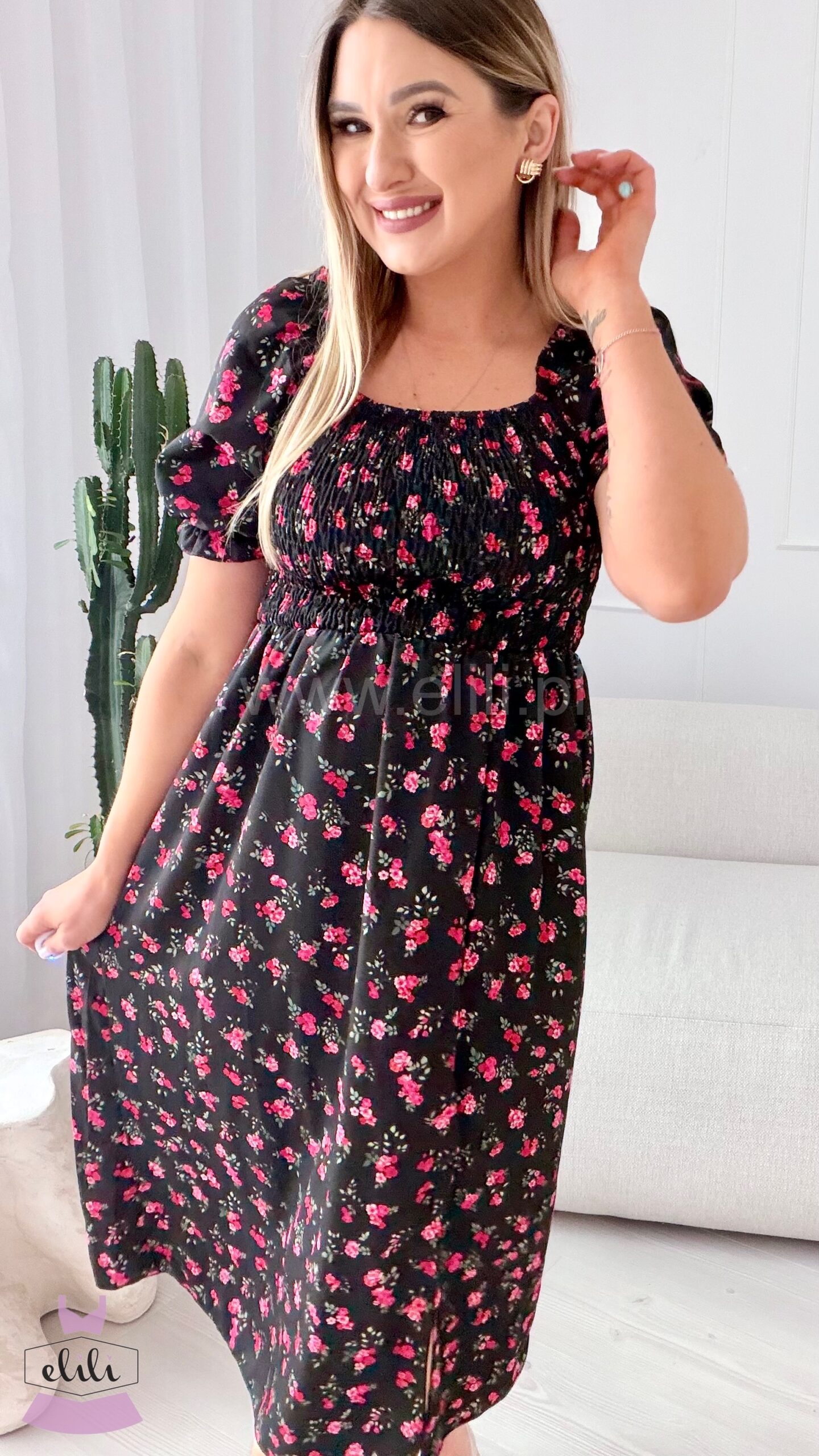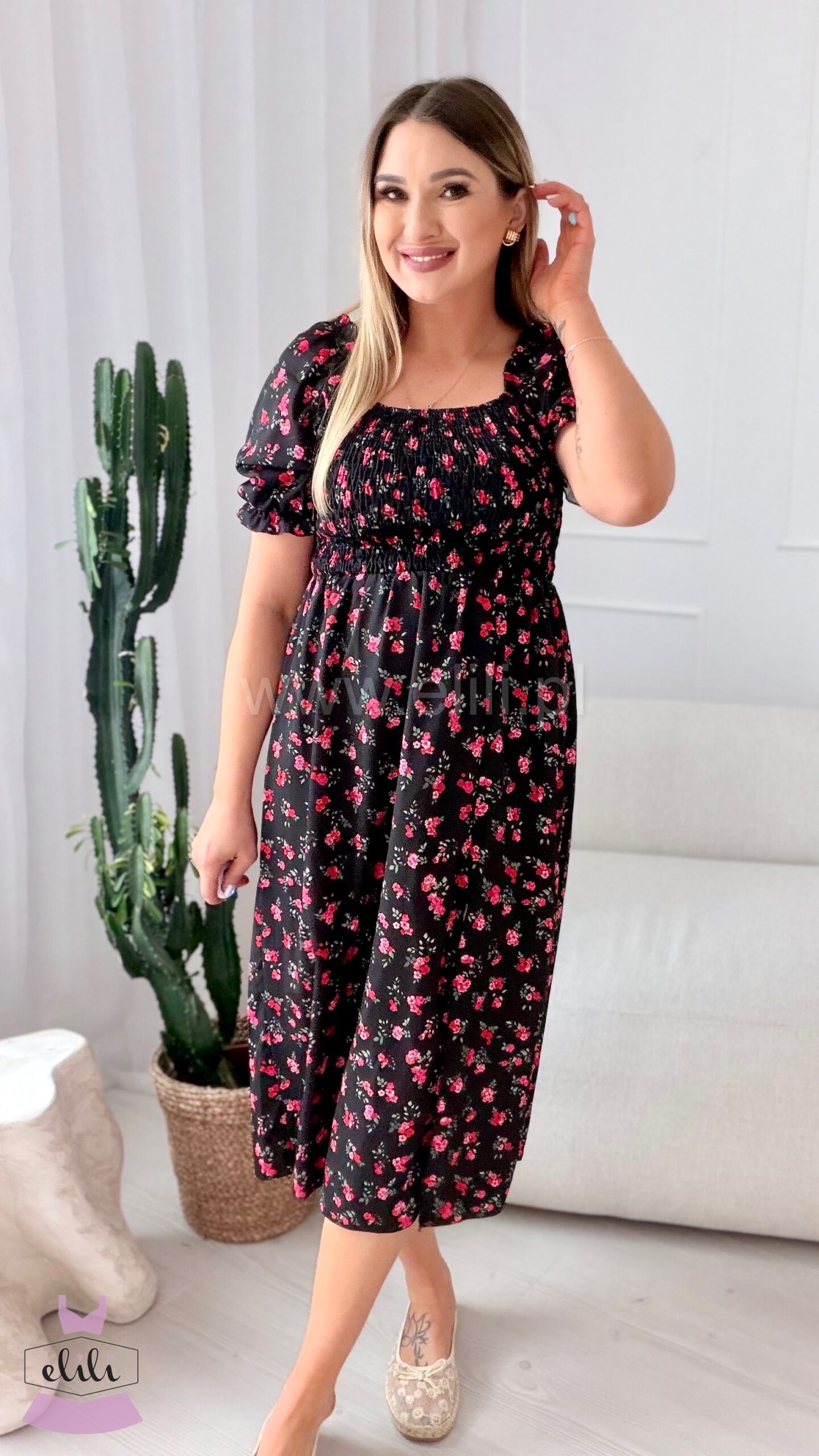 Sukienka Milano midi czarna w wiśniowe kwiatuszki