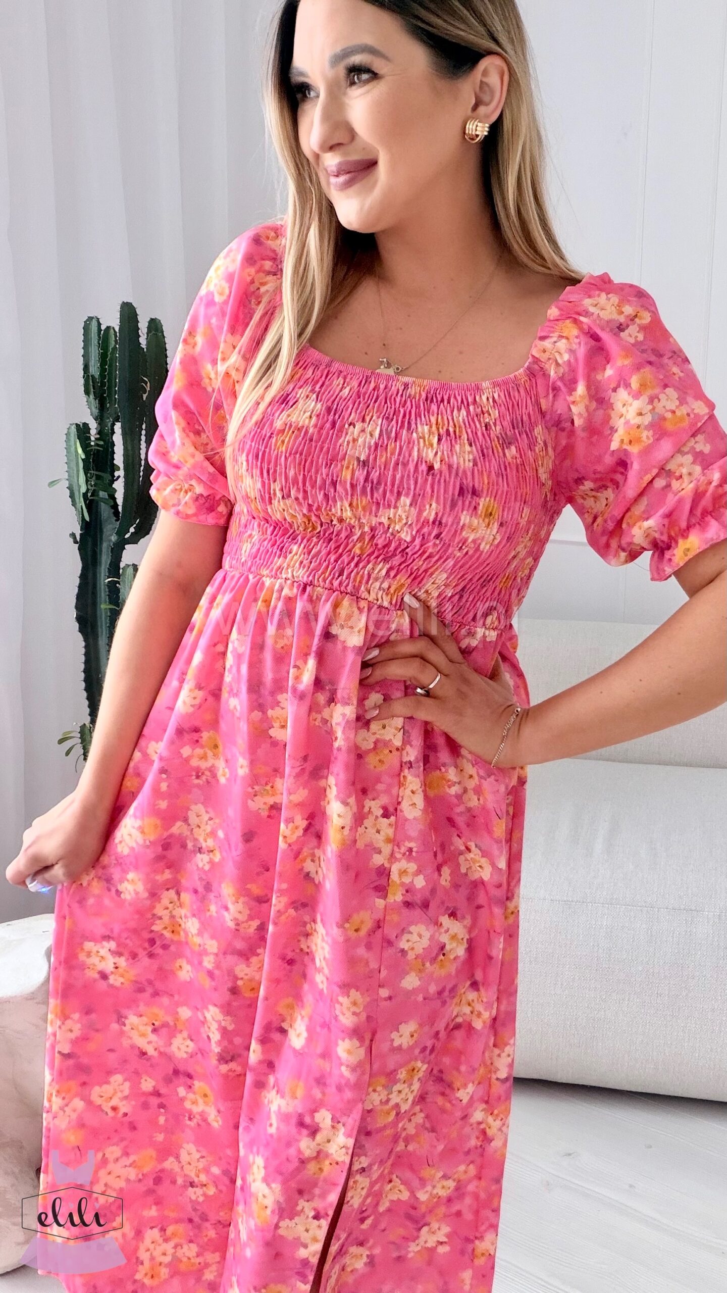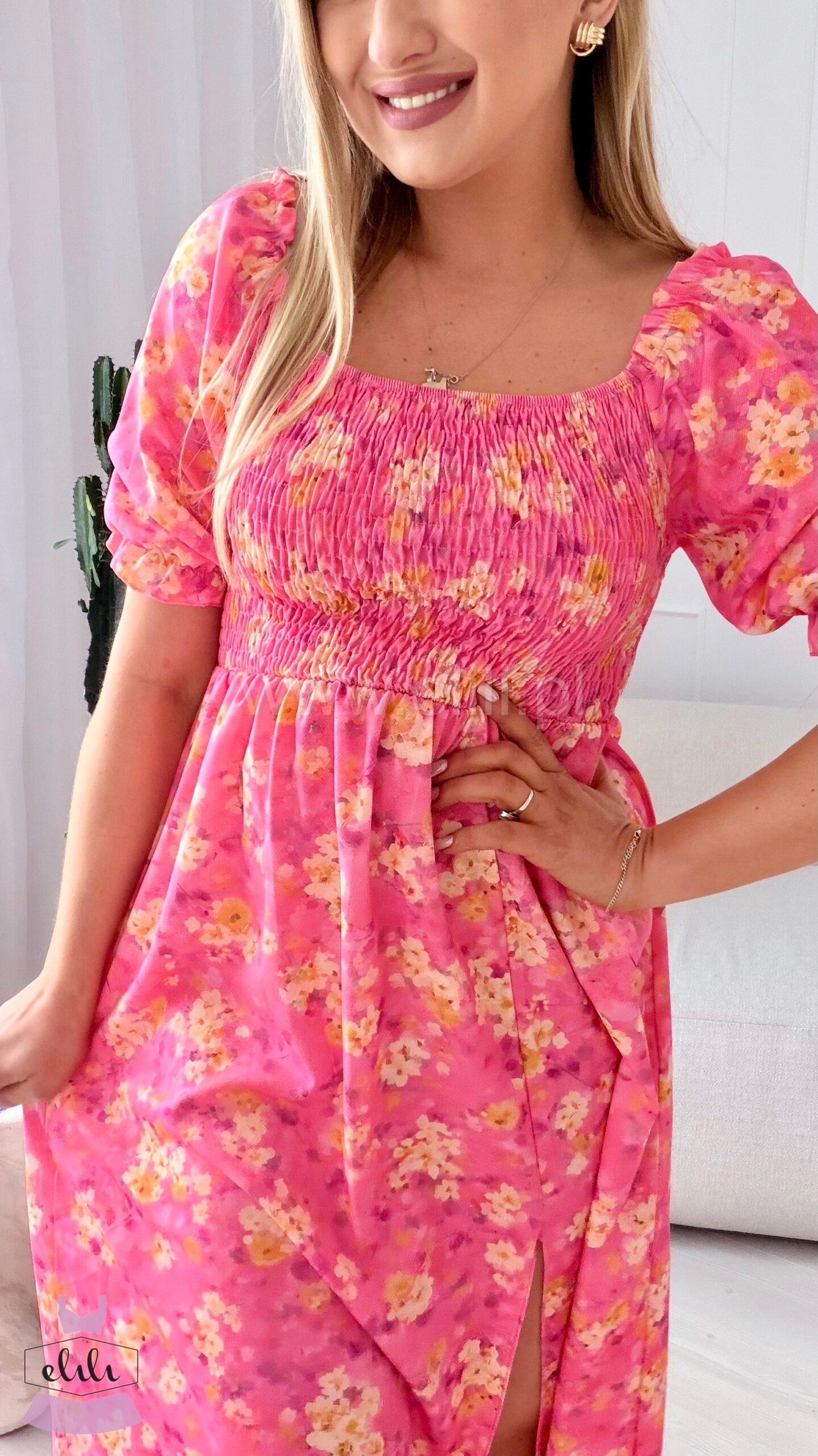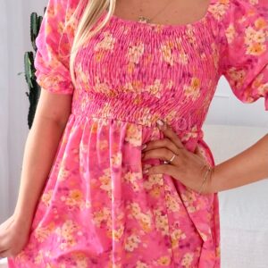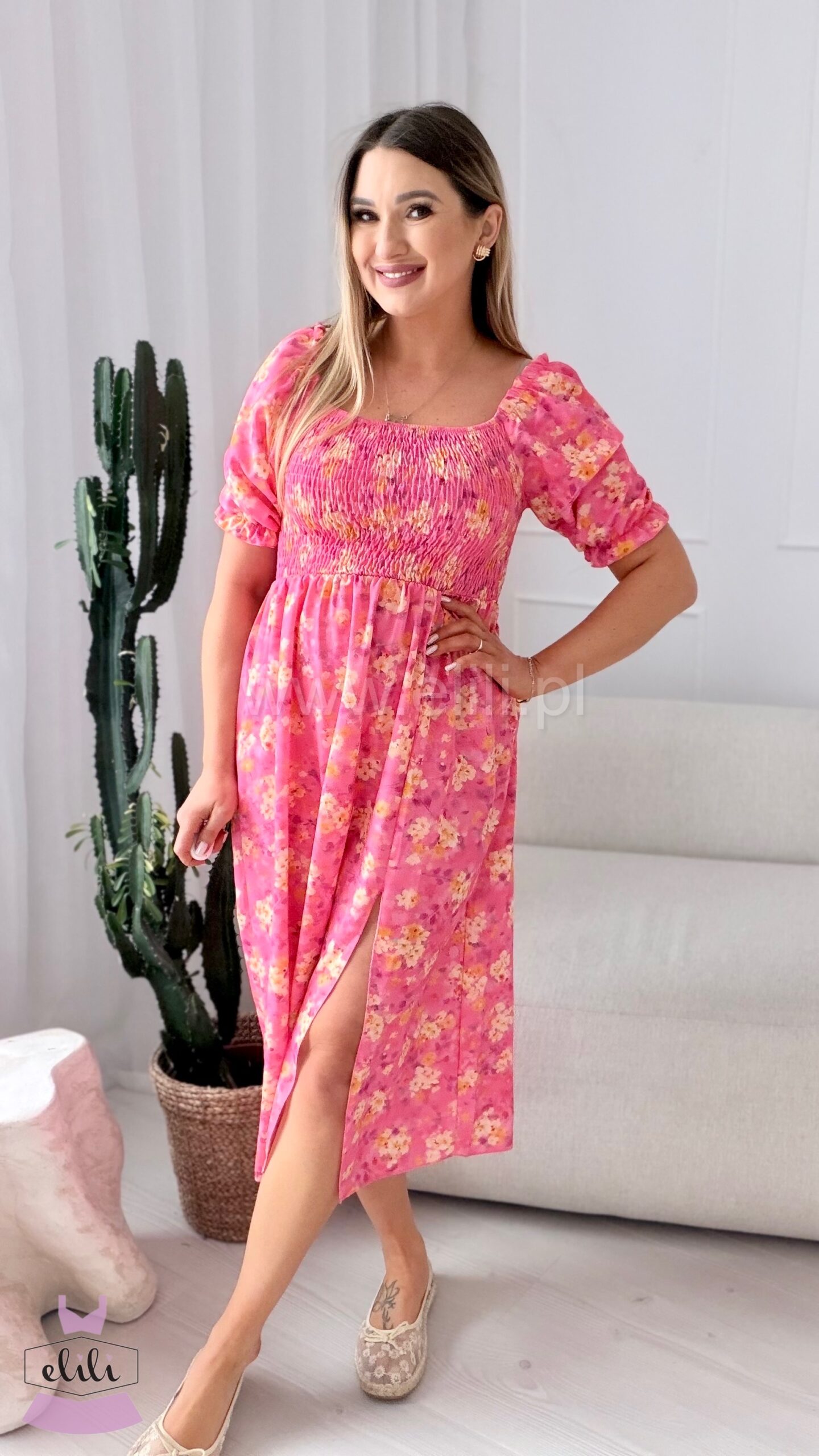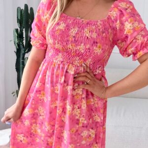 Sukienka Milano midi różowa w żółte kwiaty