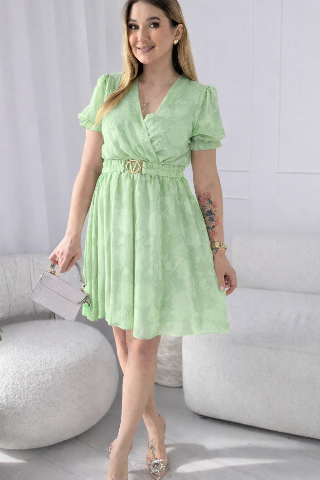 Subtelna, elegancka i niezwykle wygodna. Sukienka Nadia zachwyca tłoczonymi kwiatami, które nadają jej wyjątkowej faktury i romantycznego charakteru. Kopertowy dekolt pięknie podkreśla sylwetkę, a gumka w talii dopasowuje się do figury, zapewniając komfort noszenia. Dodatkowy pasek pozwala jeszcze bardziej zaakcentować talię i stworzyć idealne proporcje
