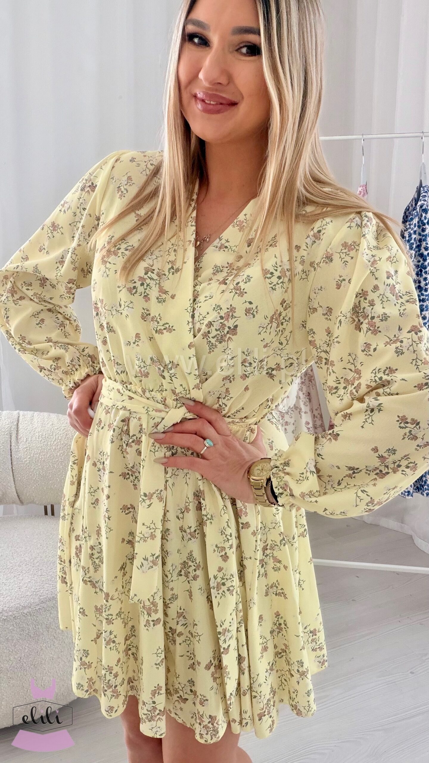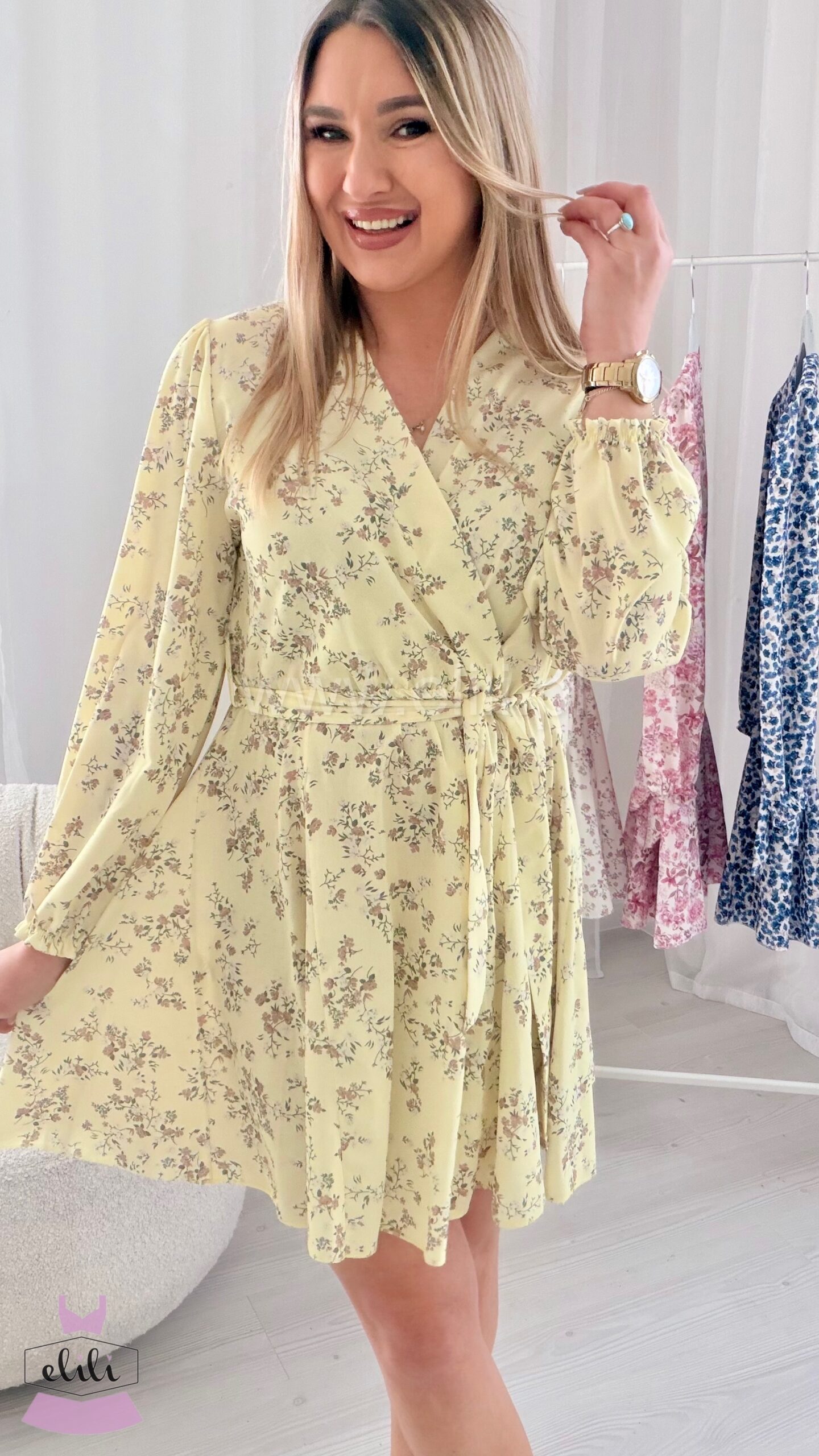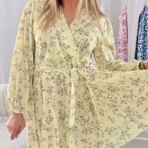 Klasyczny kobiecy model. Sukienka z kopertowym dekoltem oraz gumka w talii przewiązywany paskiem. Dół sukienki uszyty na kole oraz posiada wszyte dodatkowe trójkąty z materiału dzięki czemu przepięknie sie układa.