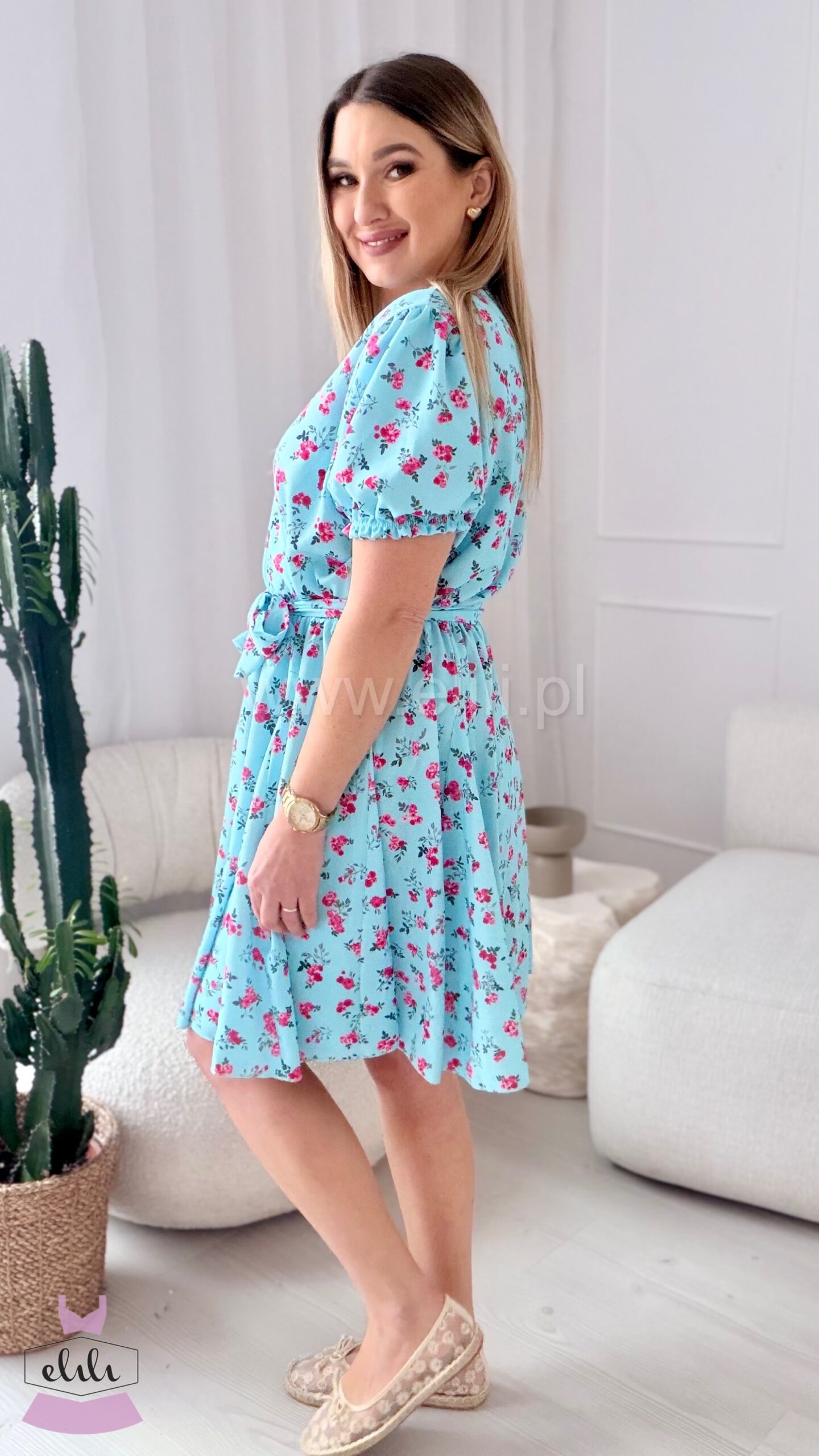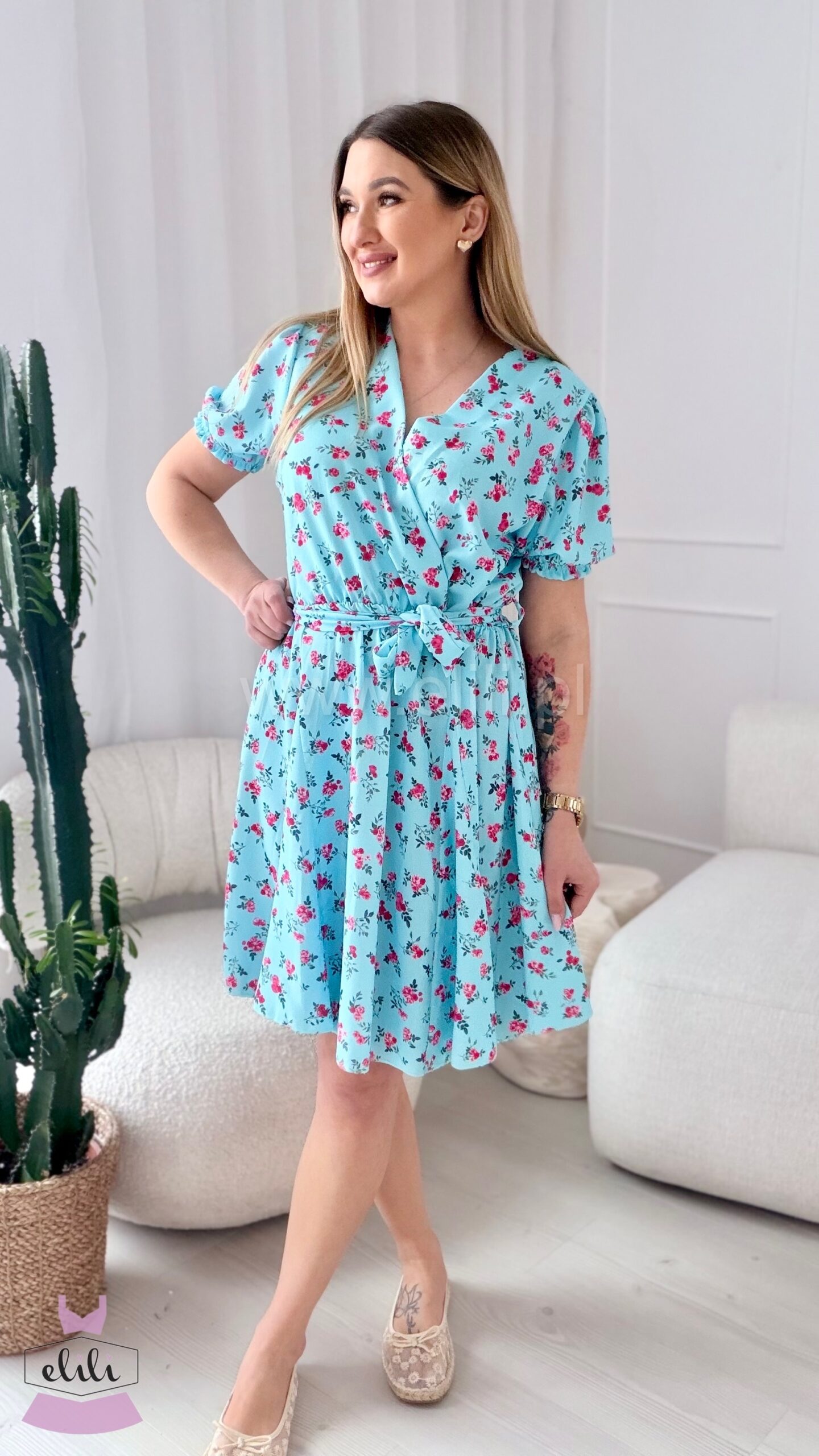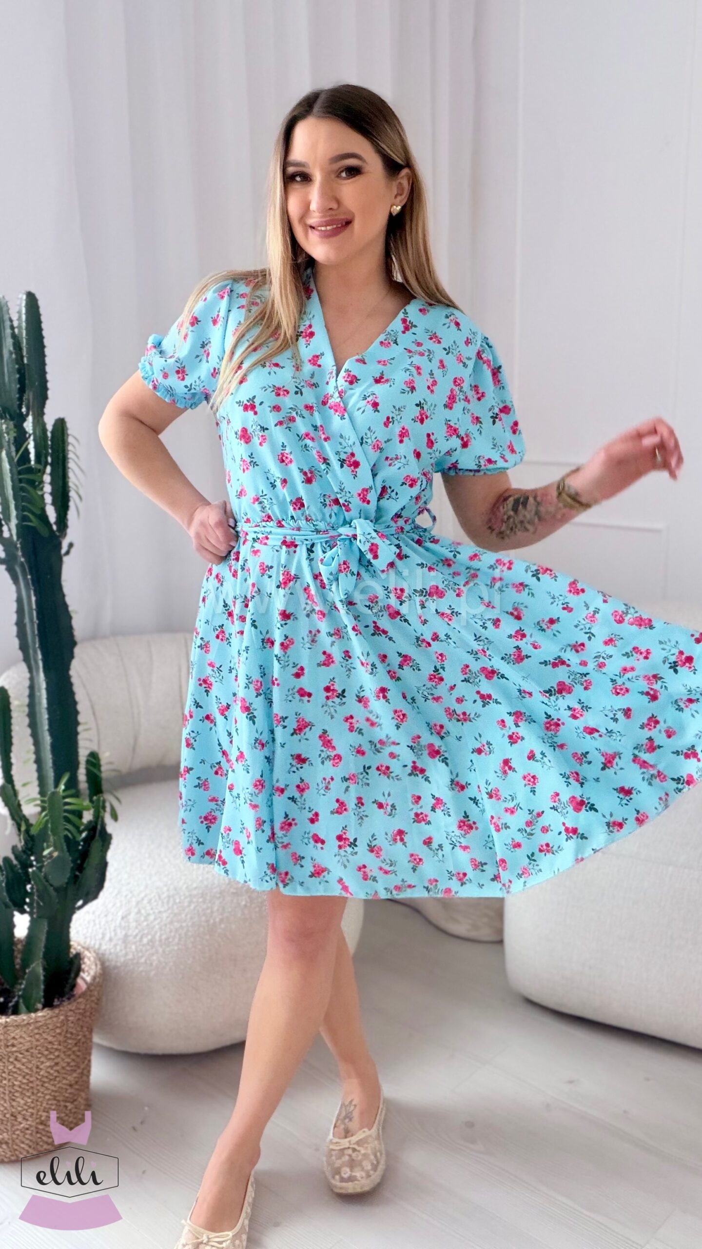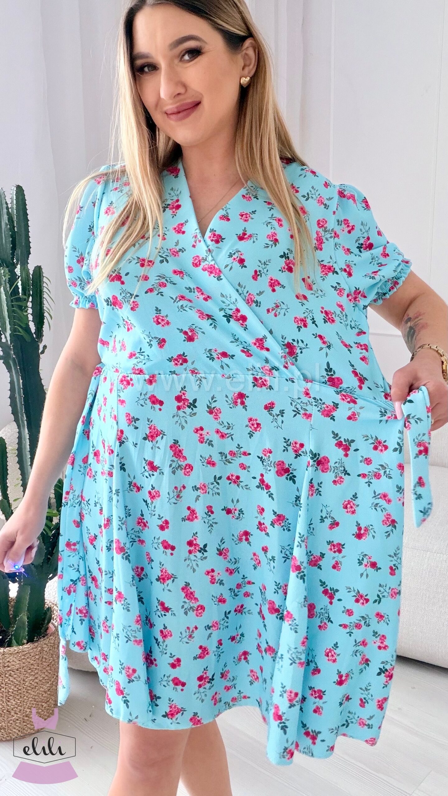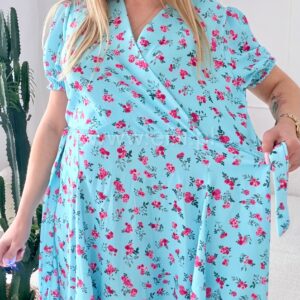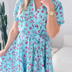 Sukienka Oliwia plus size błękitna w czerwone kwiatki