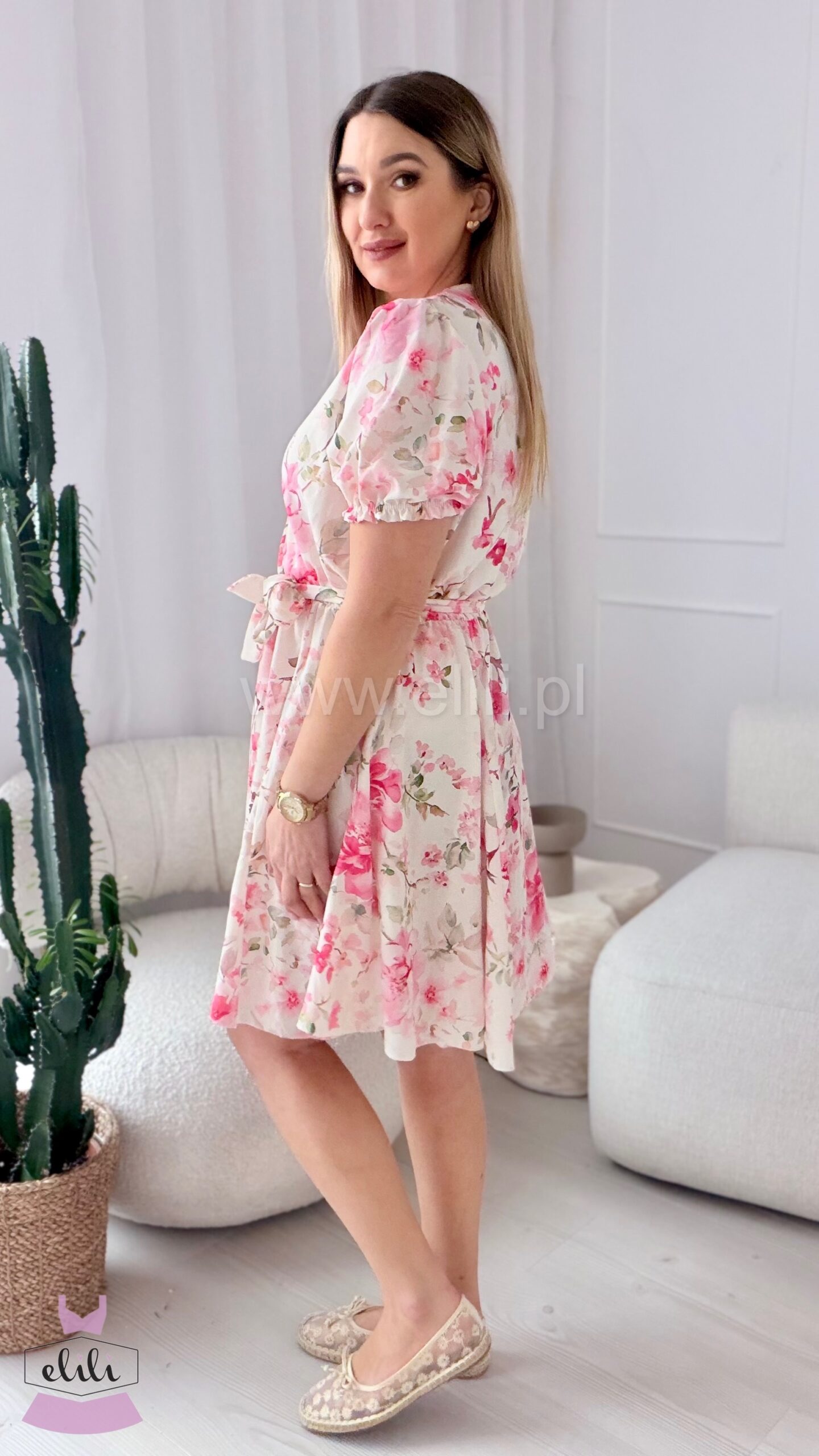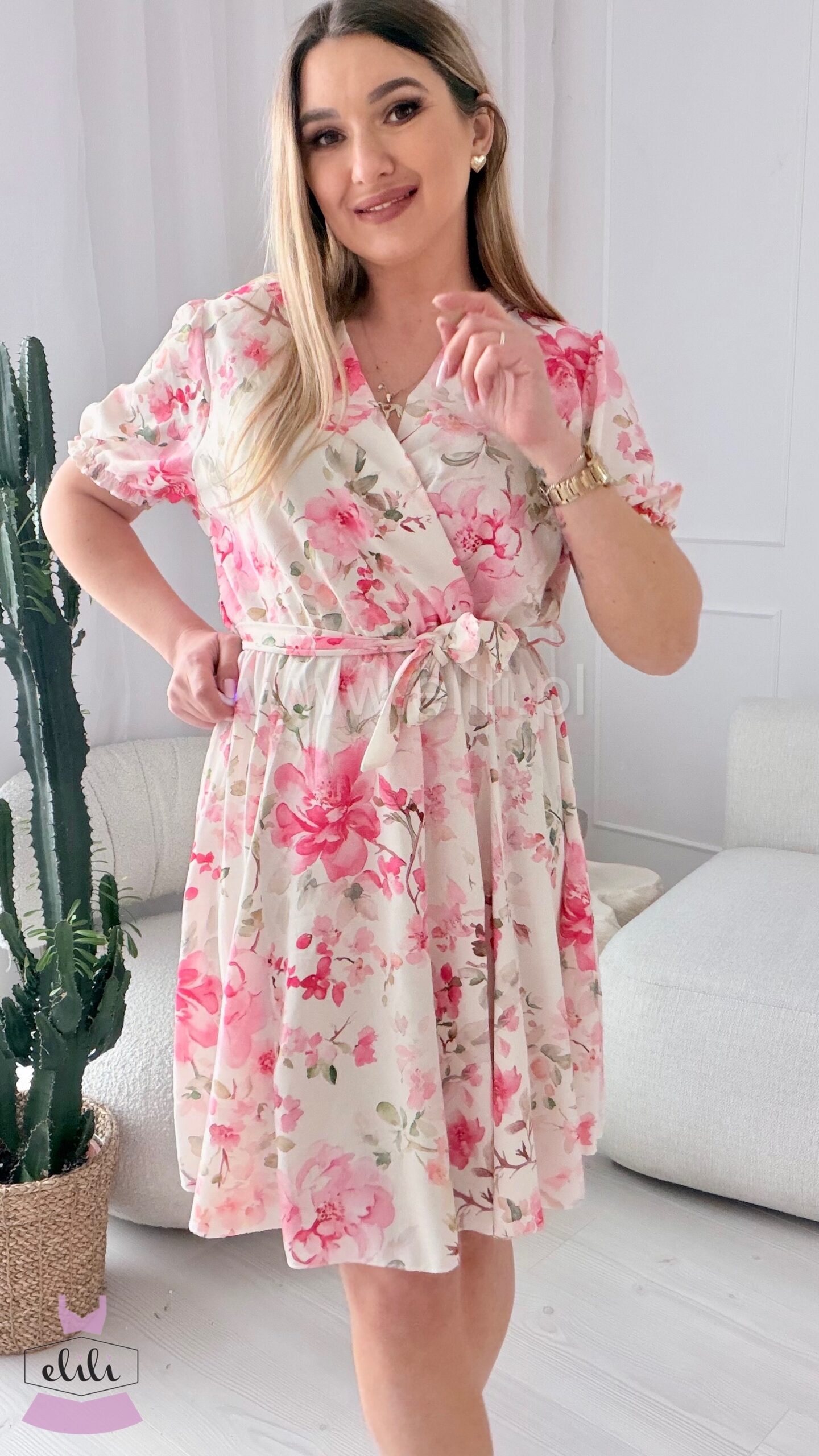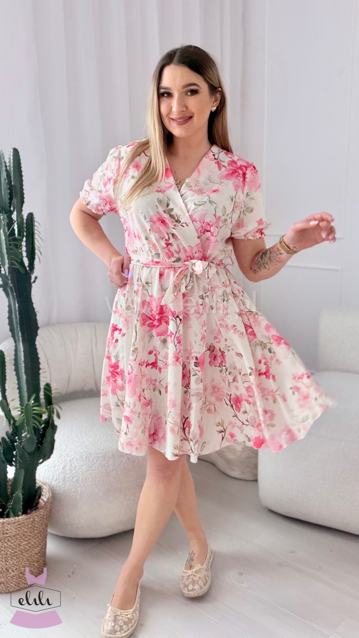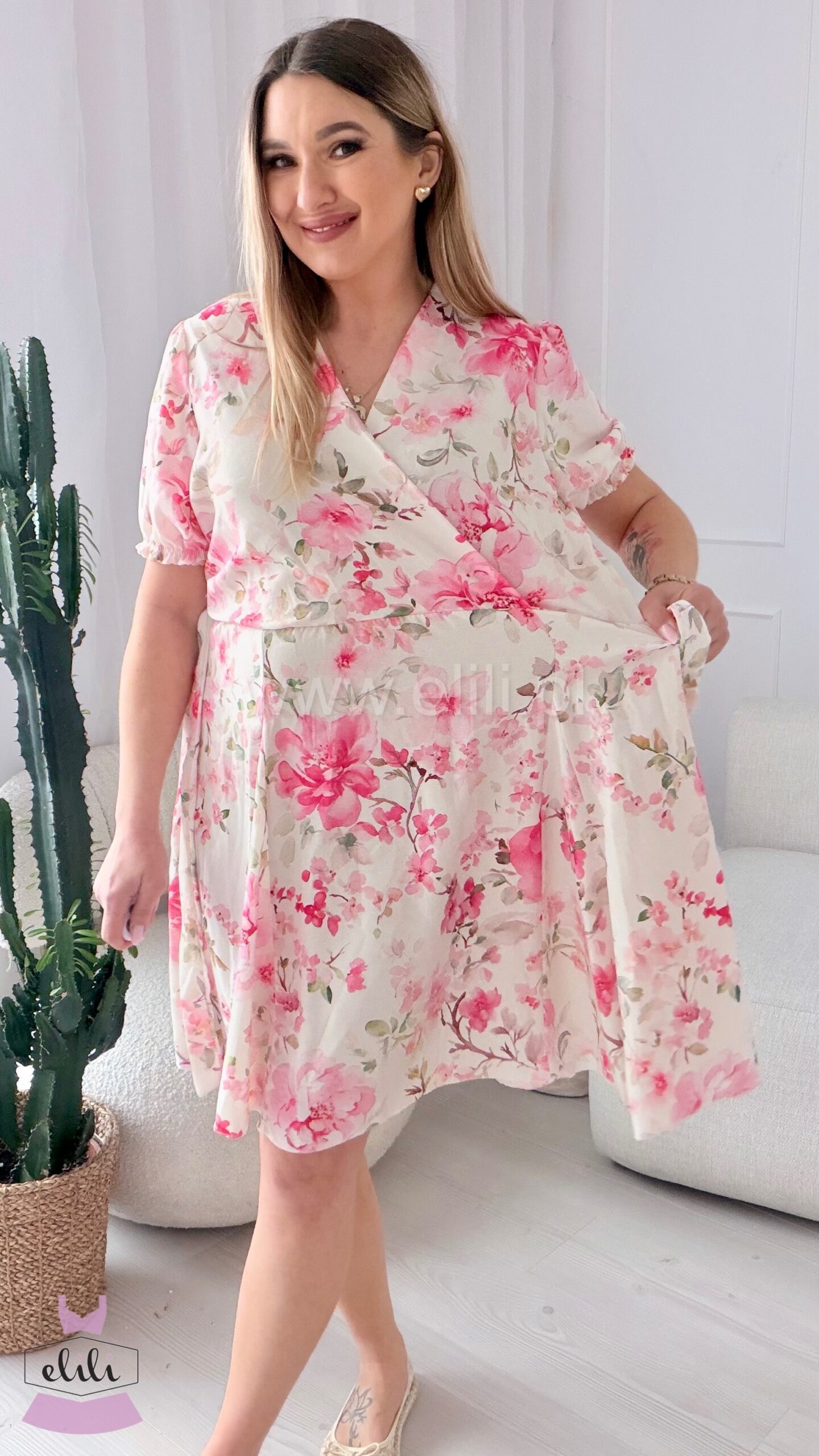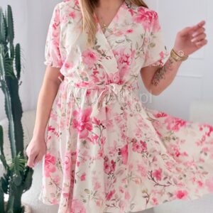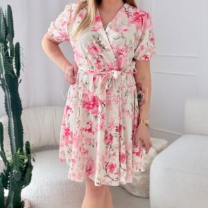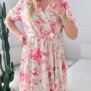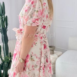 Sukienka Oliwia plus size ecru w różowe kwiaty