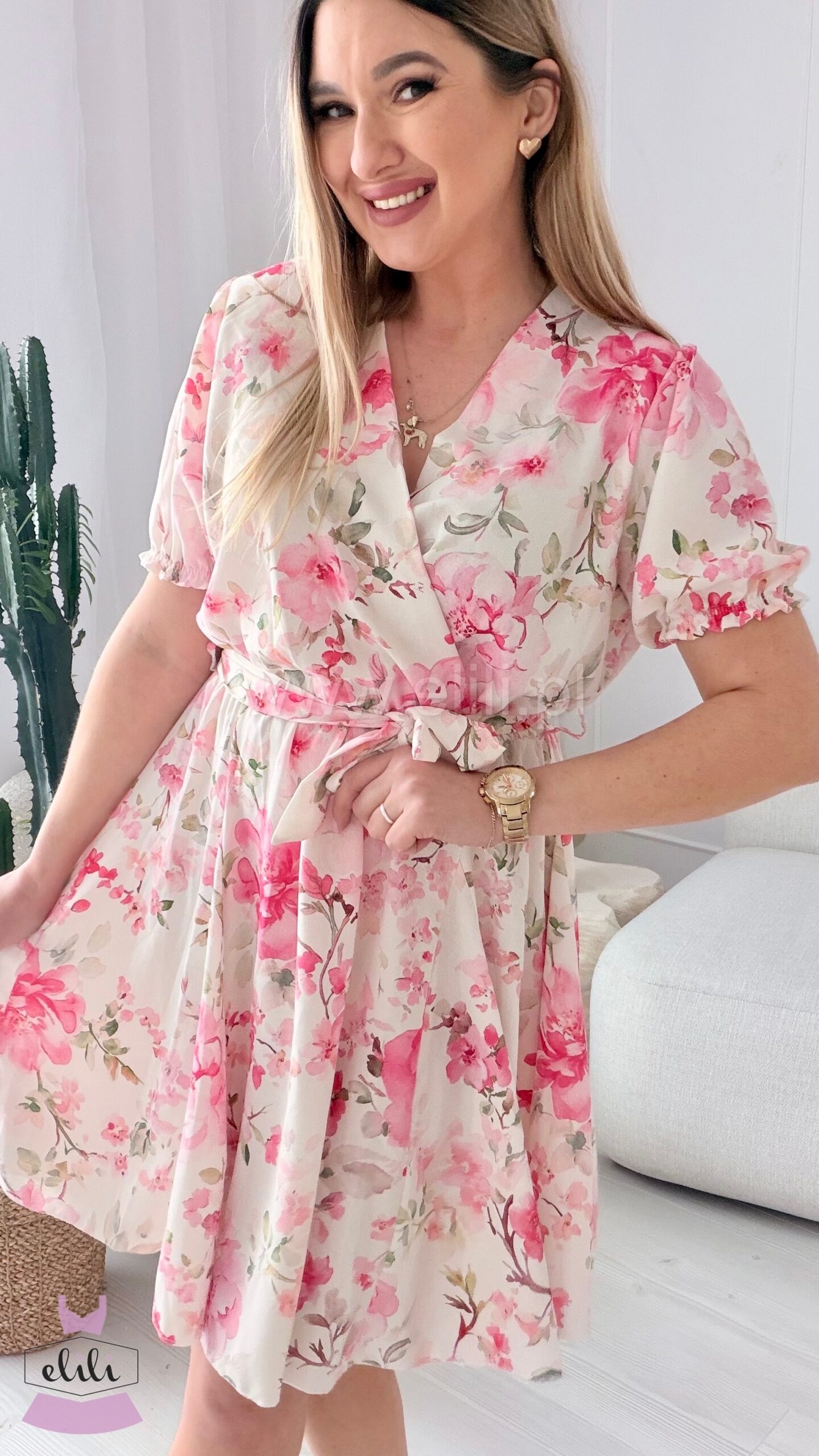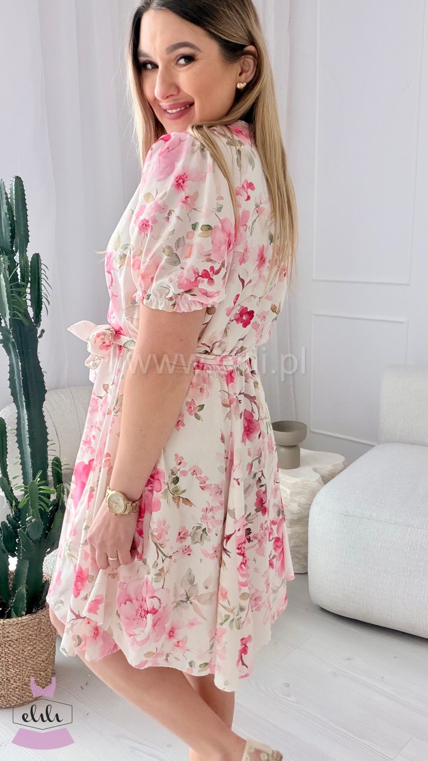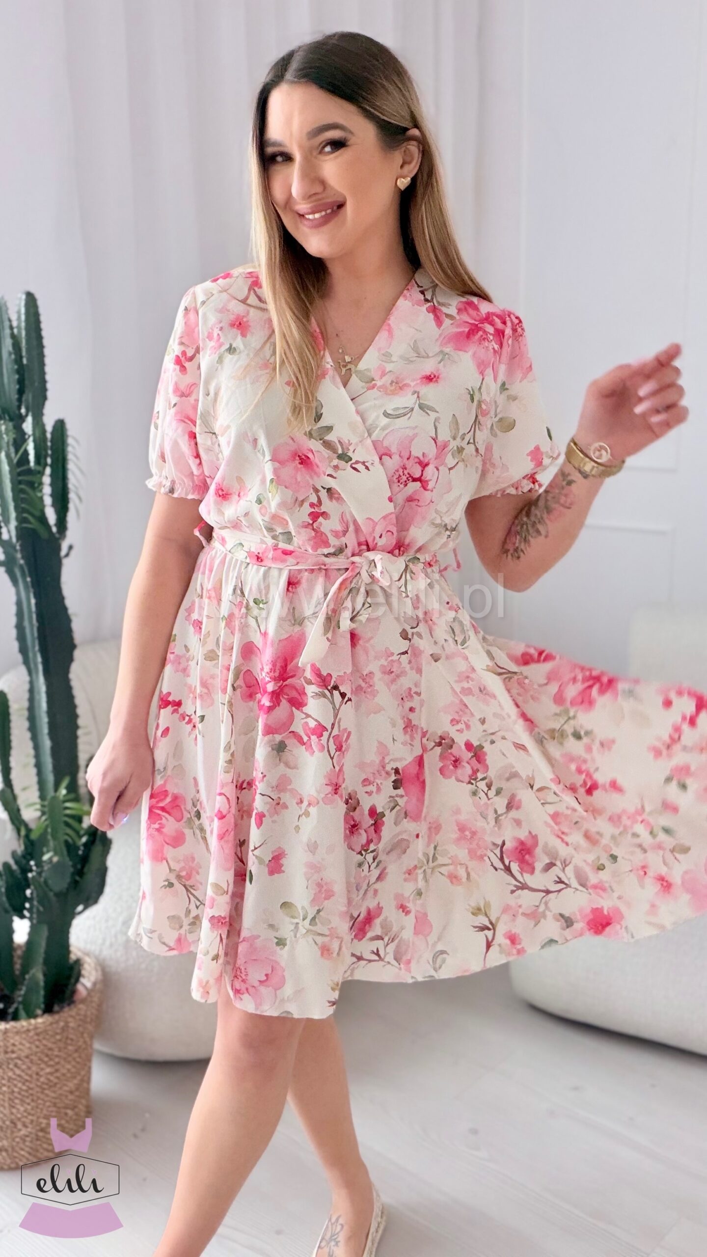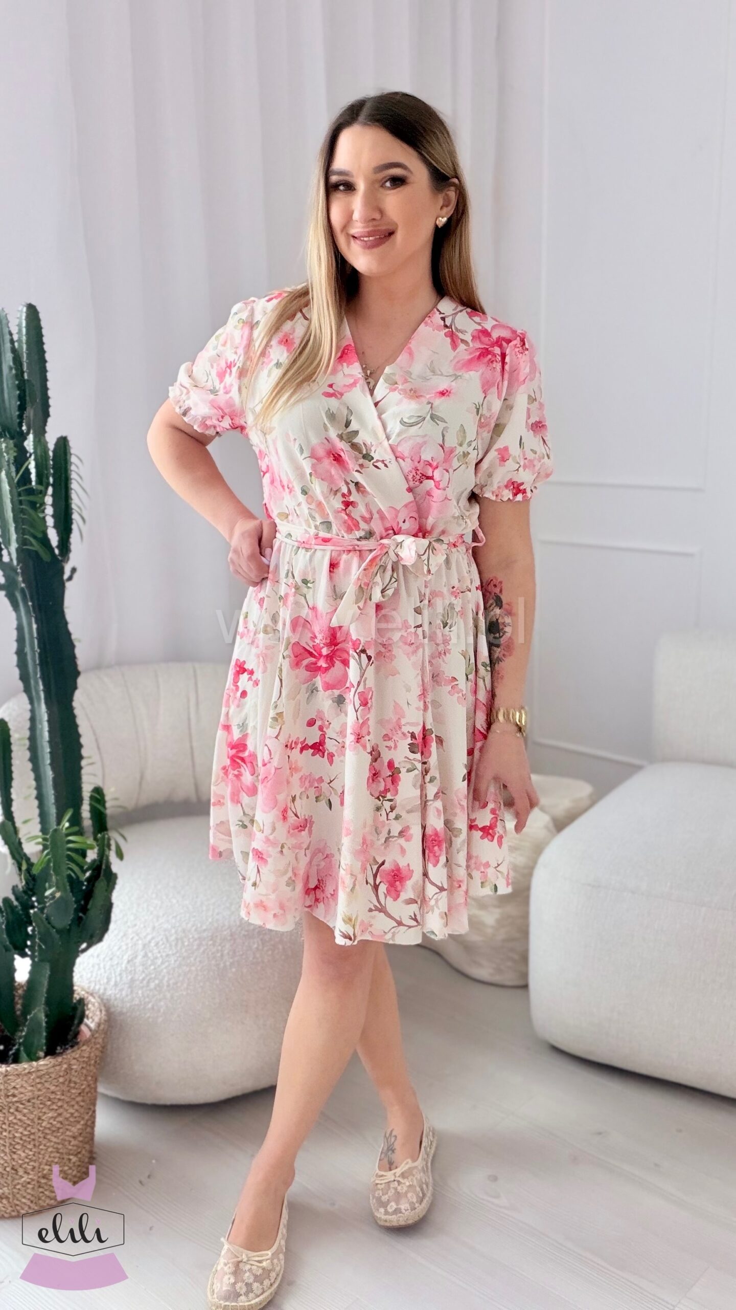 Sukienka Oliwia plus size ecru w różowe kwiaty