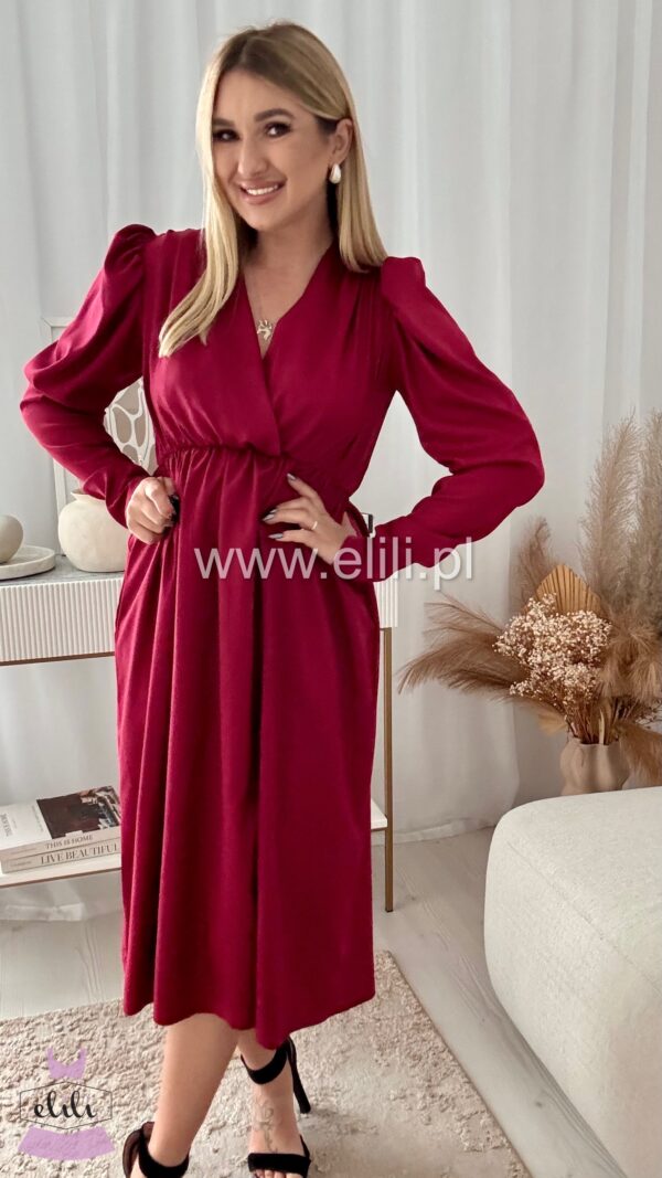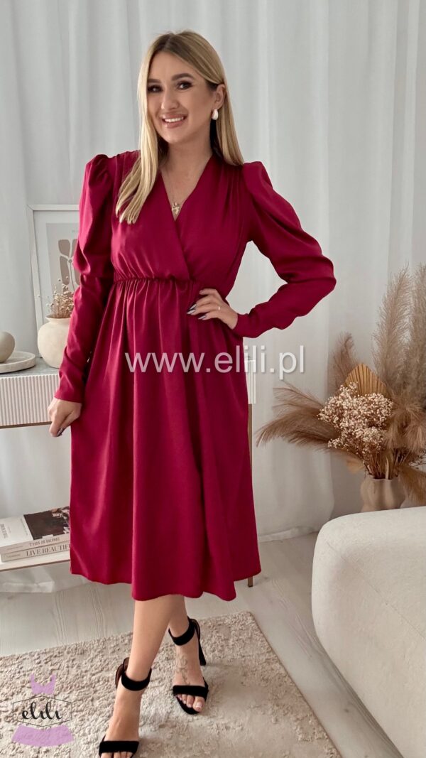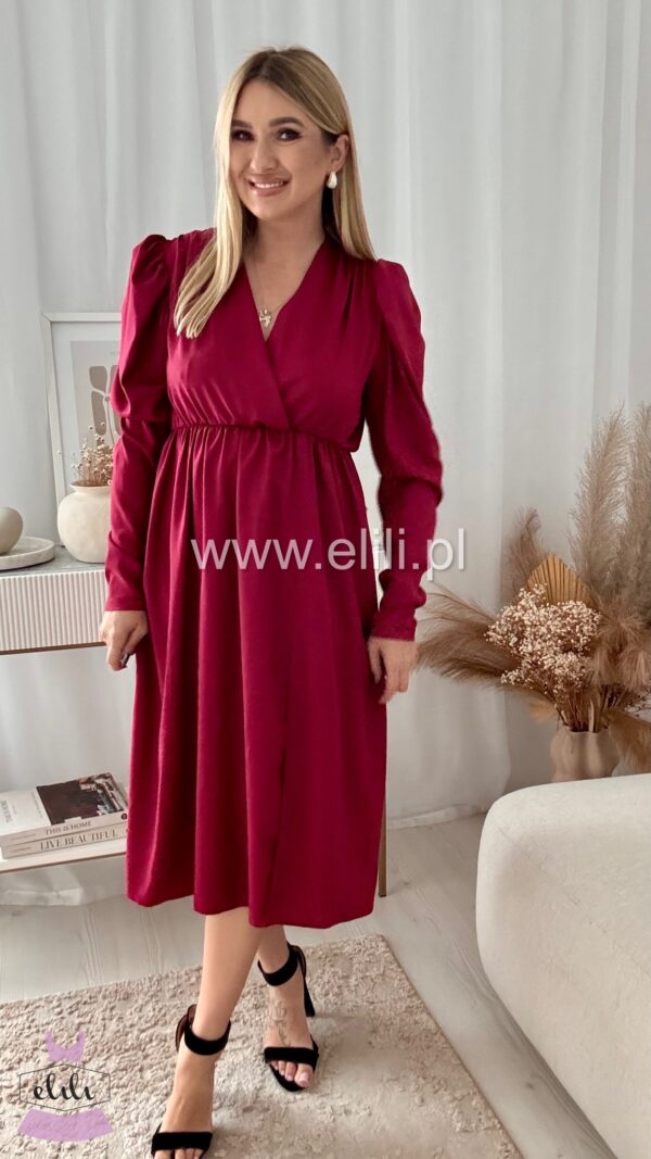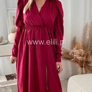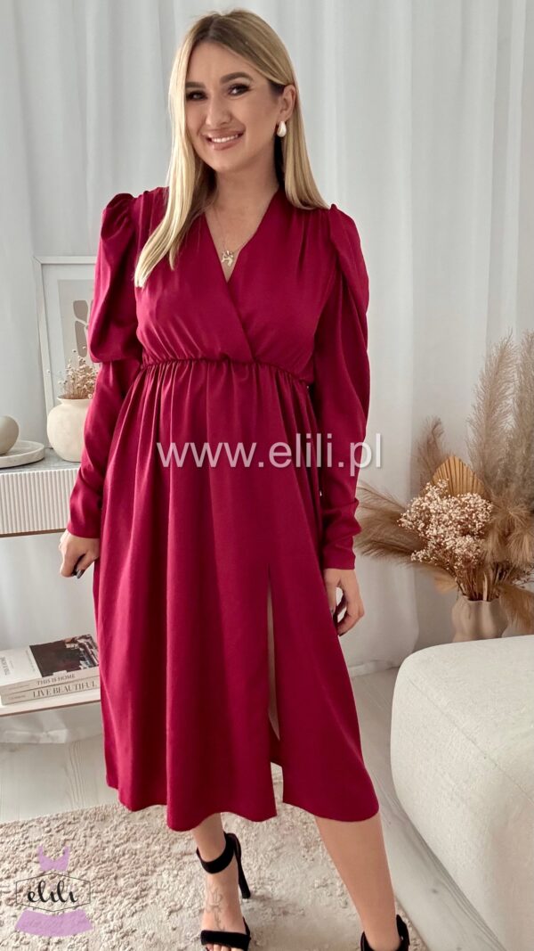 Sukienka midi z gumka w talii, kopertowym dekoltem i efektownym rozcięciem na nodze.