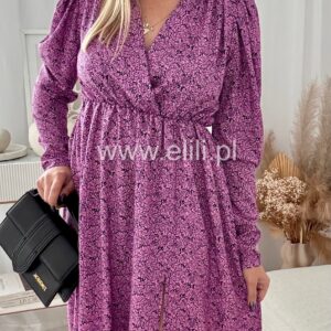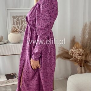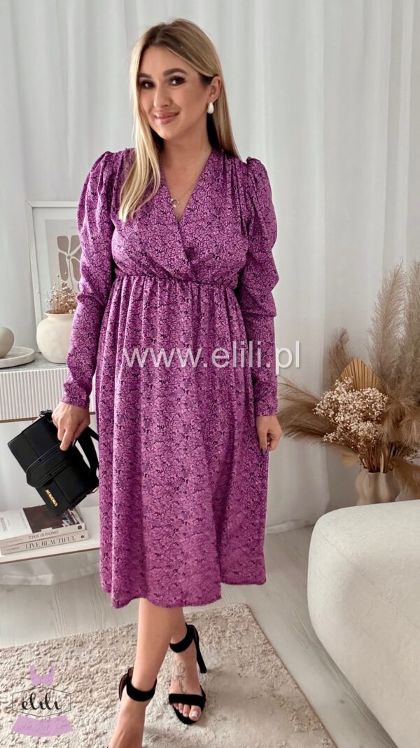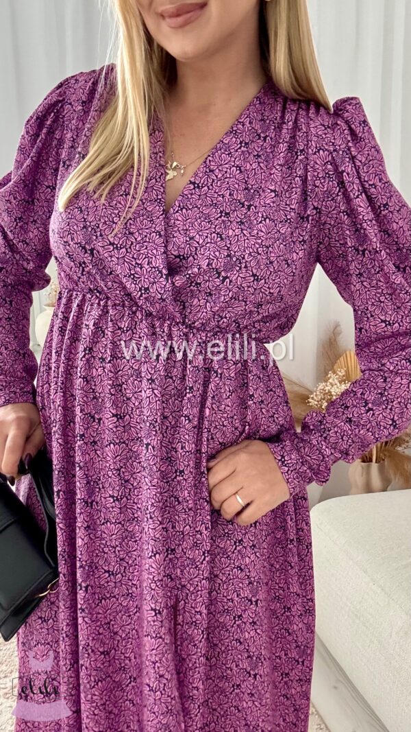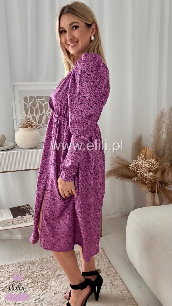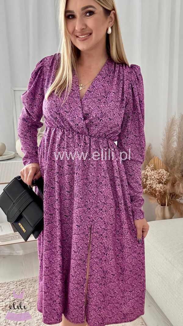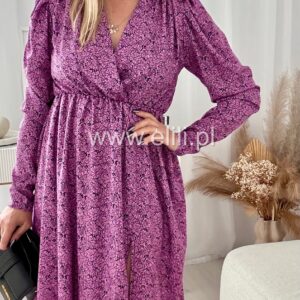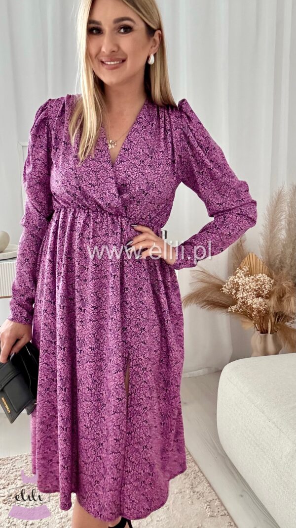 Sukienka midi z gumka w talii, kopertowym dekoltem i efektownym rozcięciem  na nodze.