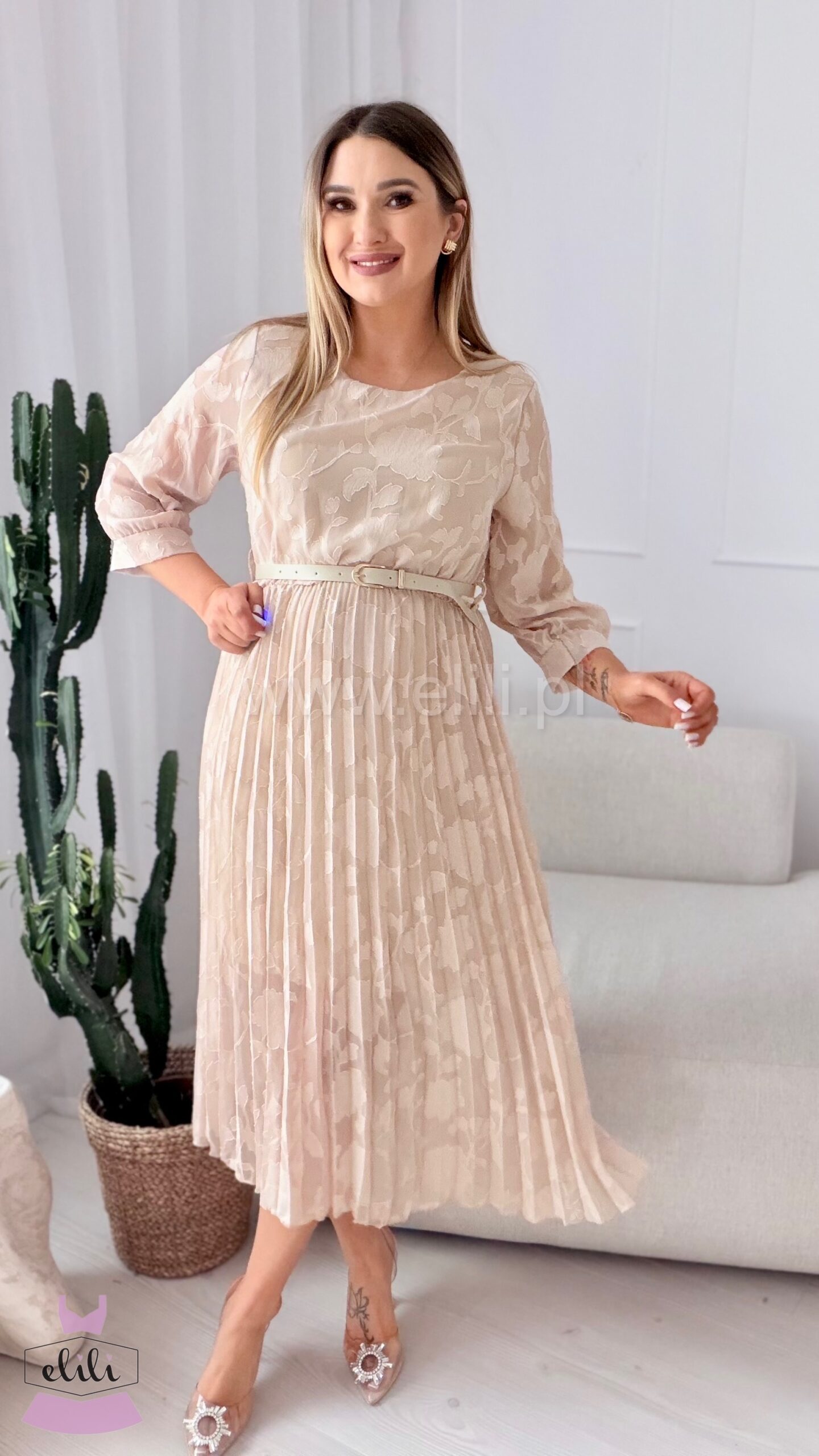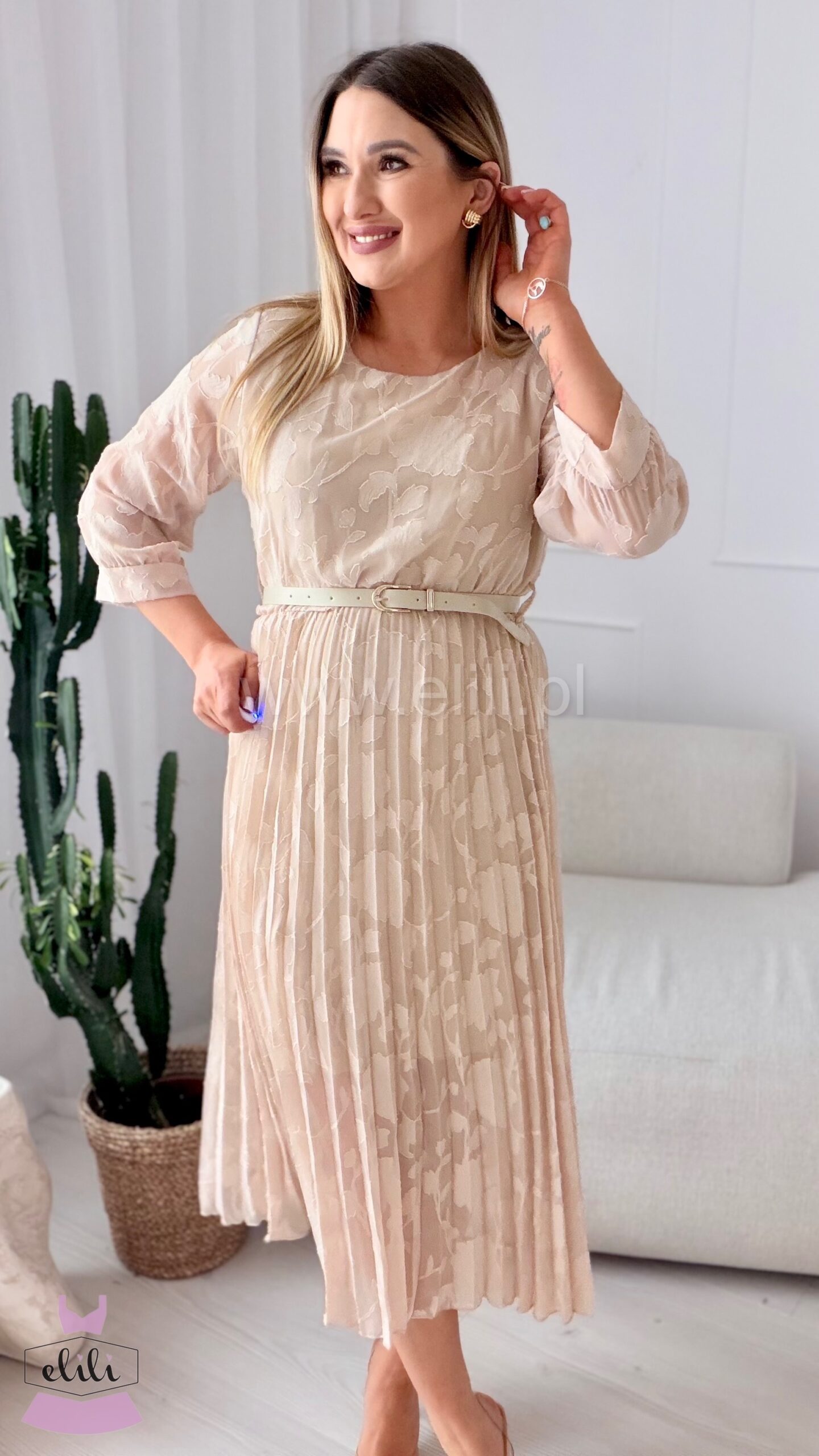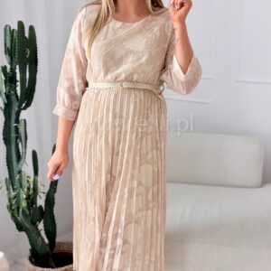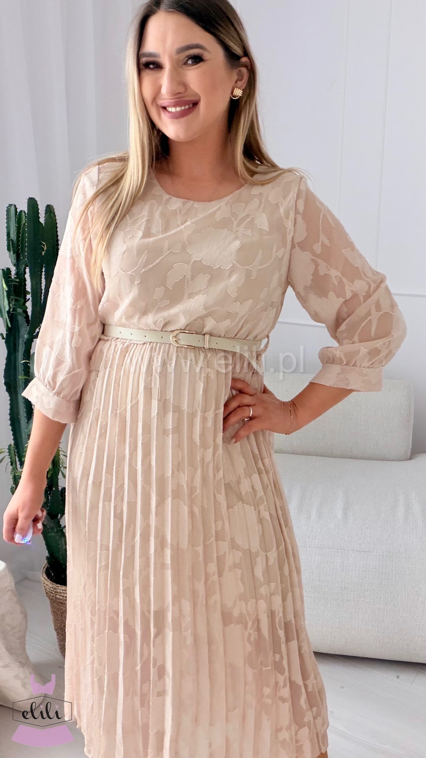 Plisowany dół dodaje jej klasy i sprawia, że sylwetka prezentuje się smukło i harmonijnie. W zestawie znajduje się pasek, który podkreśla talię i pozwala idealnie dopasować sukienkę do figury. Tkanina w wytłaczane kwiaty nadaje całości wyjątkowej tekstury i romantycznego wyrazu.