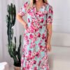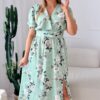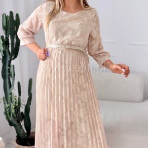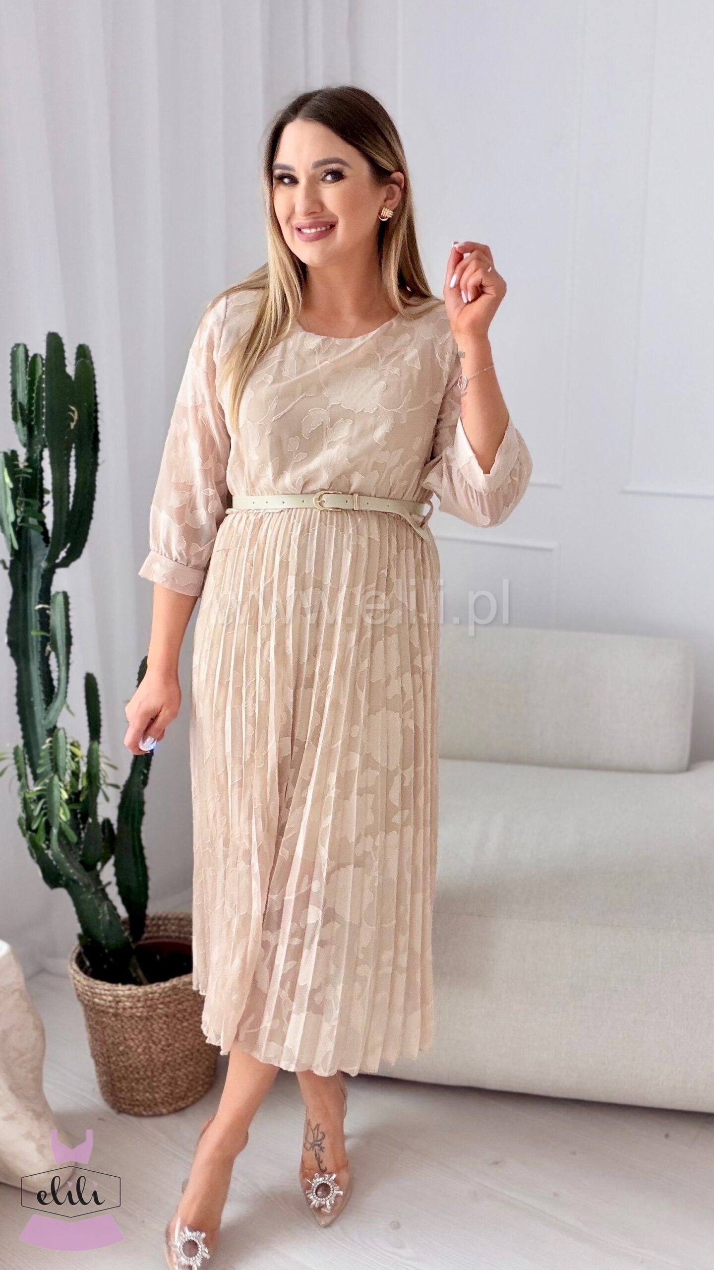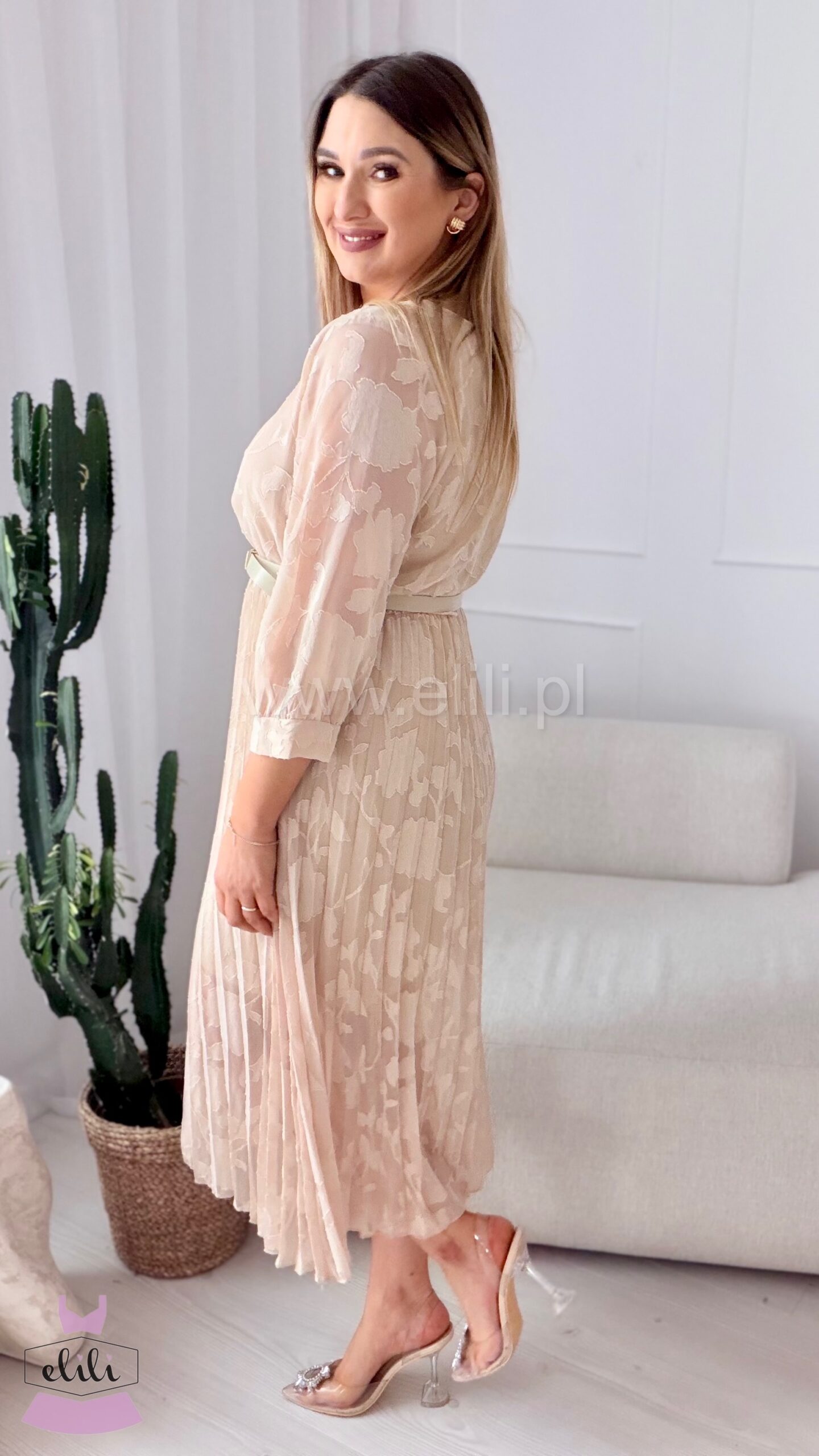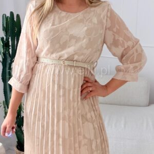 Plisowany dół dodaje jej klasy i sprawia, że sylwetka prezentuje się smukło i harmonijnie. W zestawie znajduje się pasek, który podkreśla talię i pozwala idealnie dopasować sukienkę do figury. Tkanina w wytłaczane kwiaty nadaje całości wyjątkowej tekstury i romantycznego wyrazu.