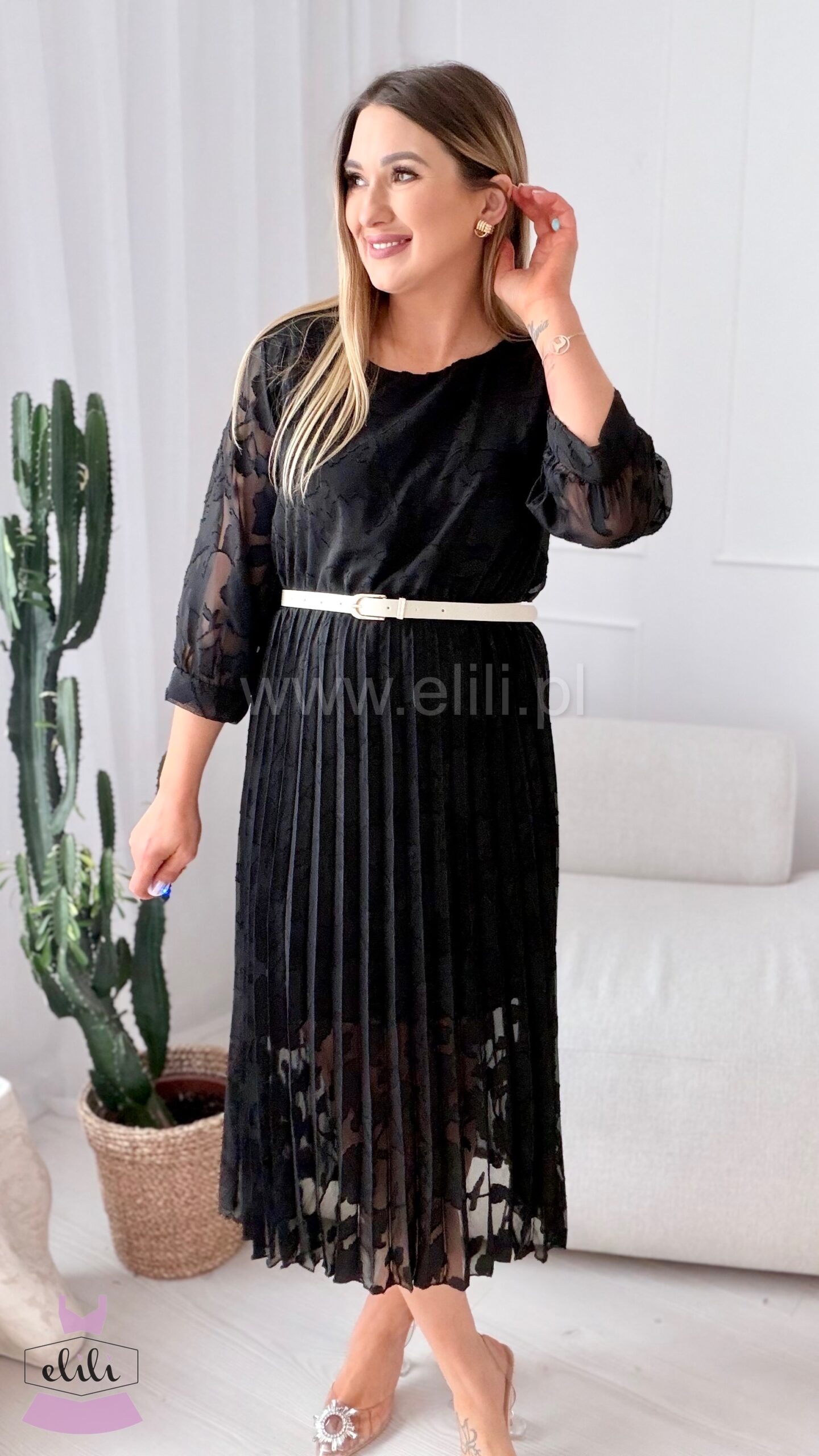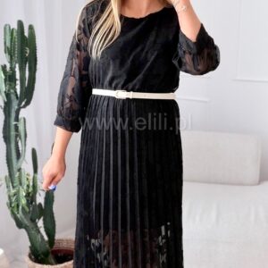 Plisowany dół dodaje jej klasy i sprawia, że sylwetka prezentuje się smukło i harmonijnie. W zestawie znajduje się pasek, który podkreśla talię i pozwala idealnie dopasować sukienkę do figury. Tkanina w wytłaczane kwiaty nadaje całości wyjątkowej tekstury i romantycznego wyrazu.