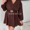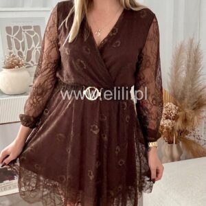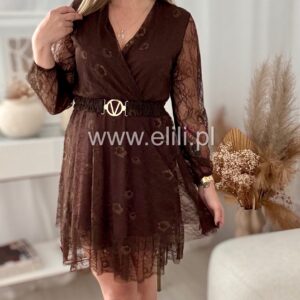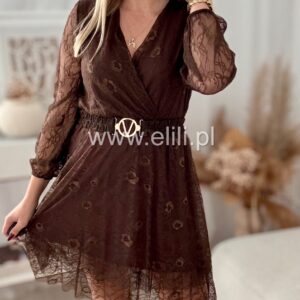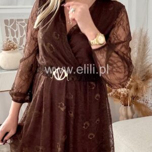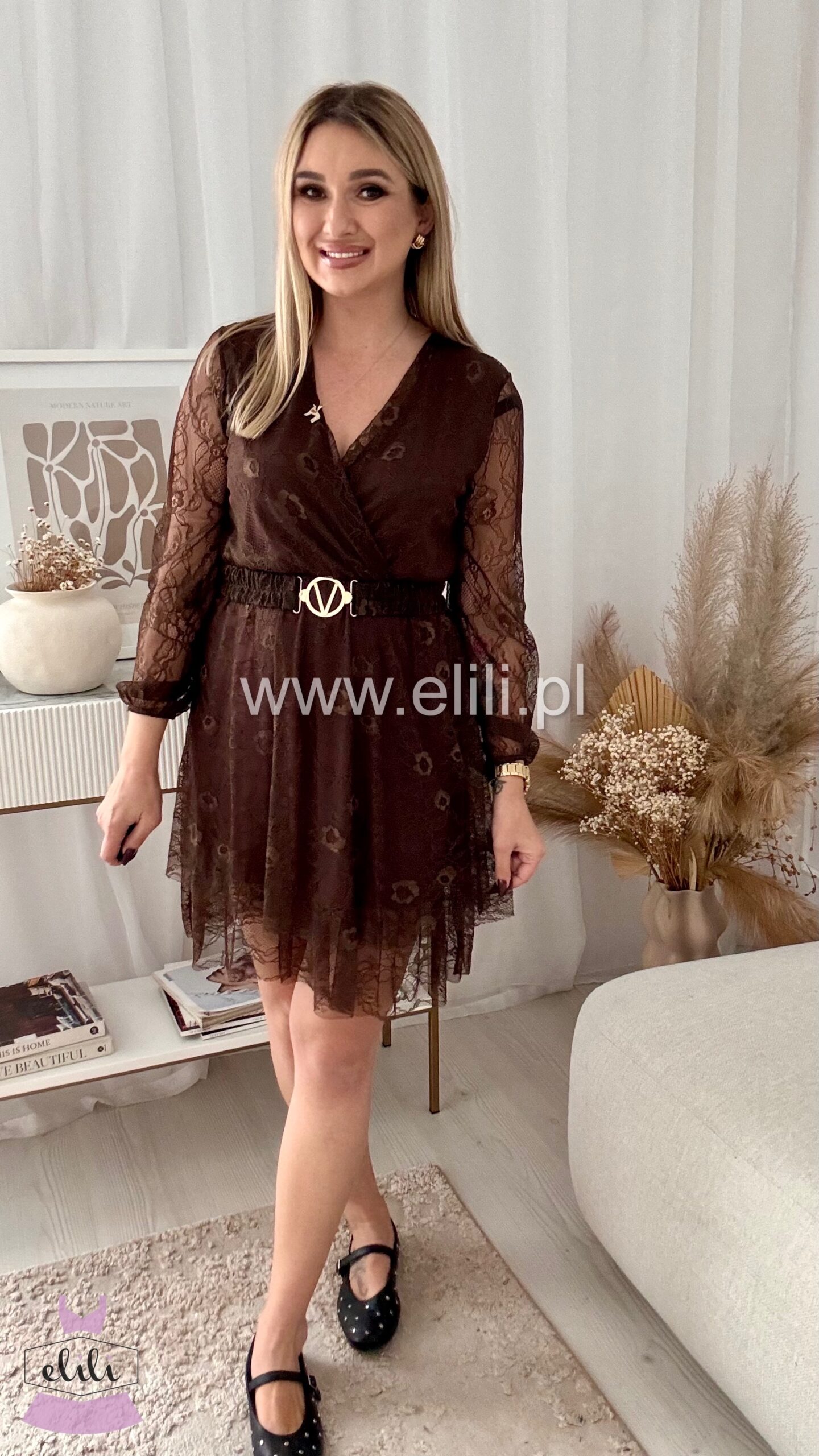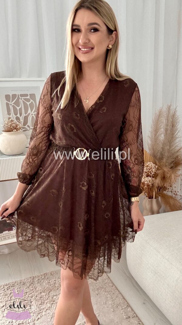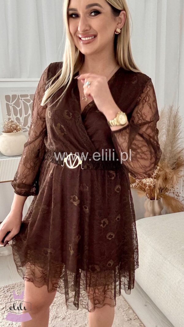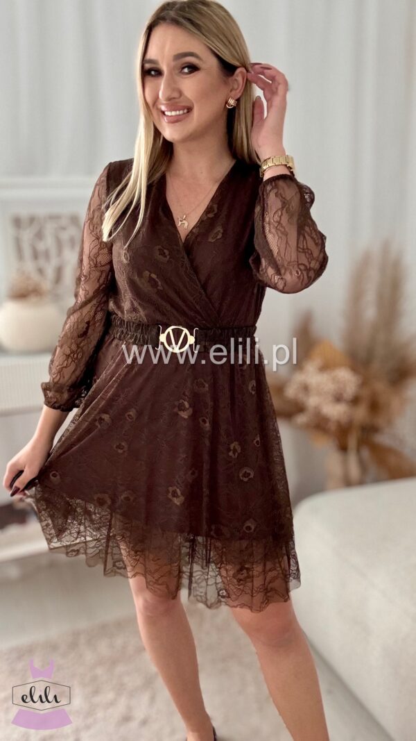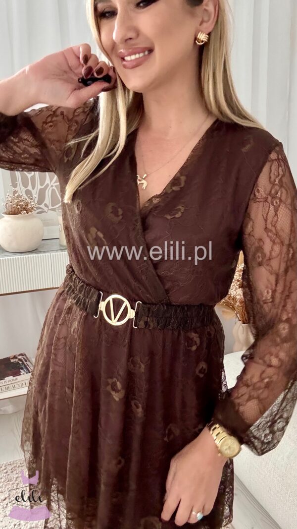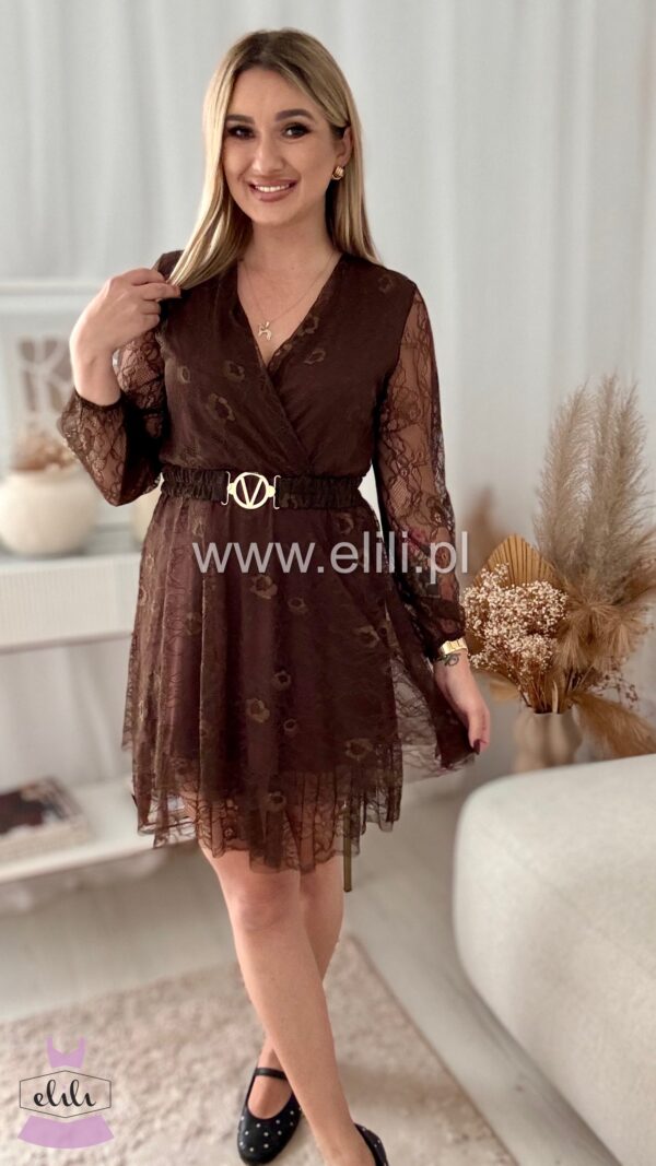 Koronkowy model na wiskozowej podszewce z gumką w talii i paskiem na gumie z ozdobną klamrą