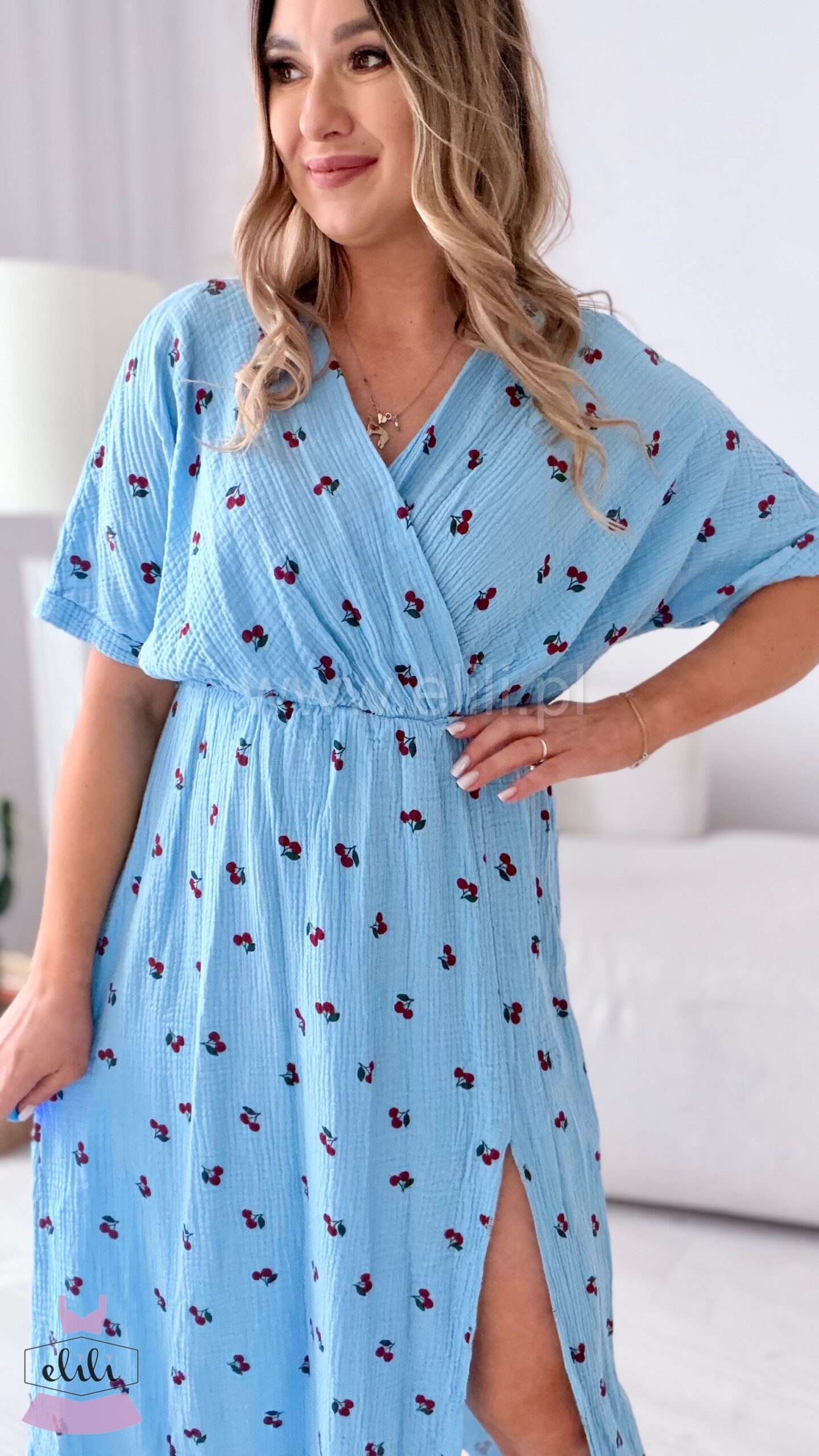 Długość midi w połączeniu z rozcięciem na nodze nadaje całości kobiecego, lekkiego charakteru i sprawia, że sukienka pięknie pracuje w ruchu.