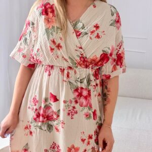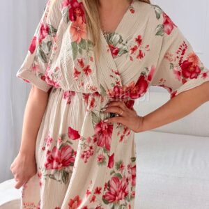 Model posiada kopertowy dekolt, który subtelnie podkreśla biust i optycznie wysmukla sylwetkę. Krótkie, kimonowe rękawy dodają jej luzu i elegancji, a gumka w talii idealnie dopasowuje się do figury, podkreślając jej proporcje.