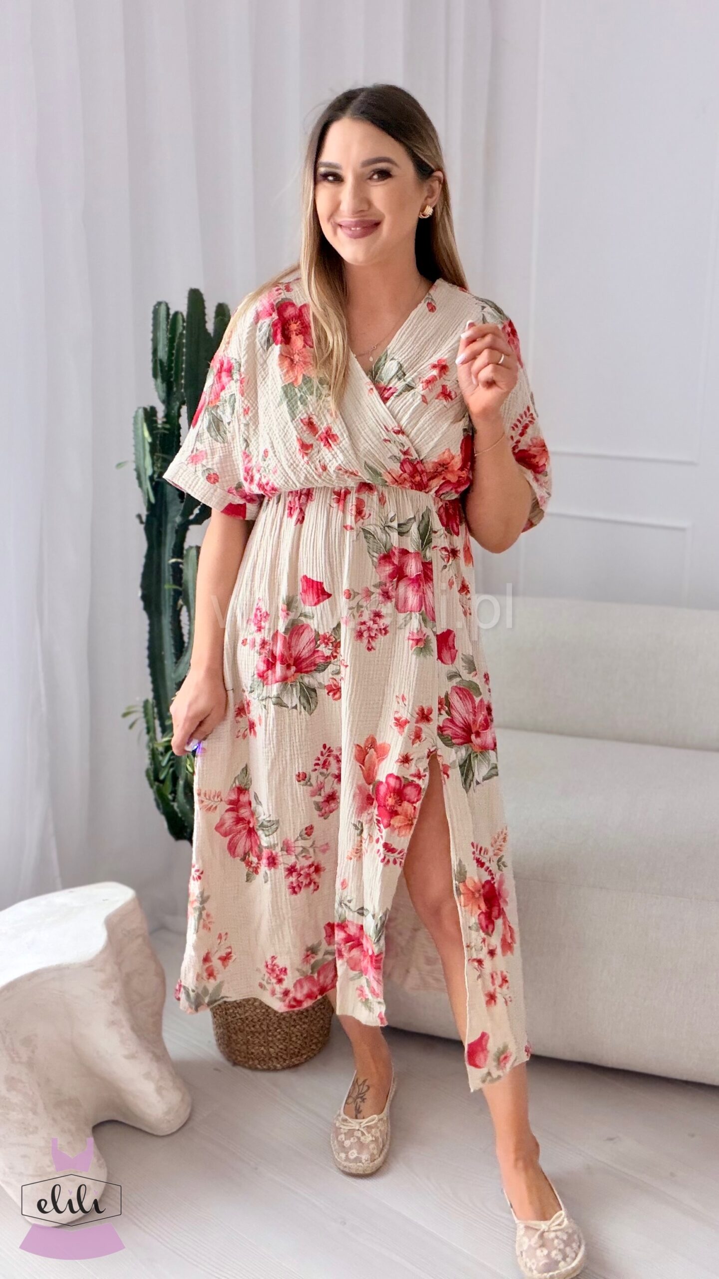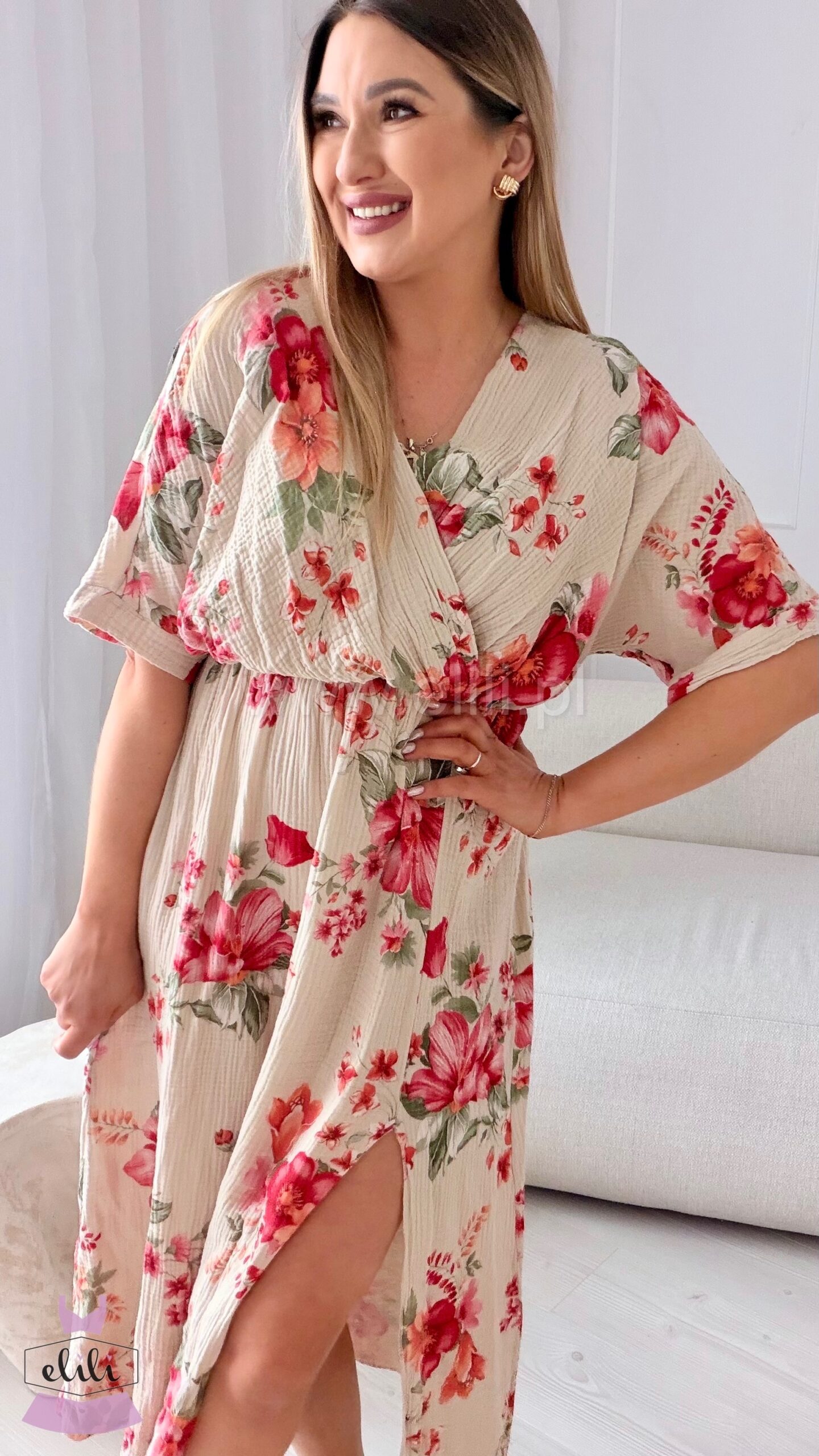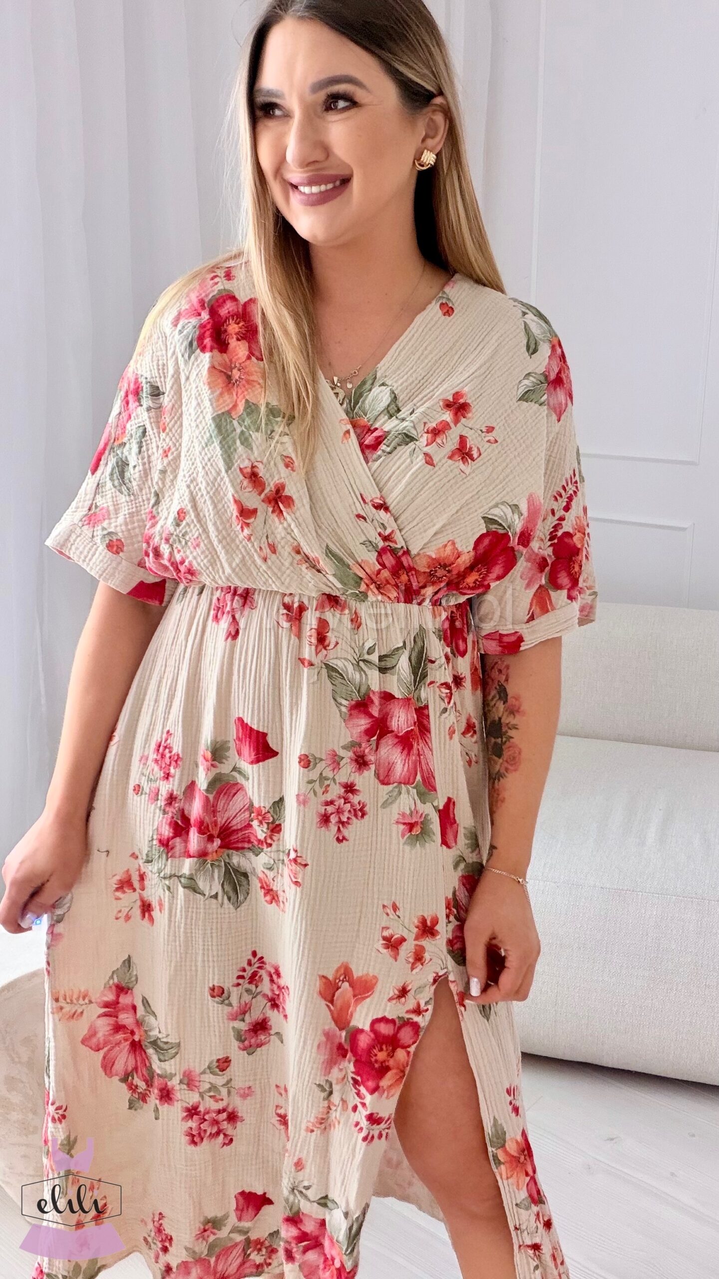 Sukienka Stella Midi wykonana z przewiewnego muślinu to idealna propozycja na cieplejsze dni. Naturalna, lekka tkanina pięknie układa się na sylwetce, zapewniając komfort i swobodę przez cały dzień.