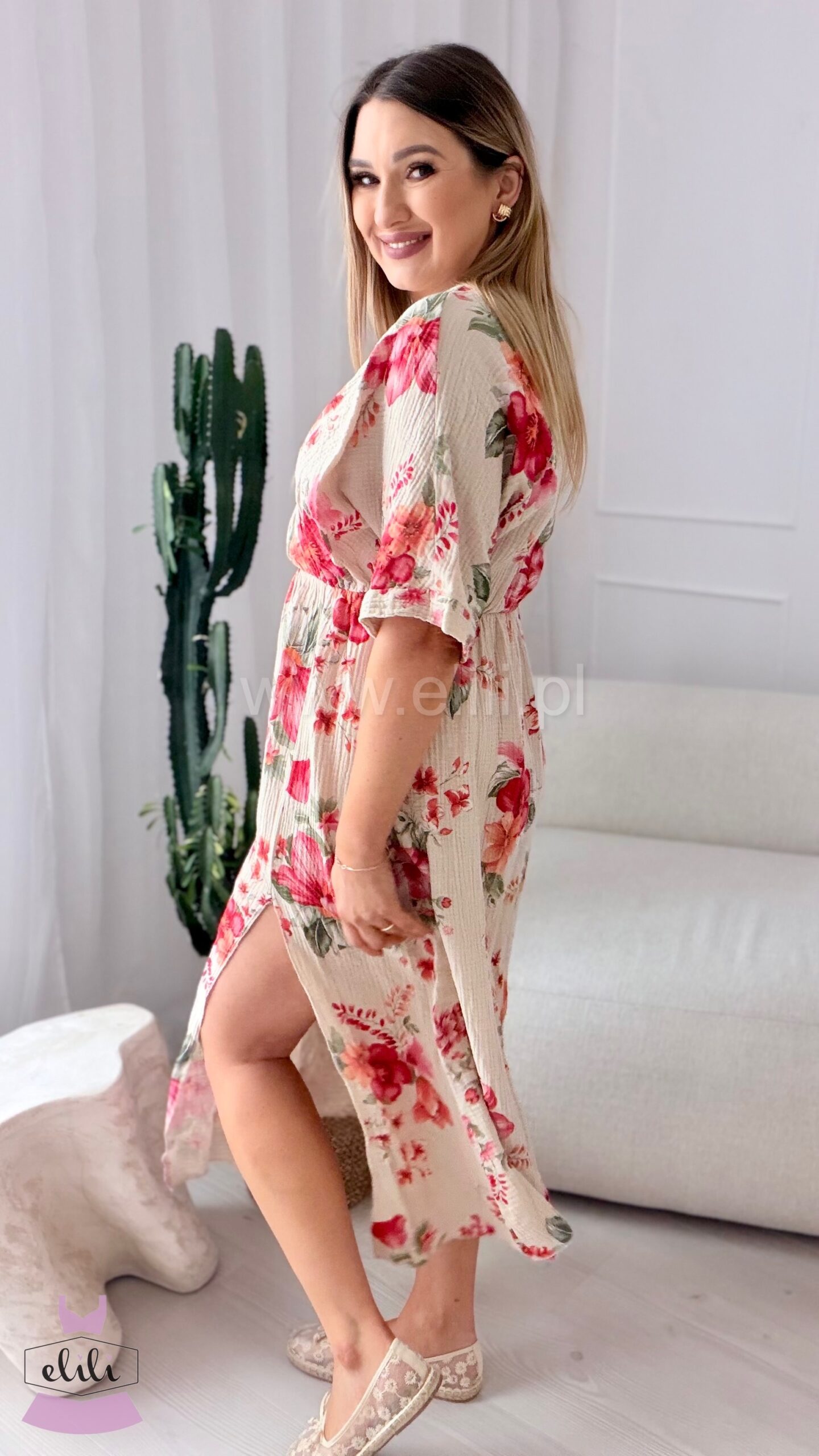 Długość midi w połączeniu z rozcięciem na nodze nadaje całości kobiecego, lekkiego charakteru i sprawia, że sukienka pięknie pracuje w ruchu.