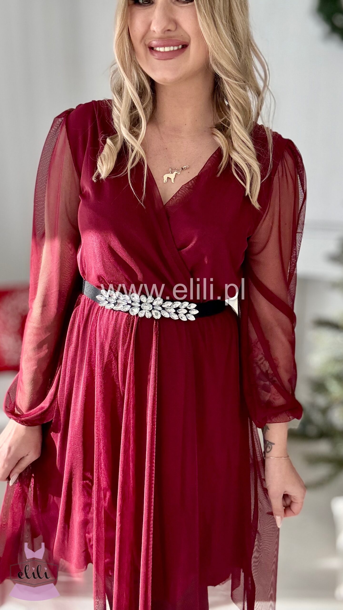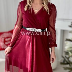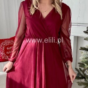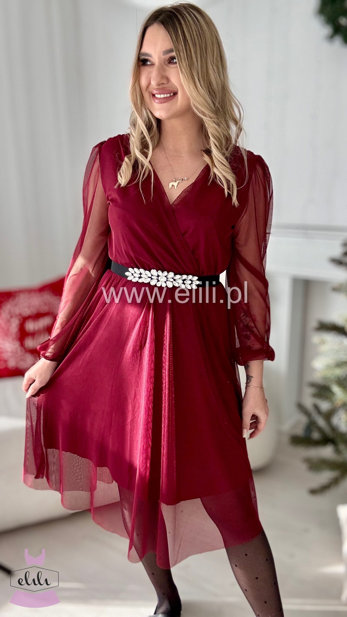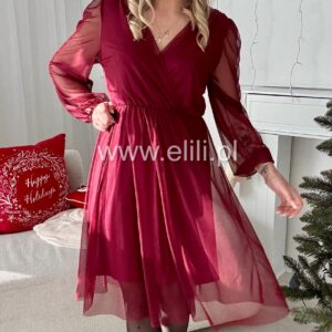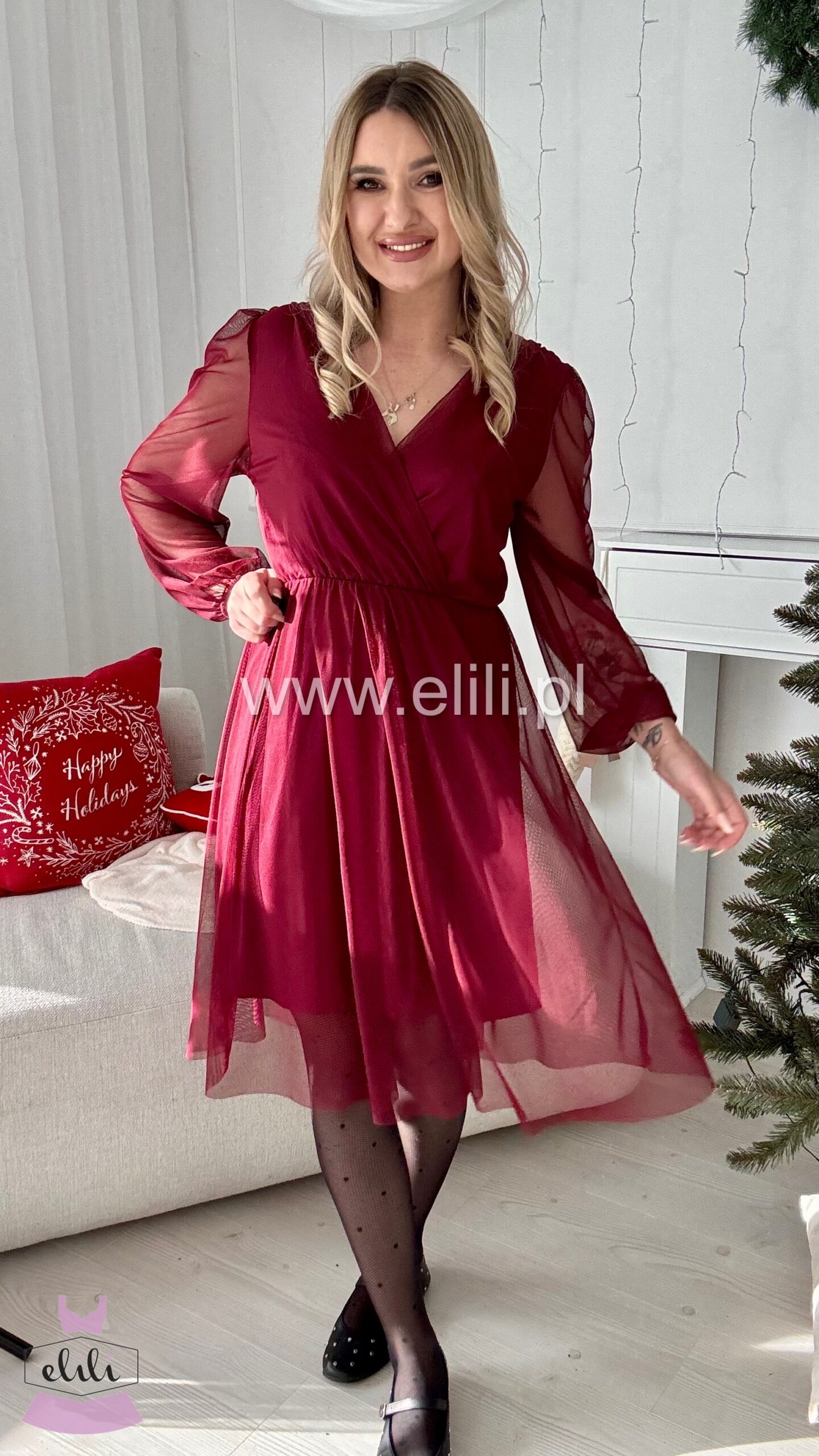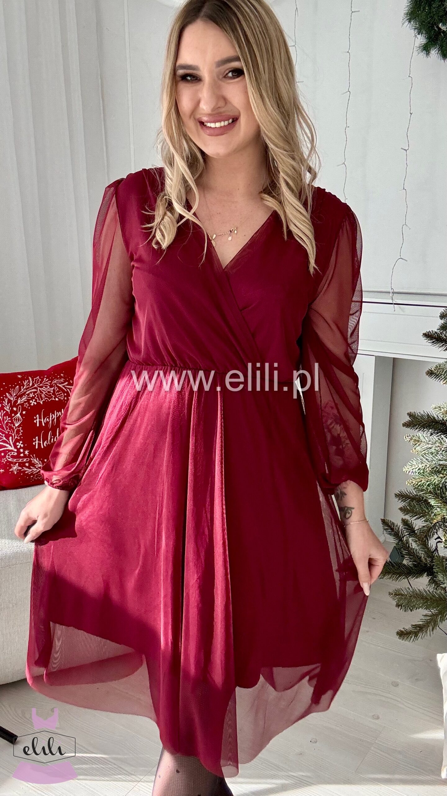 Sukienka składająca się z bardzo elastycznej siateczkowej warstwy zewnętrznej oraz wiskozowej podszewki. Posiada gumkę w talii i kopertowy dekolt.