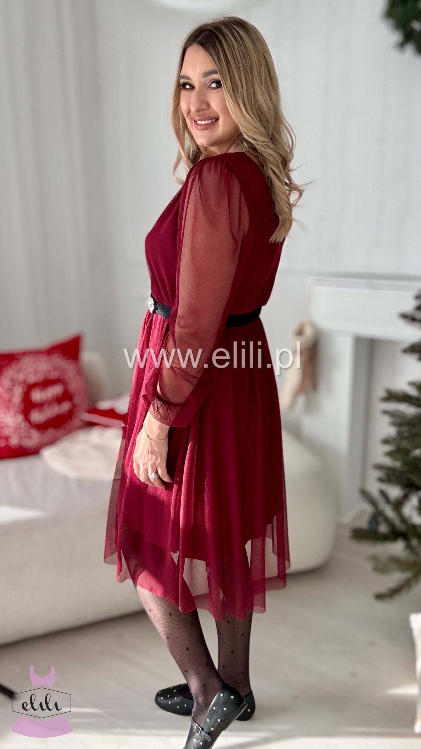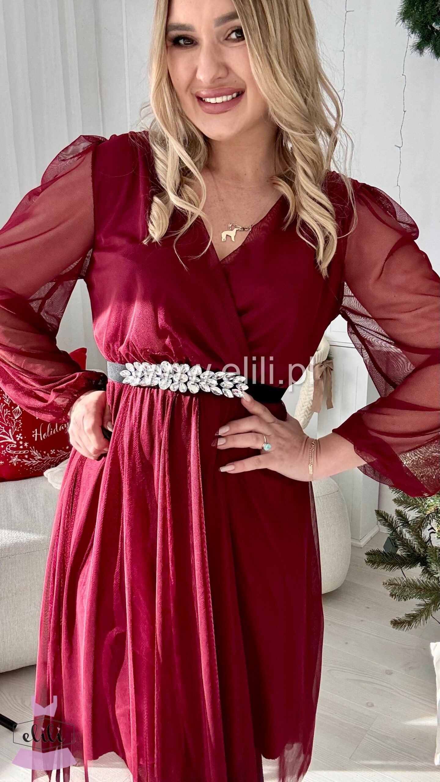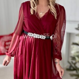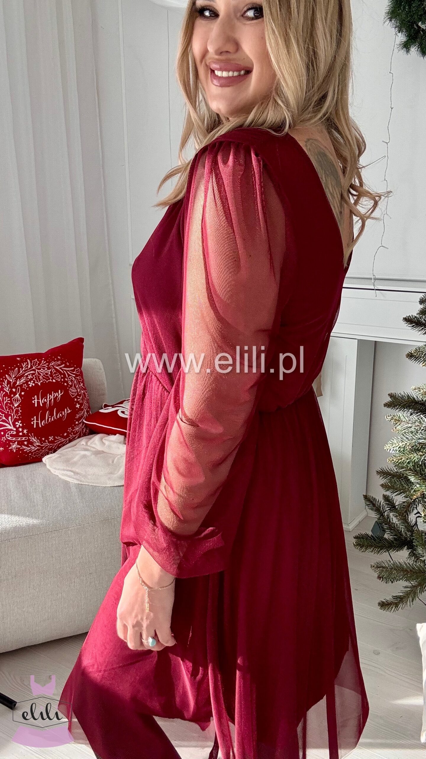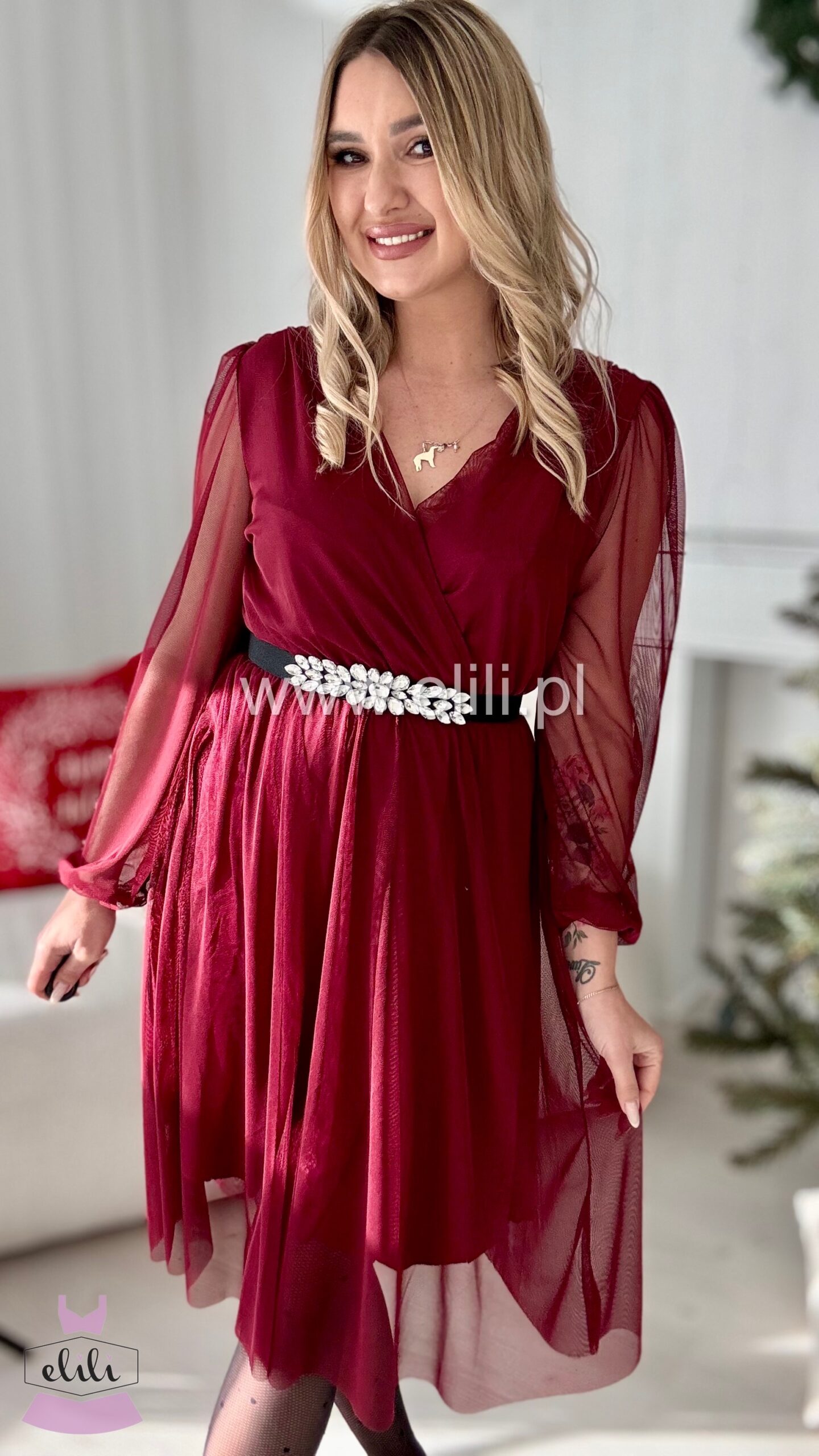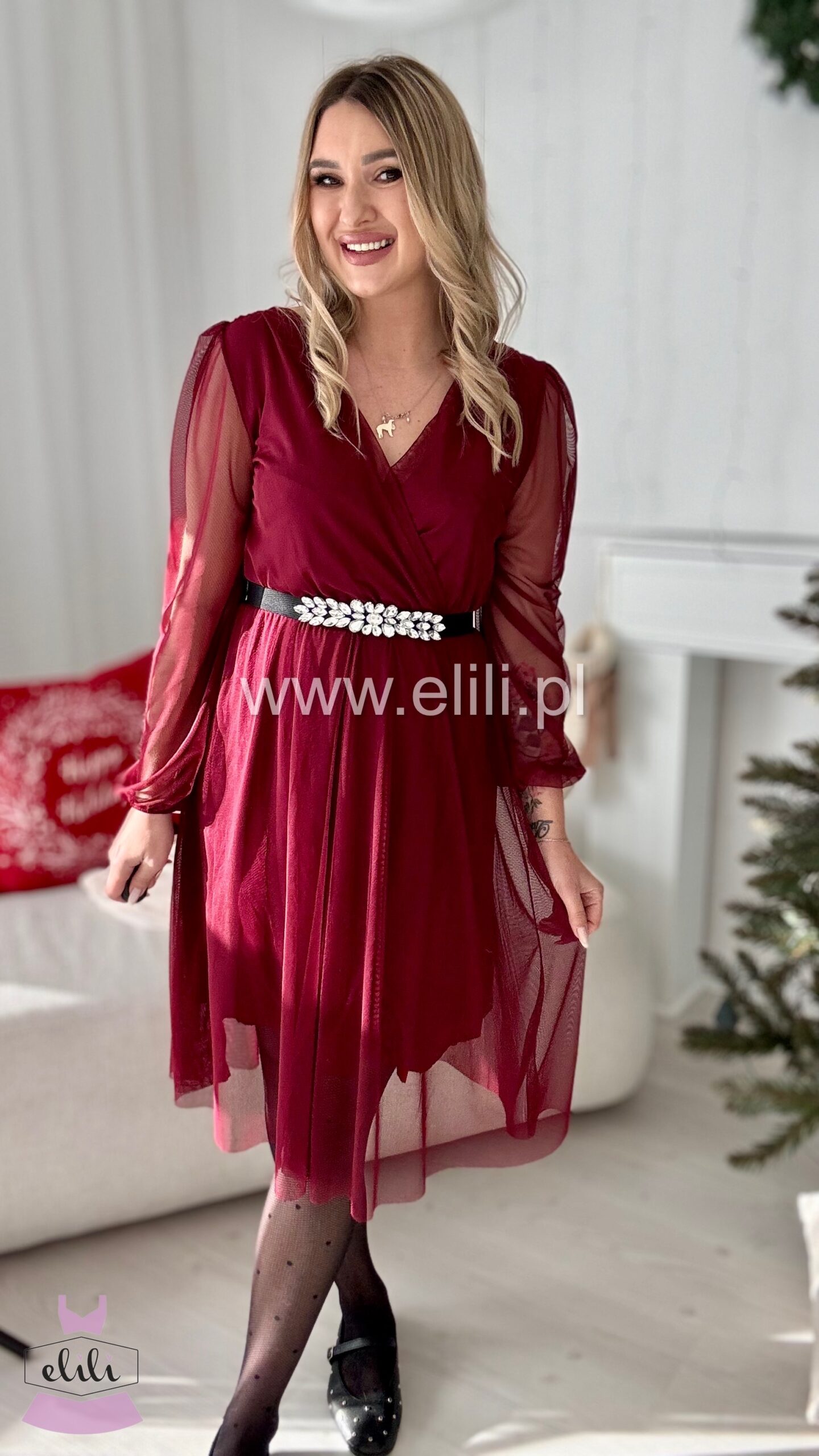 Sukienka składająca się z bardzo elastycznej siateczkowej warstwy zewnętrznej oraz wiskozowej podszewki. Posiada gumkę w talii i kopertowy dekolt.