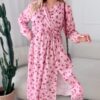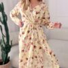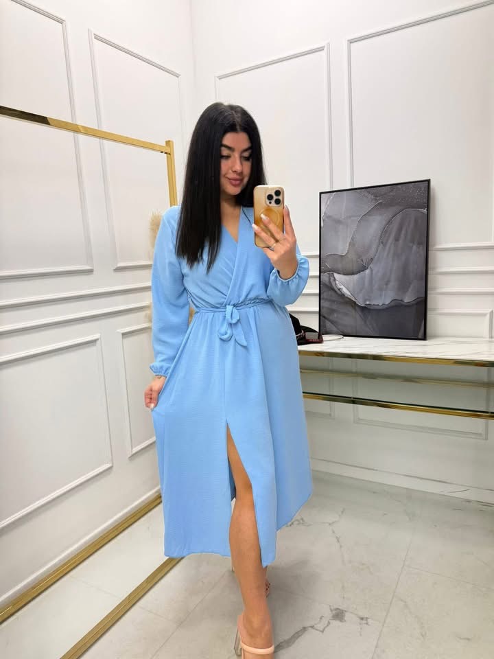 Sukienka z kopertowym dekoltem i gumka w laii przewiązywana paskiem. Z przodu posiada rozciecie