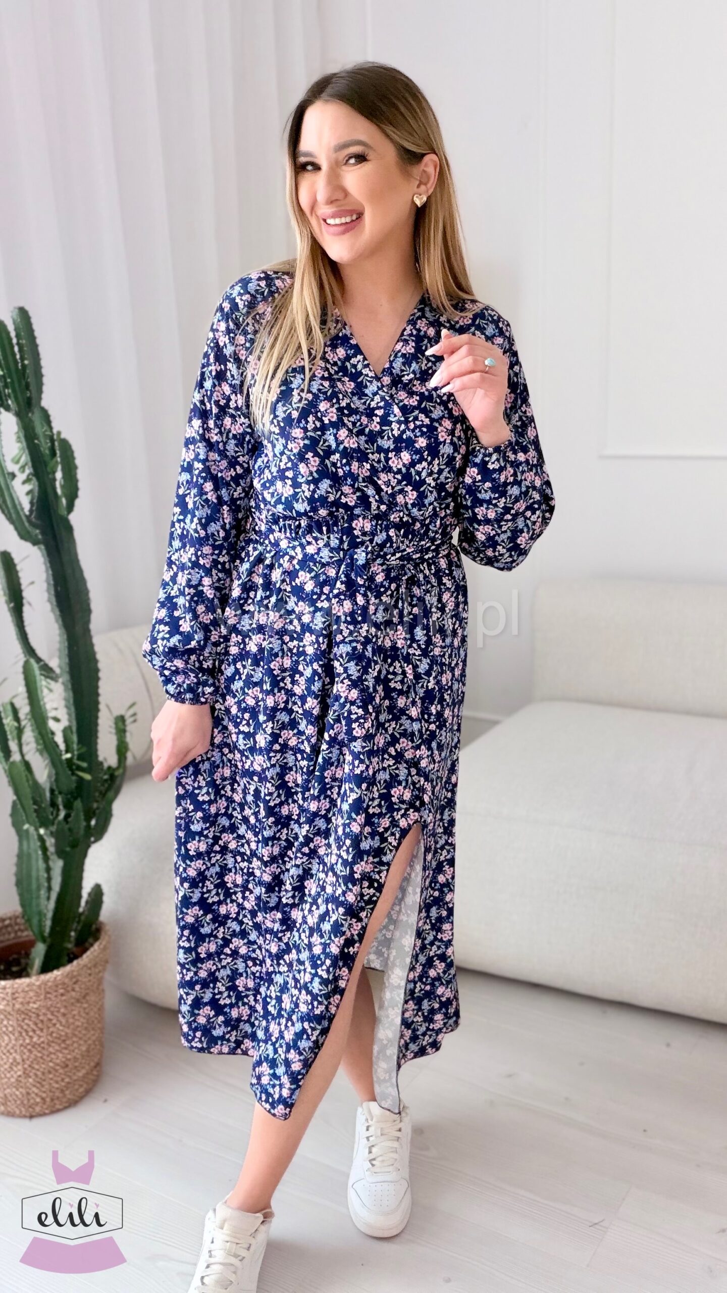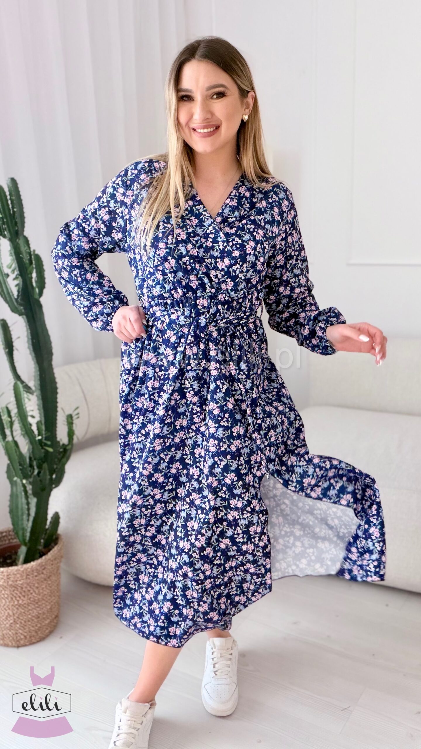 W talii znajduje się elastyczna gumka, dzięki której sukienka dopasowuje się do figury, a pasek do przewiązania pozwala dodatkowo podkreślić talię. Lekko rozkloszowany dół sprawia, że sukienka pięknie układa się w ruchu i nadaje stylizacji kobiecego charakteru.