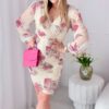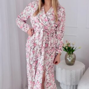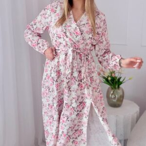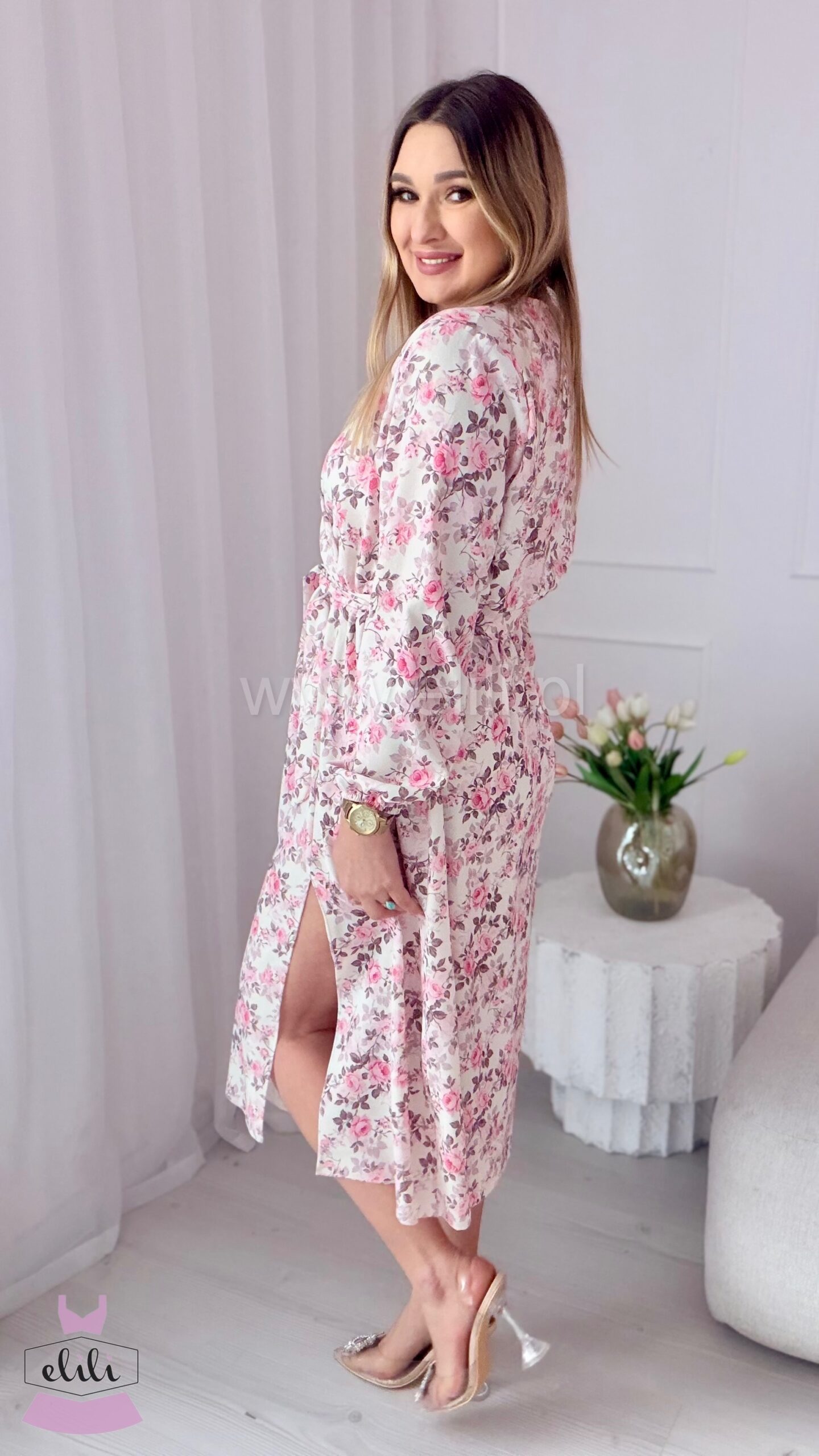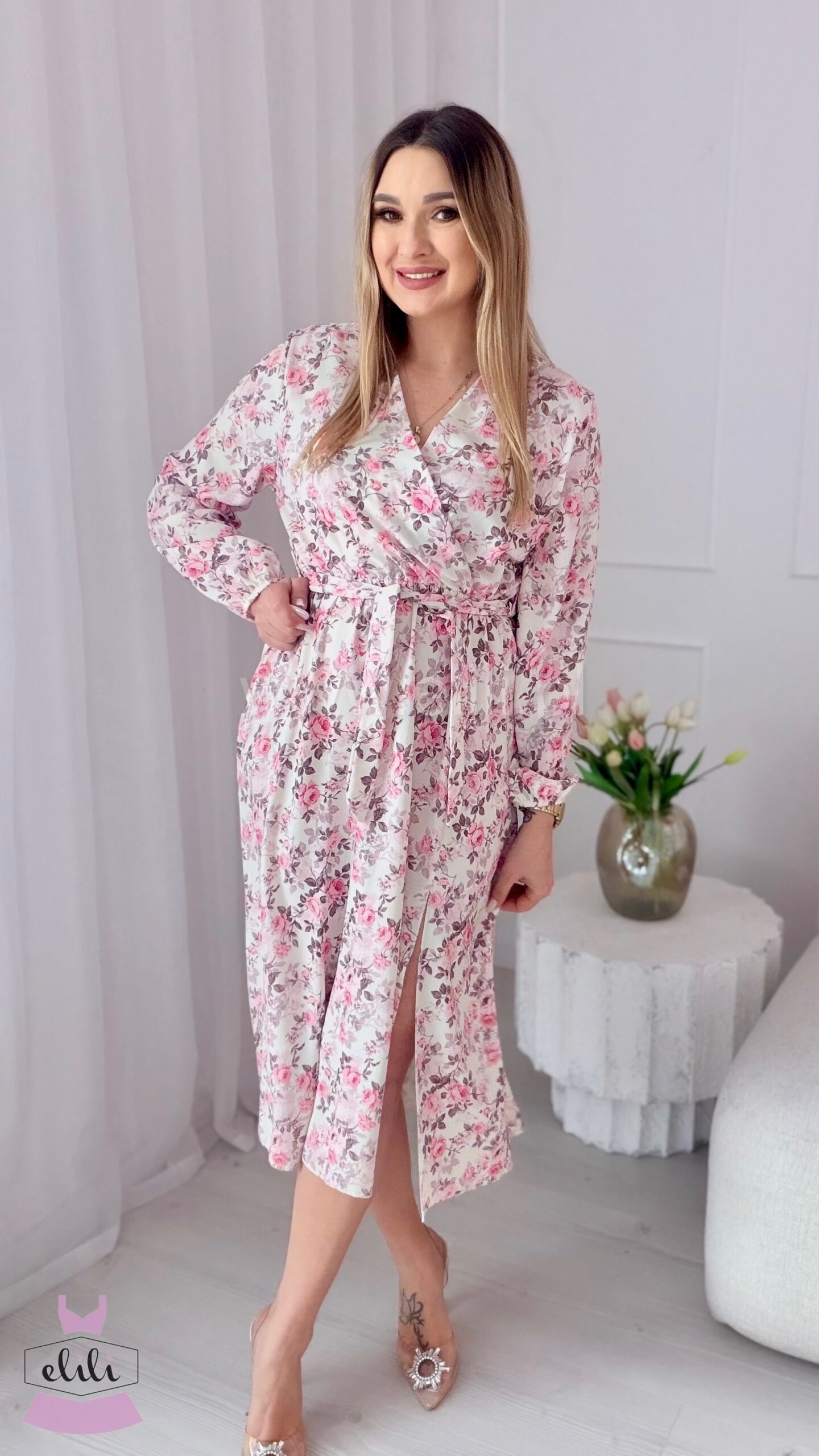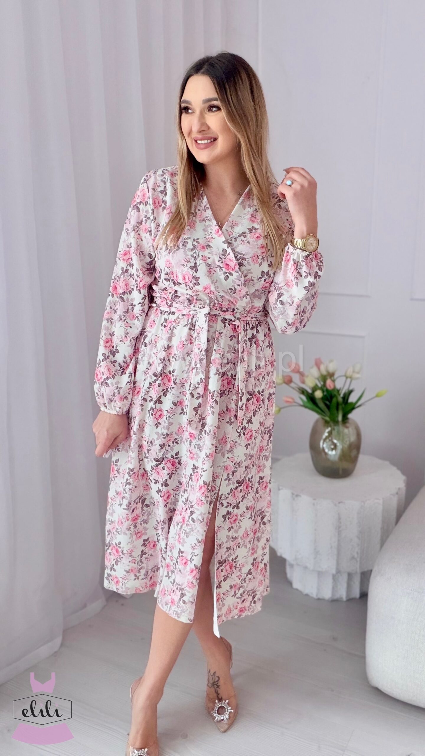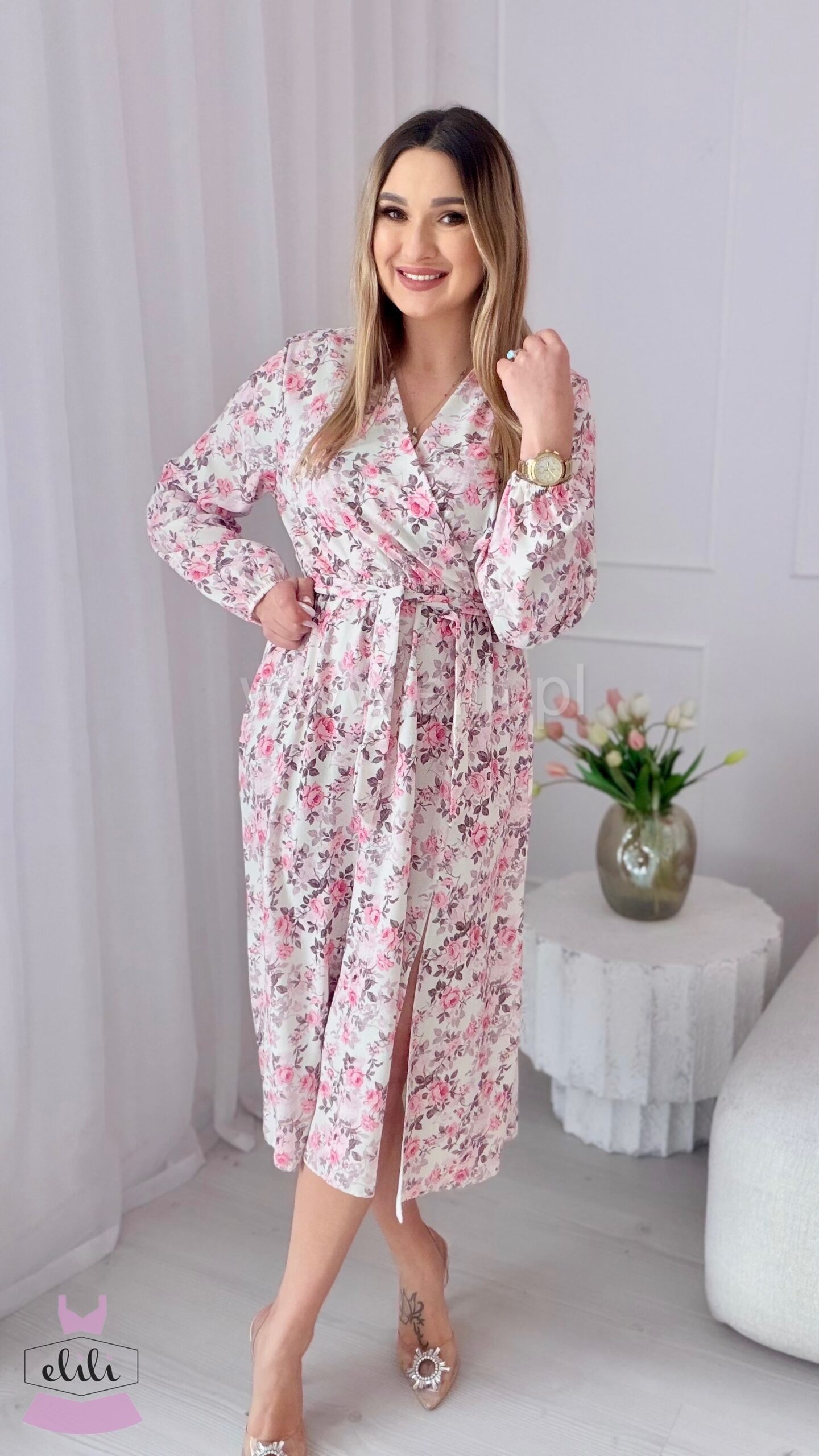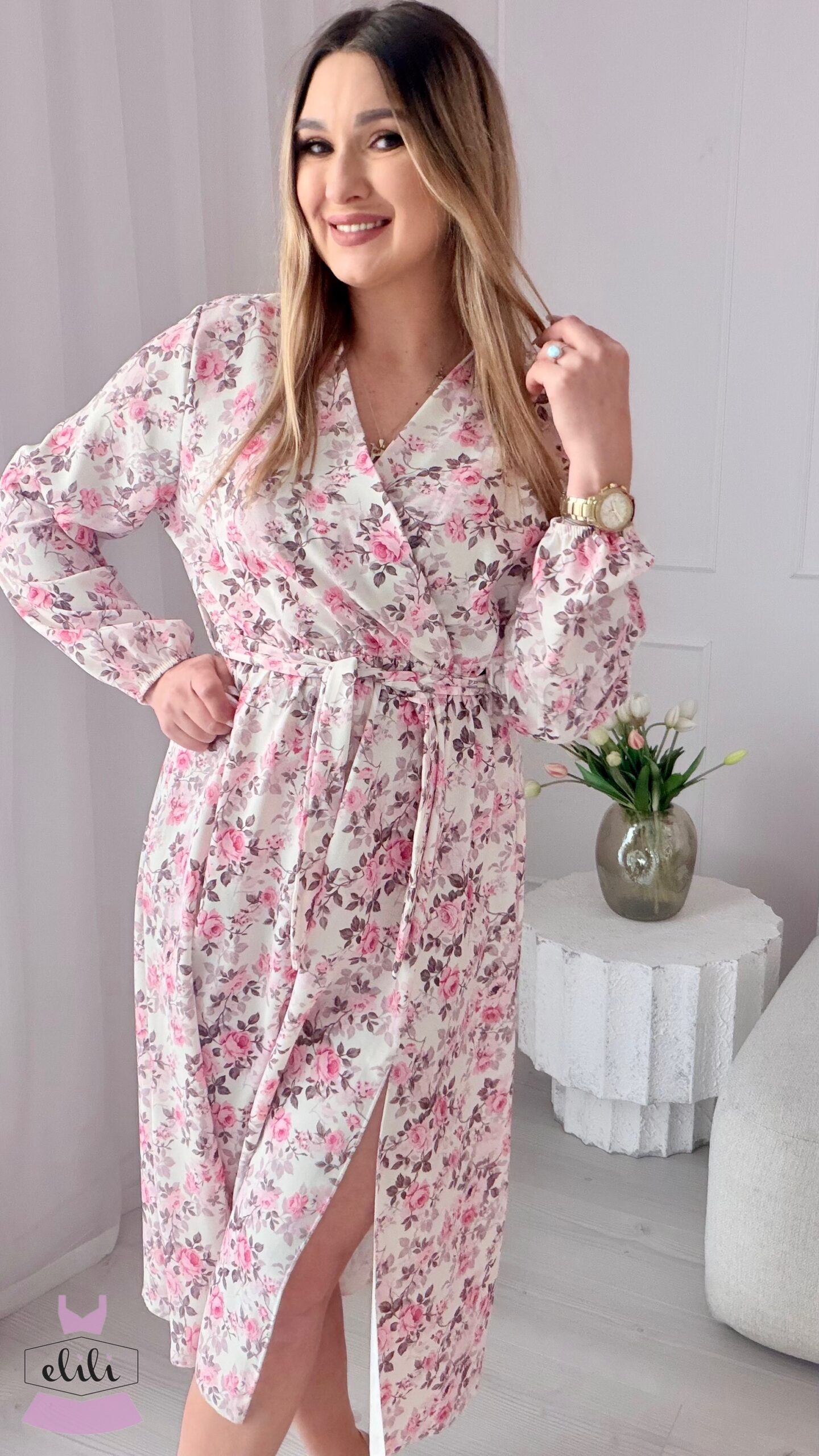 Bardzo wygodna sukienka z koperttowym dekoltem i gumką oraz paskiem w talii.