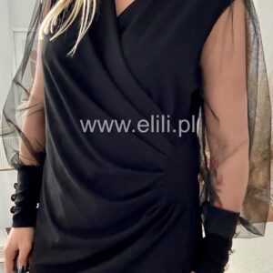 Sukienka z przezroczystymi rękawami. Posiada kopertowy dekolt, który umożliwiać będzie karmienie piersią. W pasie znajduje sie ozdobne marszczenie, które maskuje niedoskonałości. Dół sukienki uszyty jest na zakładkę.