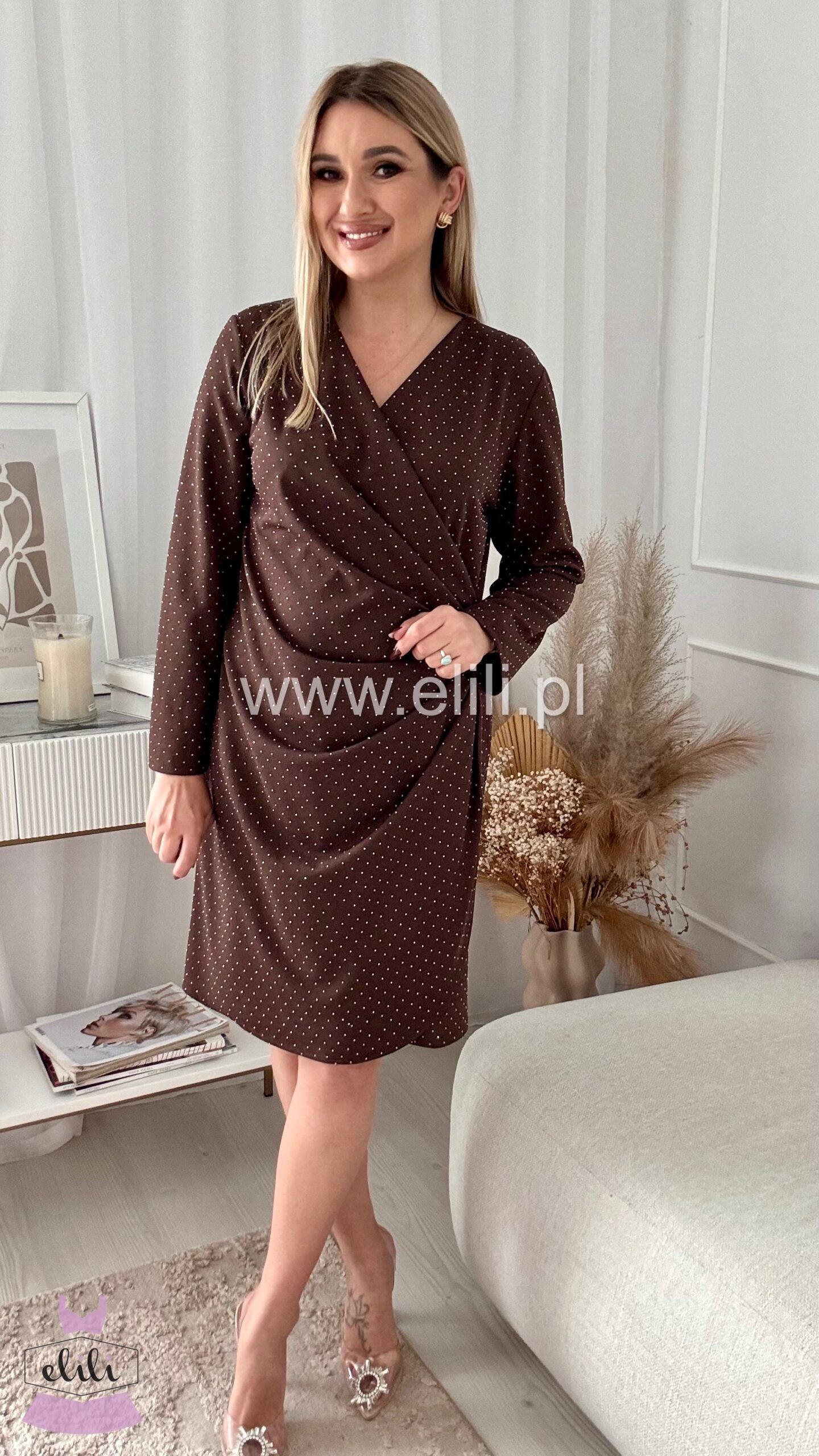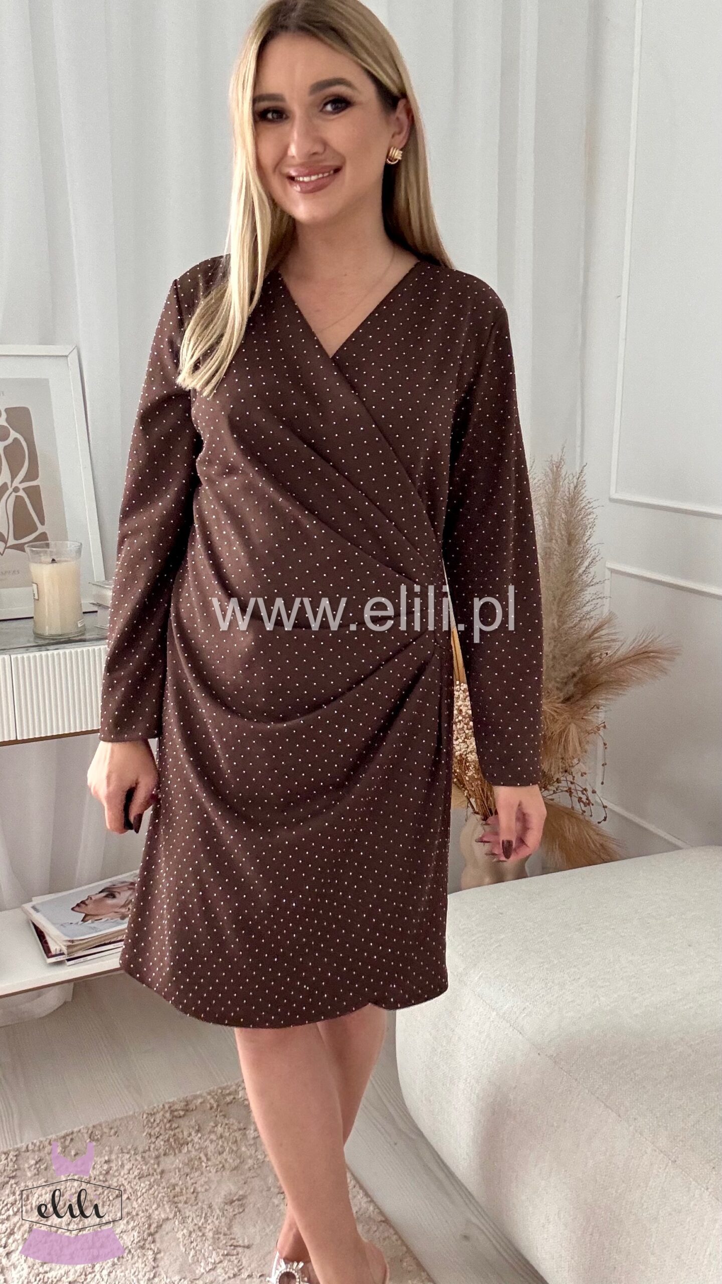 Sukienka z kopertowym dekoltem to połączenie elegancji i nowoczesnego designu. Wykonana z elastycznego materiału, doskonale dopasowuje się do sylwetki, podkreślając jej kształty. Zmysłowe marszczenie po bokach subtelnie modeluje ciało, a dodatek cyrkonii wprowadza blask i elegancję, nadając sukience wyjątkowego charakteru. Dzięki elastycznemu materiałowi sukienka jest komfortowa i wygodna, idealnie dopasowując się do ruchów. Dostępna w dwóch rozmiarach – standard oraz plus size, dzięki czemu każda kobieta może poczuć się pewnie i stylowo. Idealna na wieczorne wyjścia, koktajlowe przyjęcia czy inne wyjątkowe okazje.