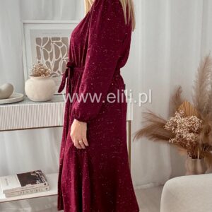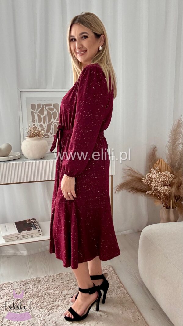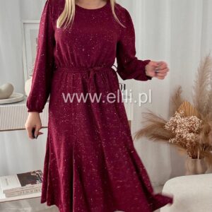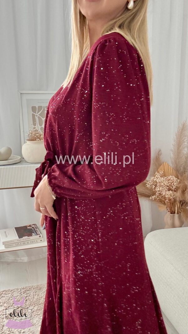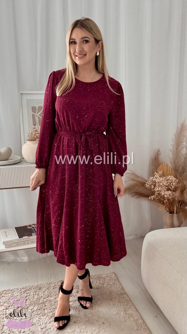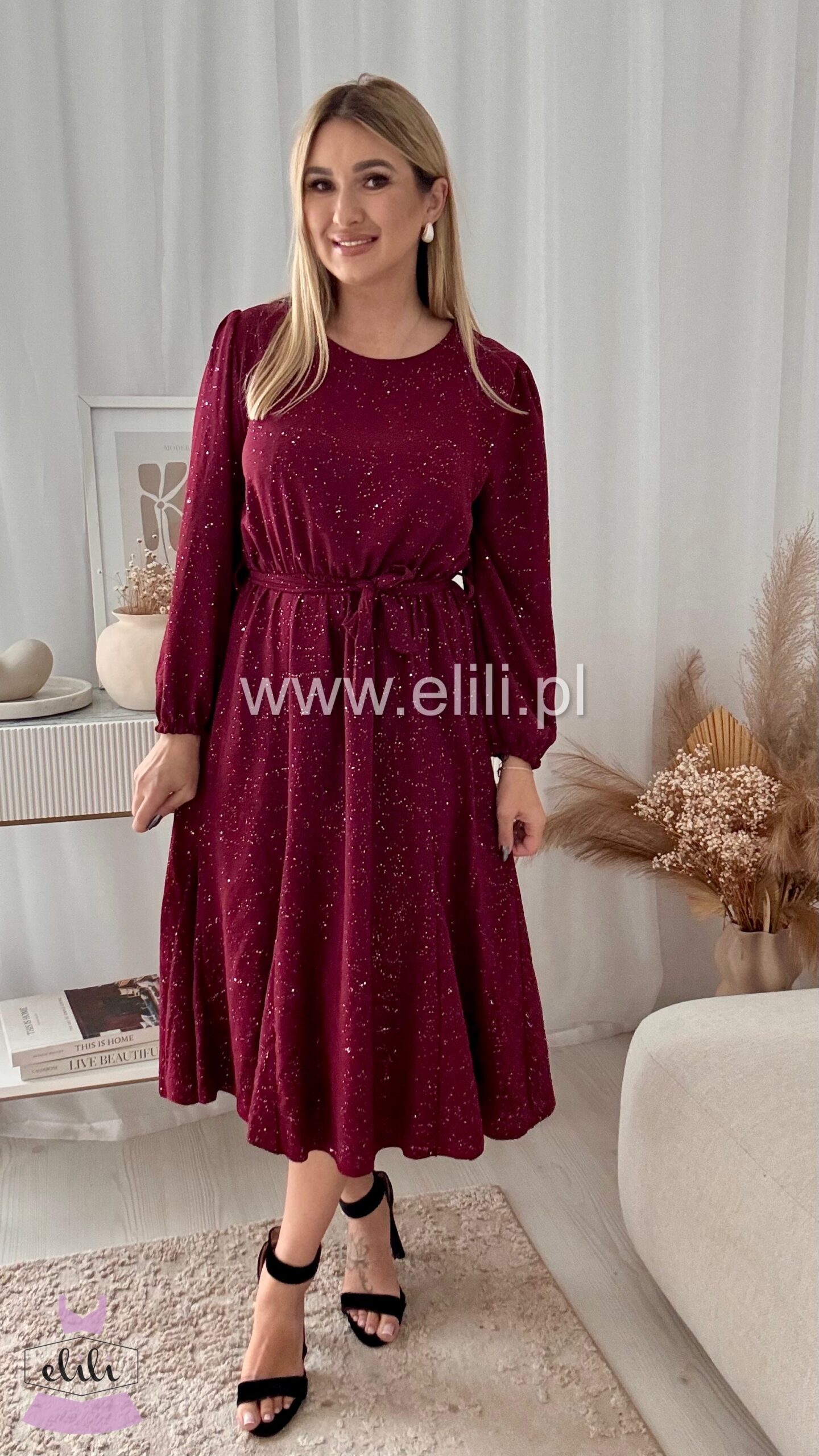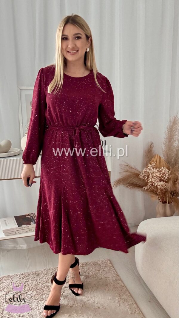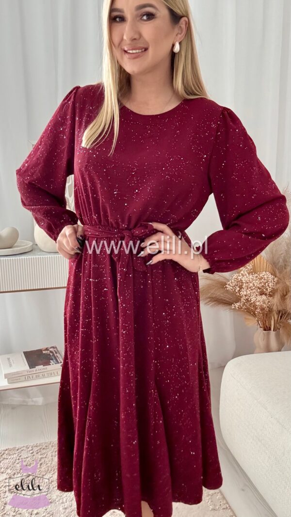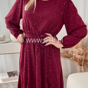 Sukienka z gumką w talii przewiązywana paskiem. Posiada błyszczące aplikacje