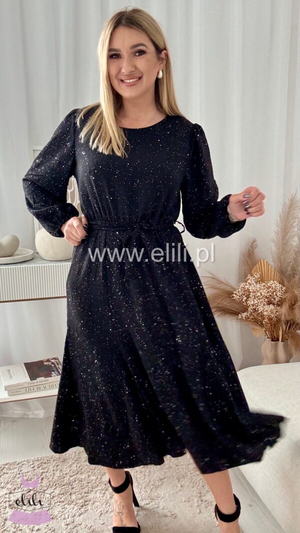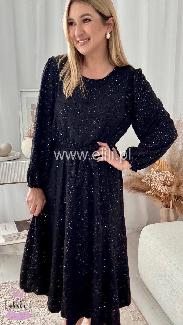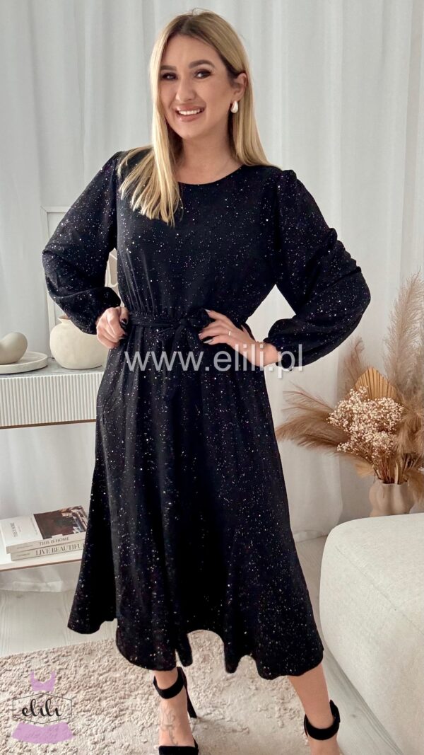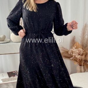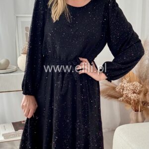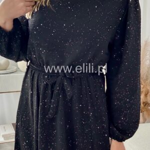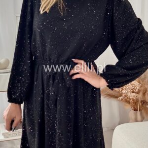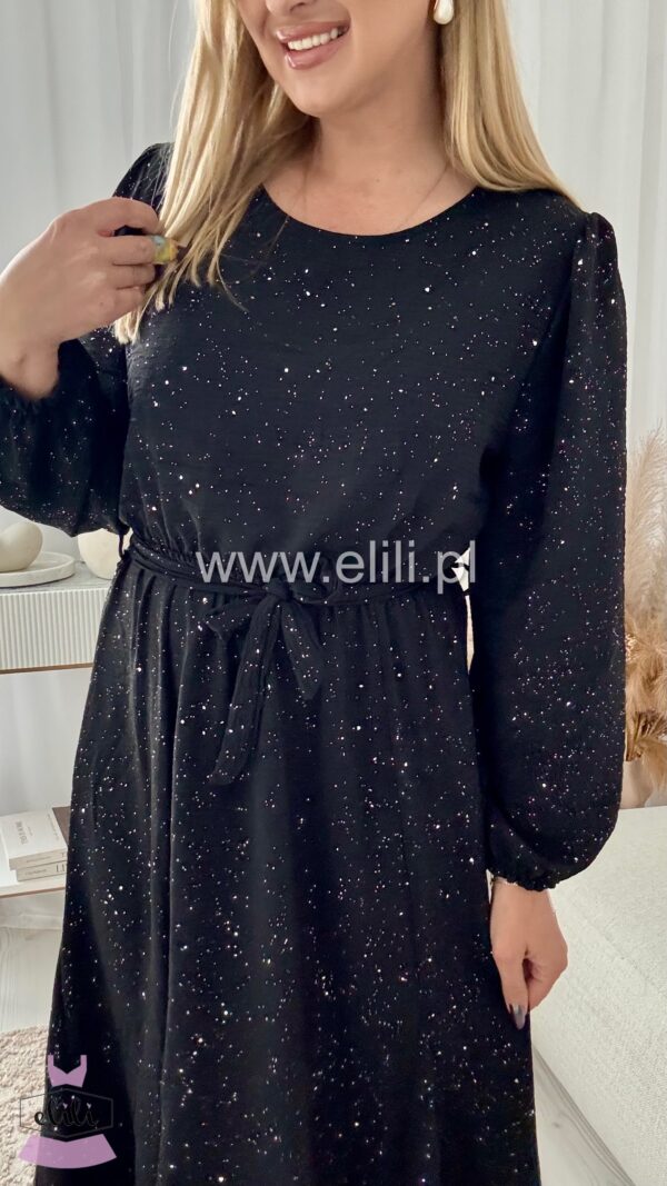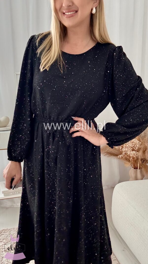 Sukienka z gumką w talii przewiązywana paskiem. Posiada błyszczące aplikacje