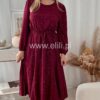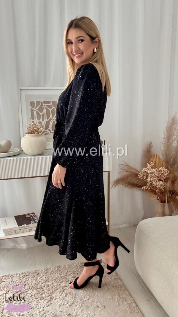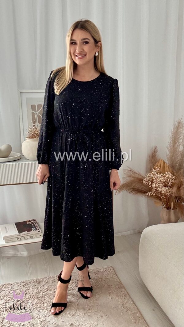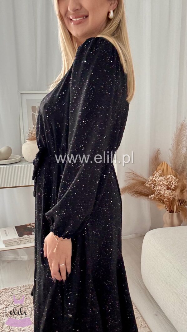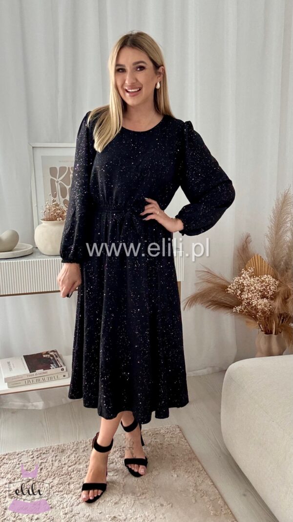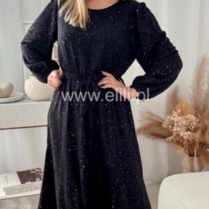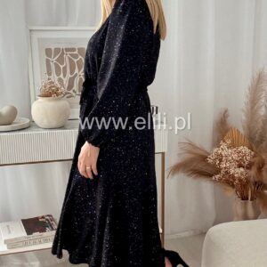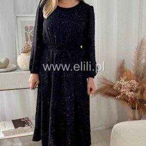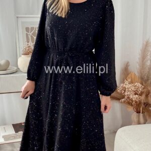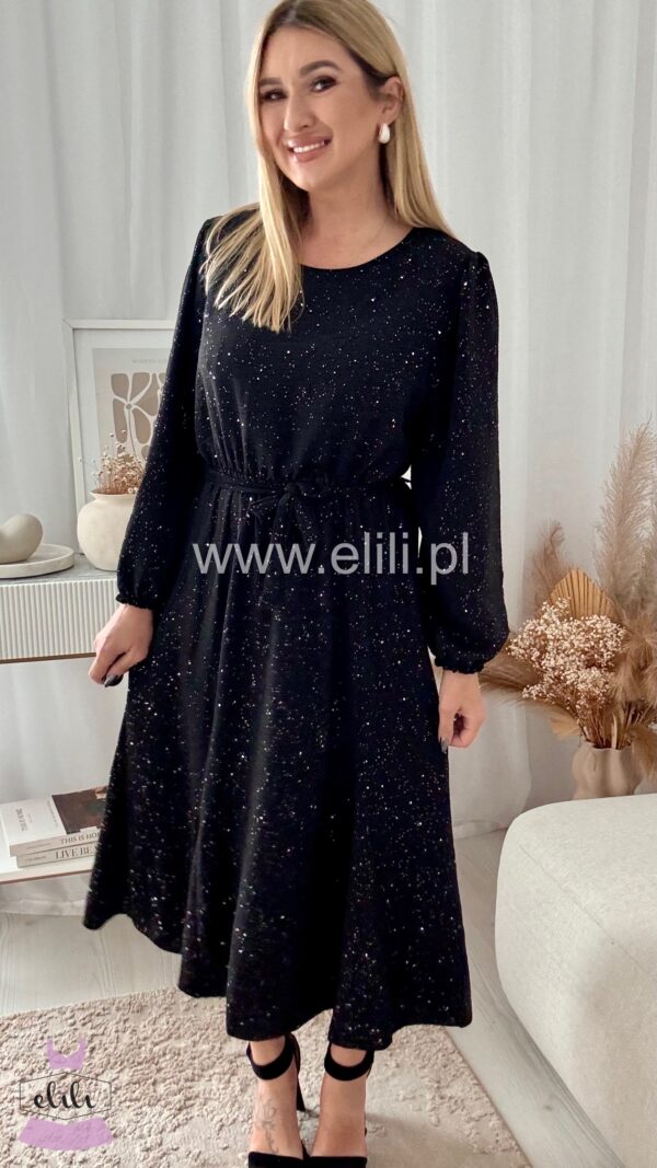 Sukienka z gumką w talii przewiązywana paskiem. Posiada błyszczące aplikacje