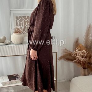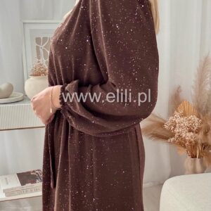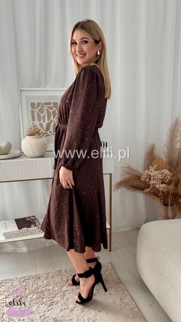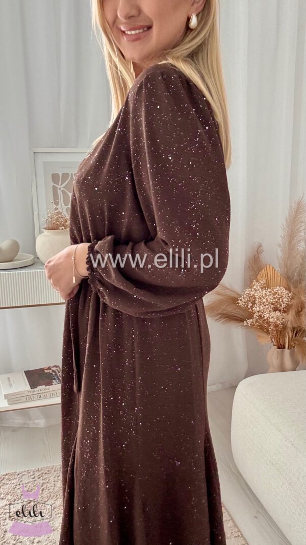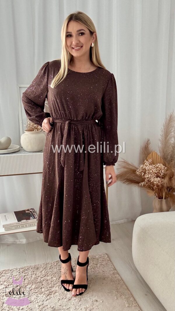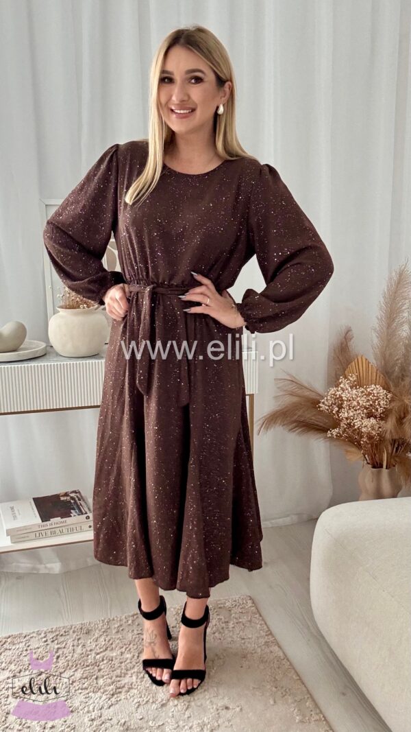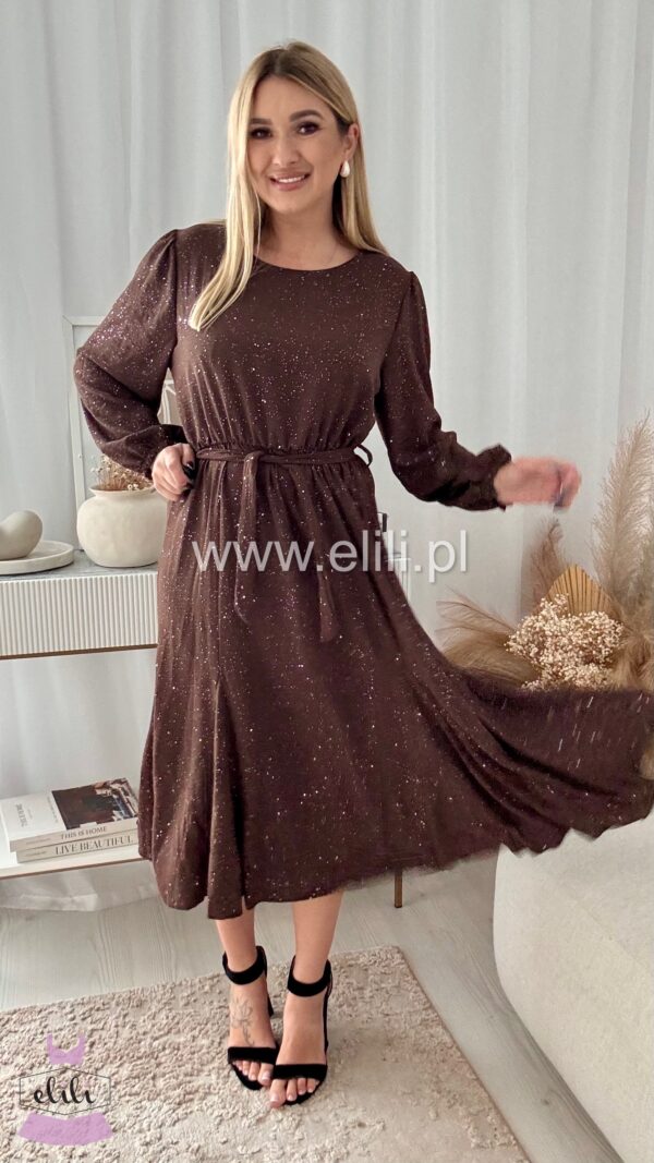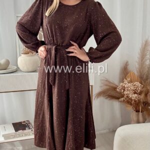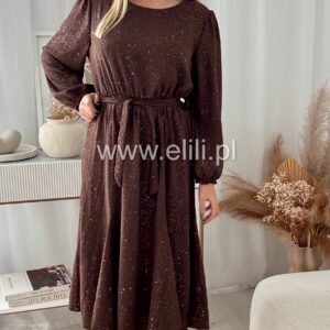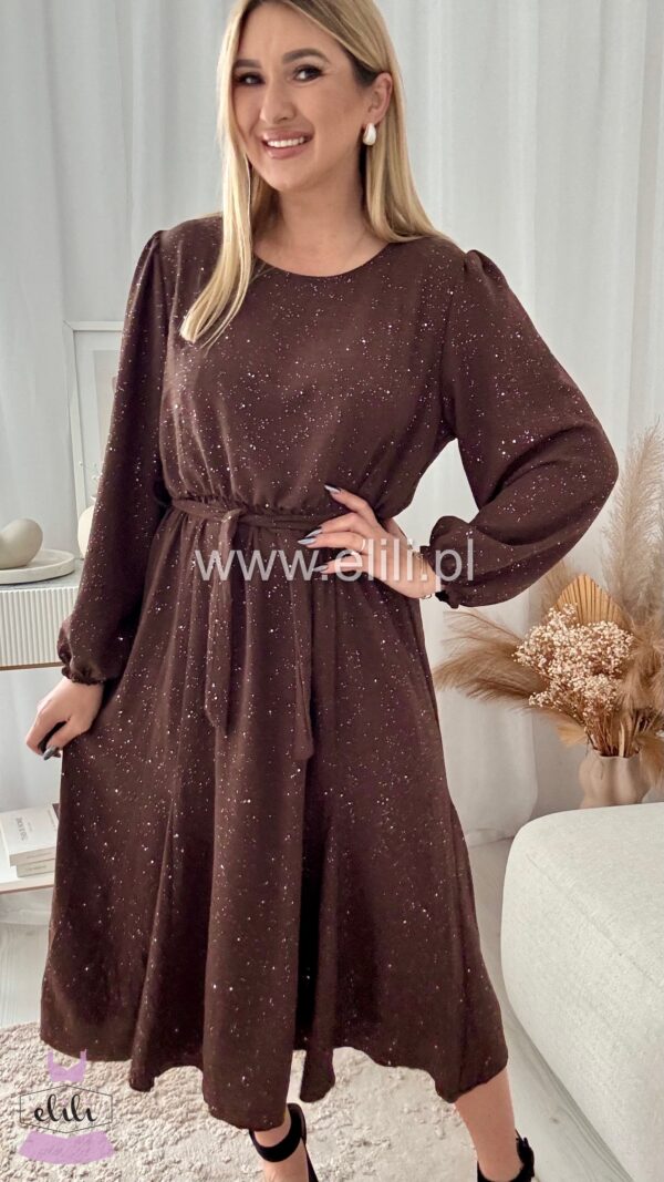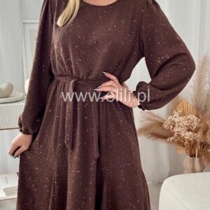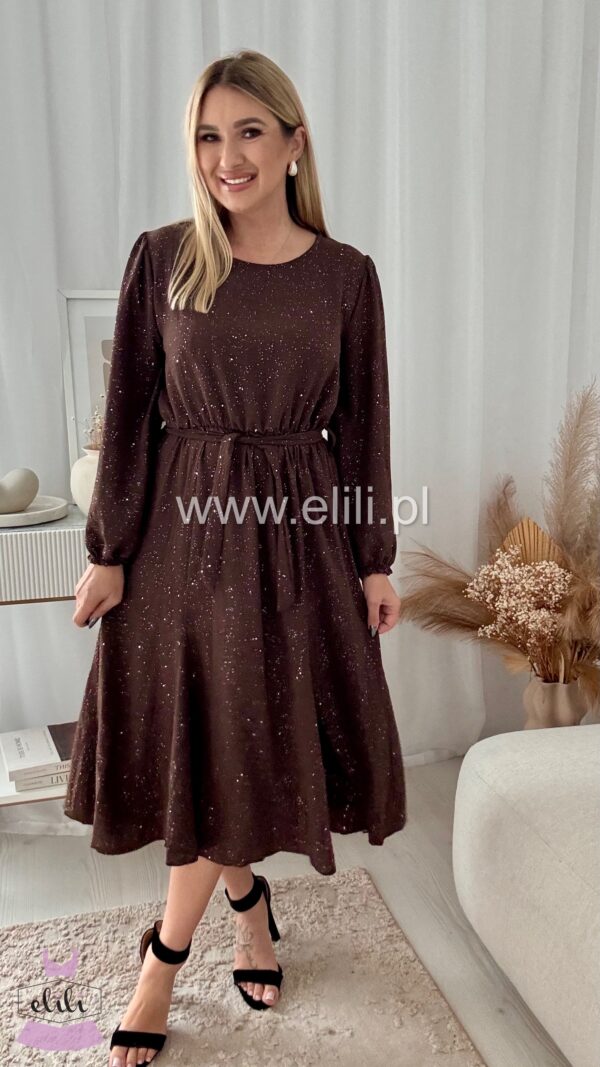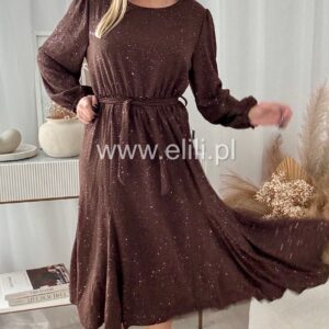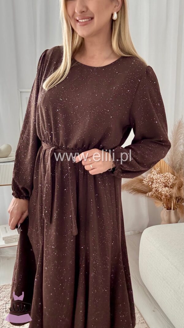 Sukienka z gumką w talii przewiązywana paskiem. Posiada błyszczące aplikacje