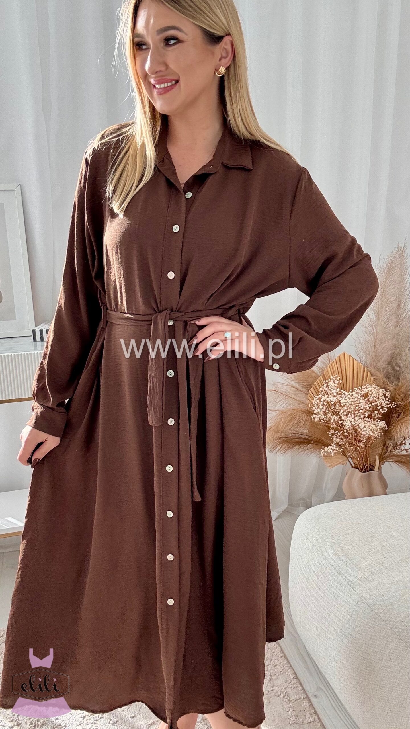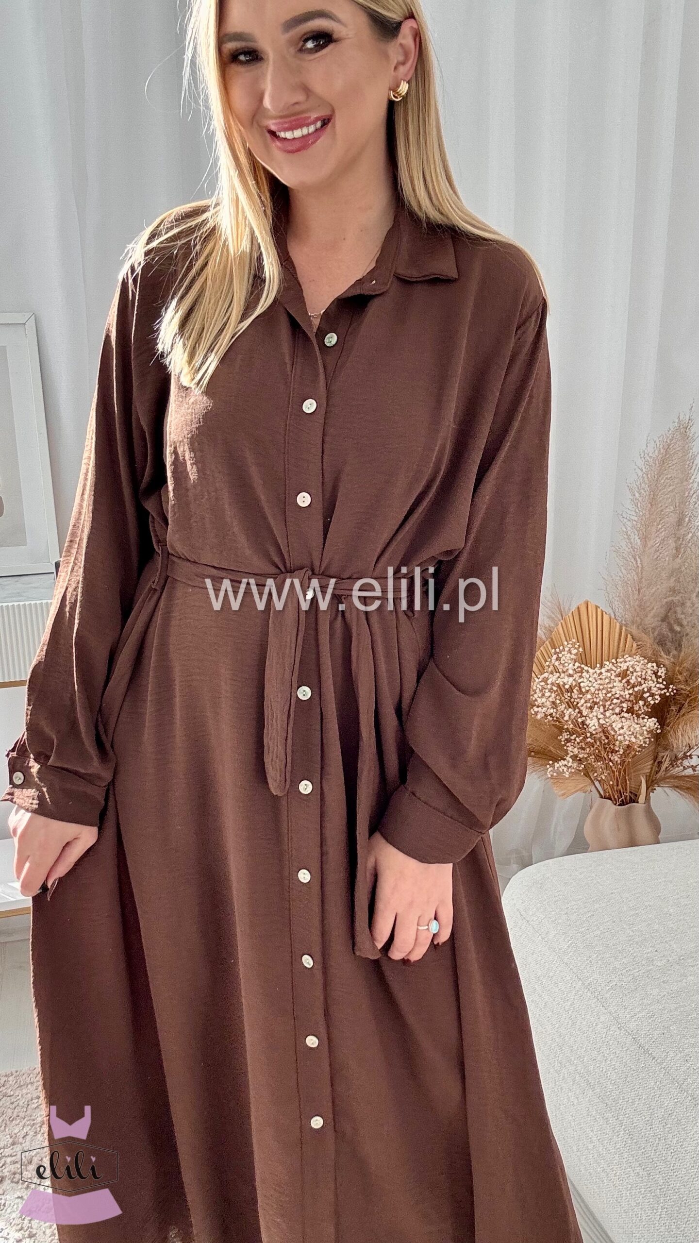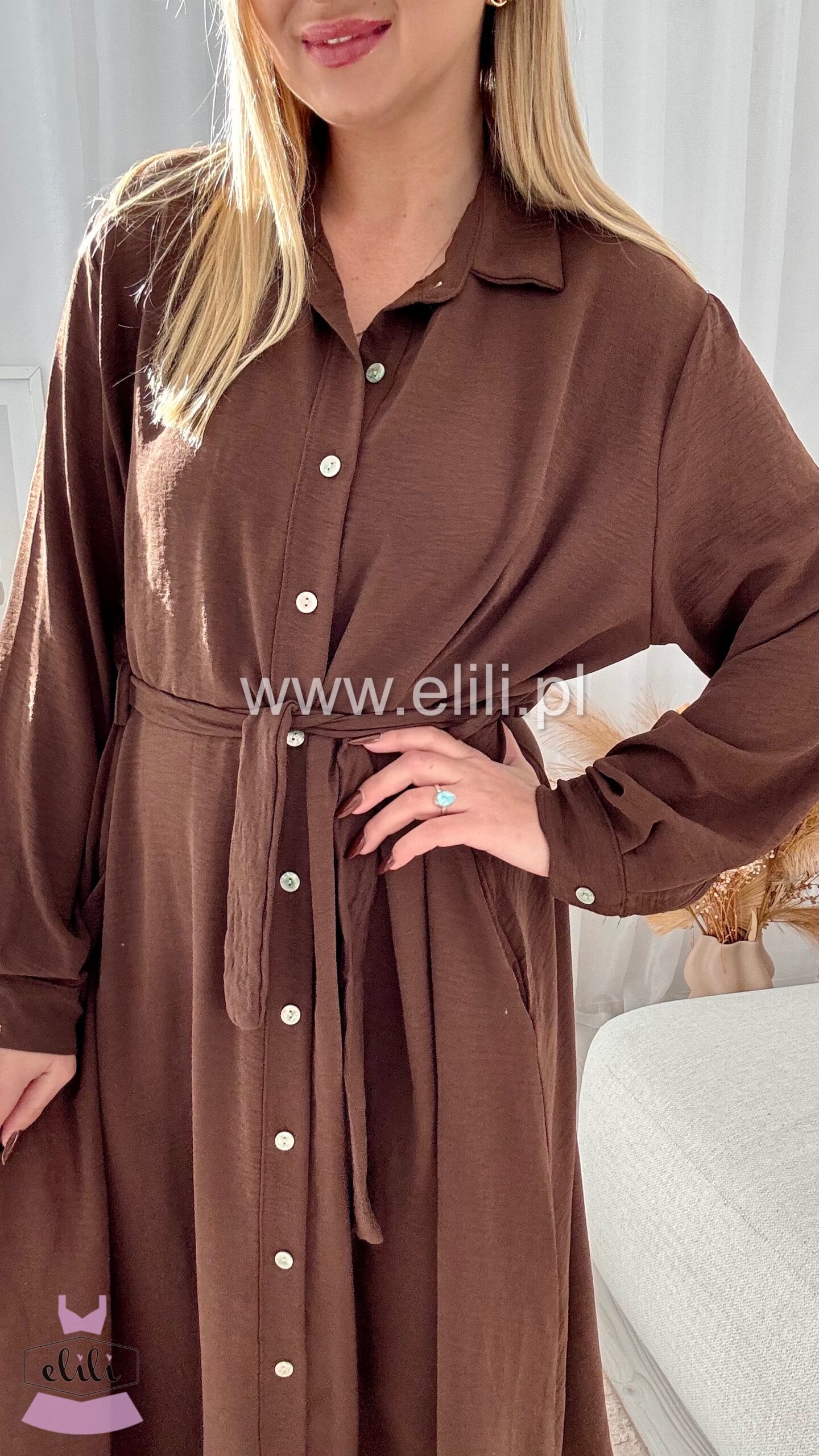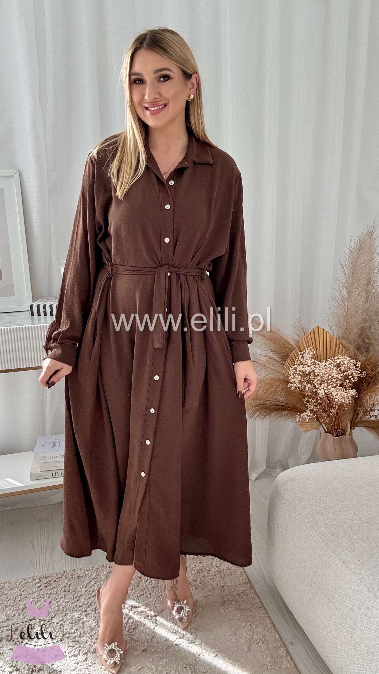 Sukienka maxi o prostym kroju przewiązywana paskiem. Posiada rozpinane guziki.