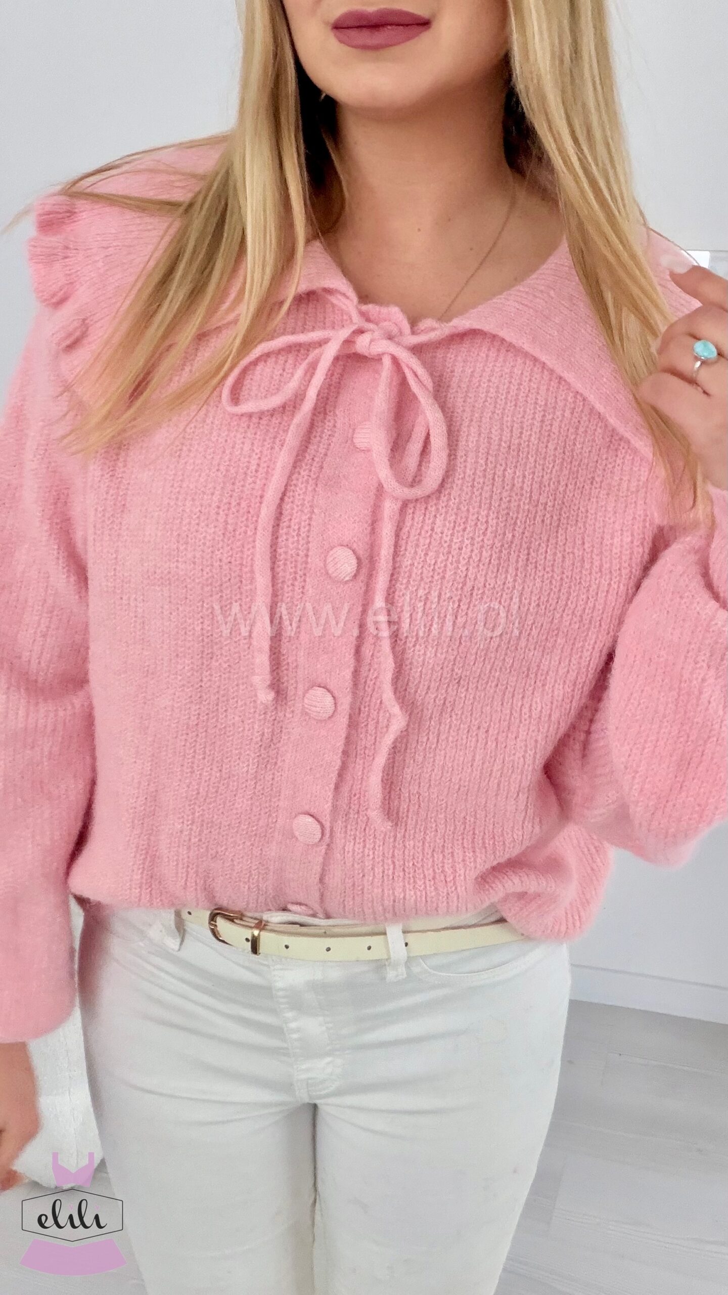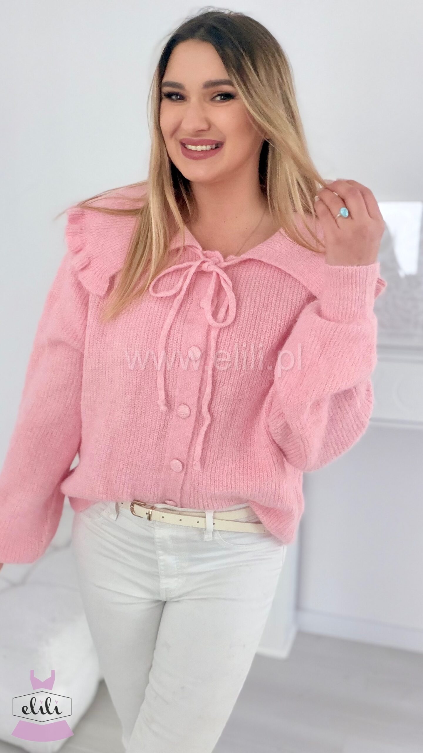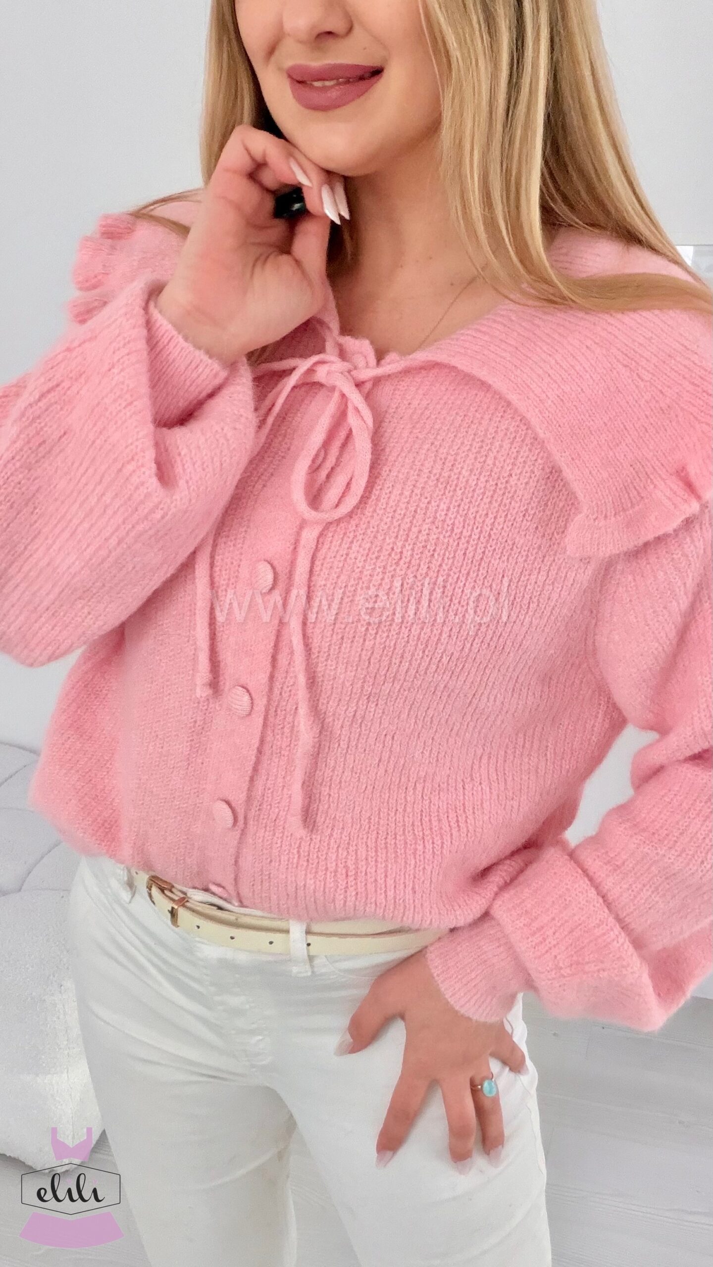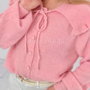 Zapinany uroczy kardigan. Posiada kołnierzyk z falbanką oraz dodatkowe wiązanie pod szyją. Bardzo elastyczny
