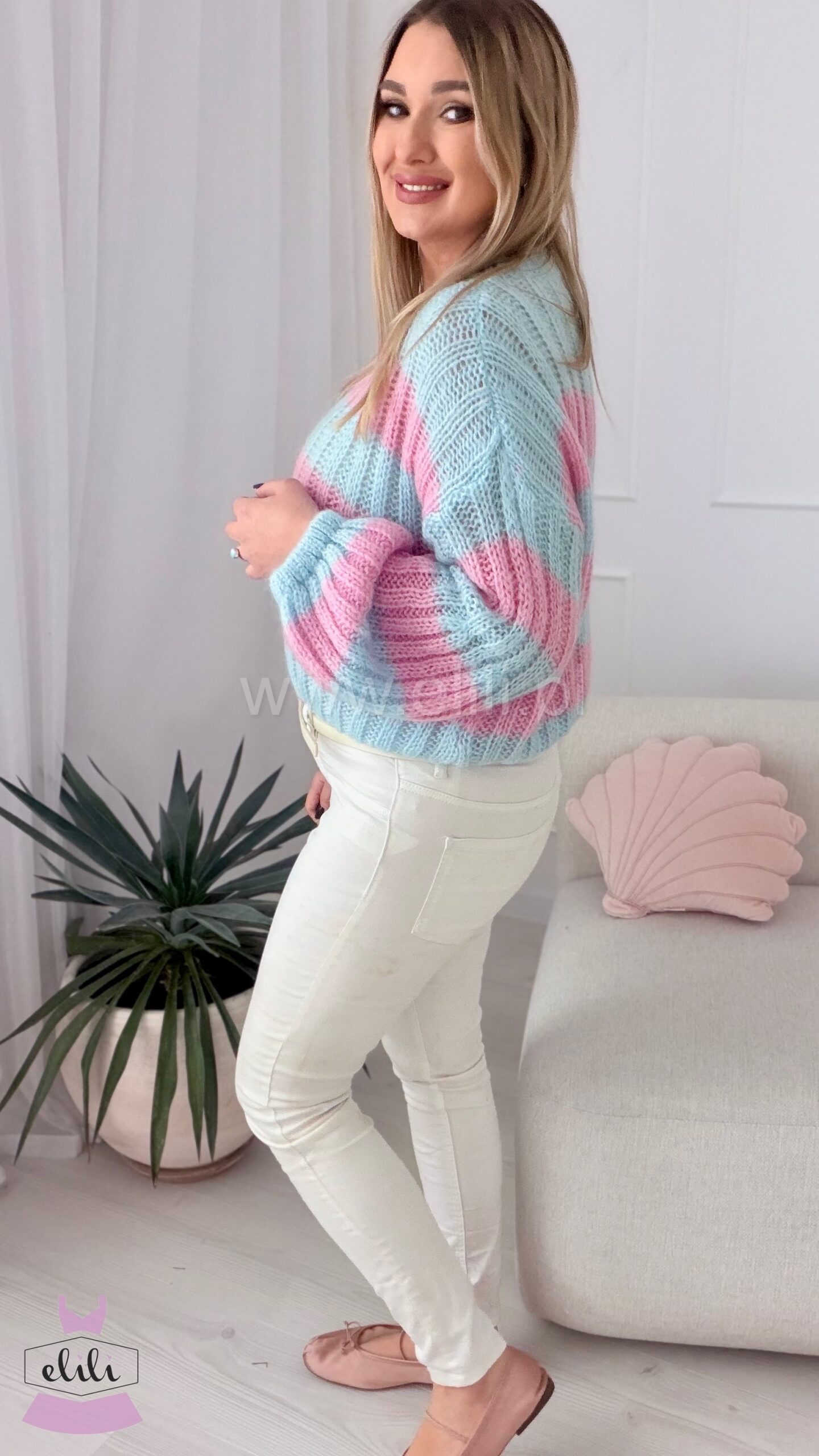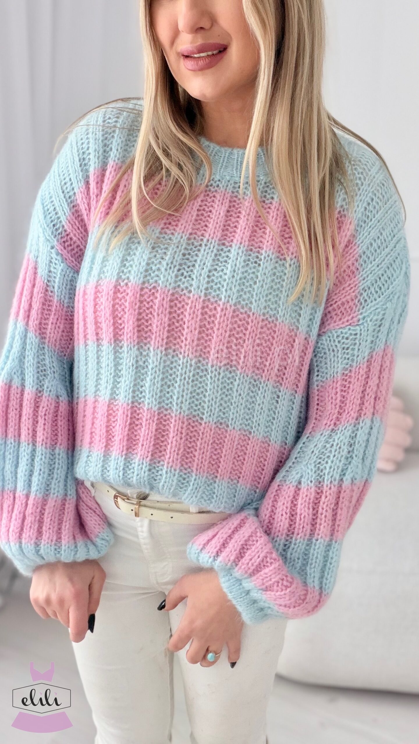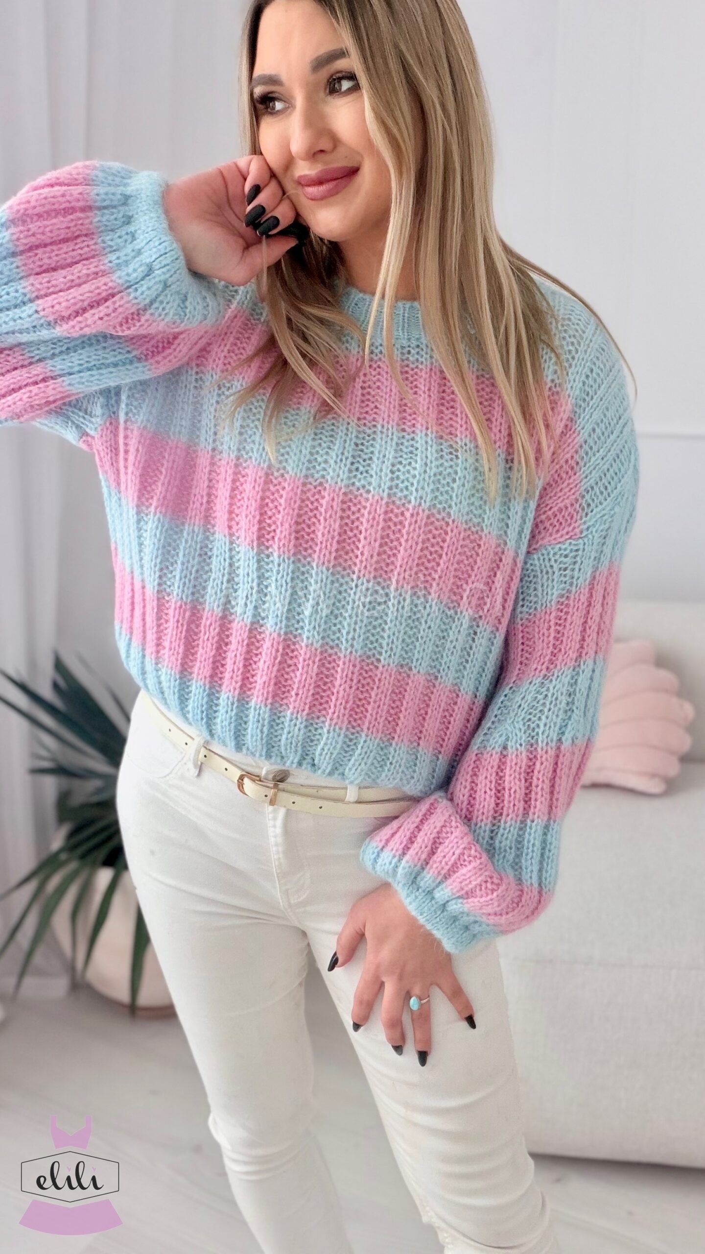Miękki sweterek wykonany z wysokiej jakości, moherowej włóczki to propozycja, której nie może zabraknąć w żadnej jesienno-zimowej garderobie! Całość jest niezwykle przyjemna w dotyku, zapewni komfort i ciepło podczas zimniejszych dni. To model o skróconym fasonie z zaokrąglonym dekoltem. Uroku nadają mu rękawy, które w górnej części są dopasowane, a rozszerzają się ku dołowi. Ta opcja zaprezentuje się naprawdę modnie w stylizacjach w codziennej odsłonie.