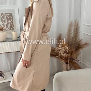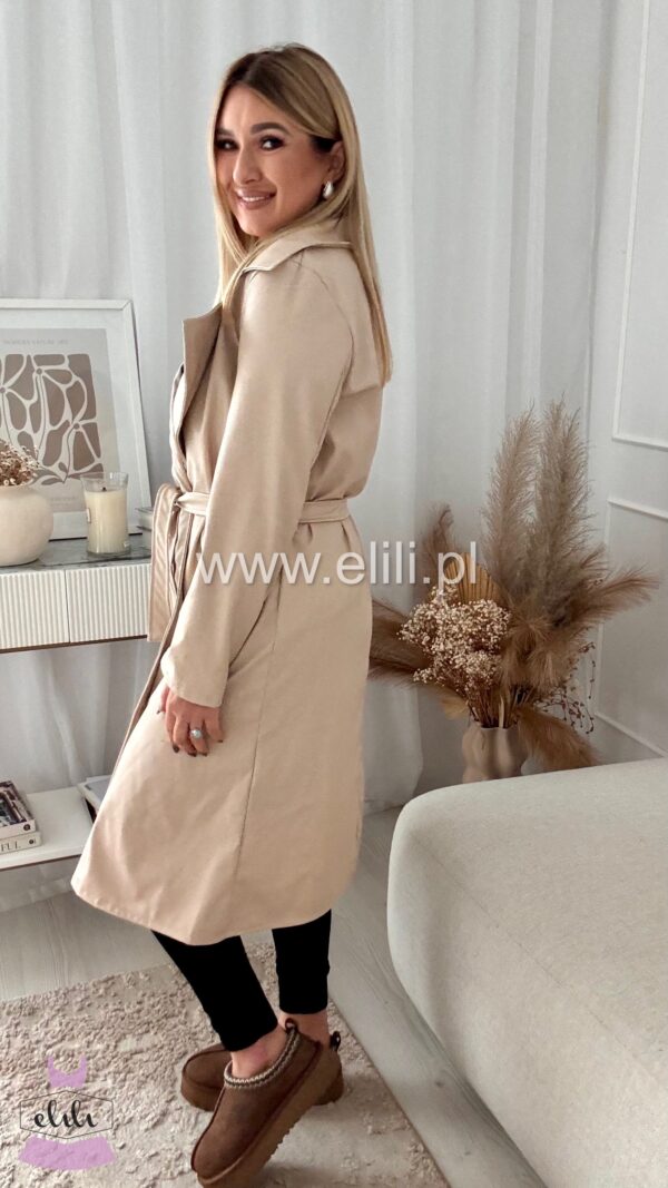 Stylowy, lekki i ponadczasowy – rozpinany delikatnie taliowany płaszcz z eko skóry. Uszyty z grubszego materiału, pięknie się układa. Posiada kieszenie
