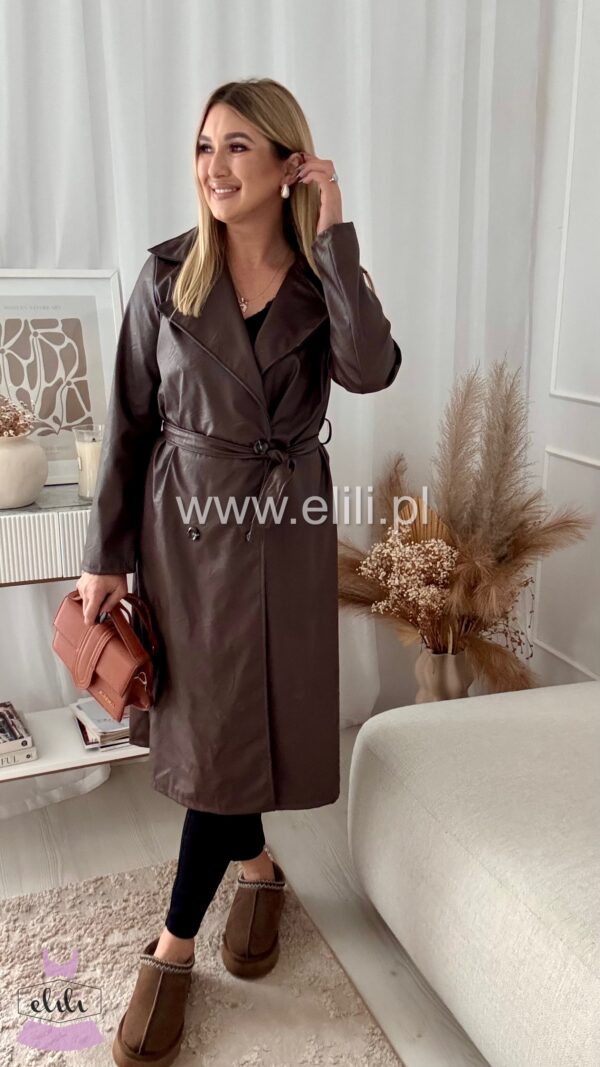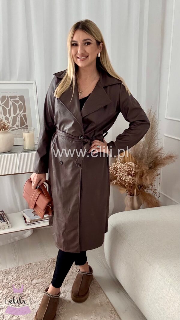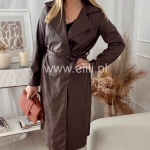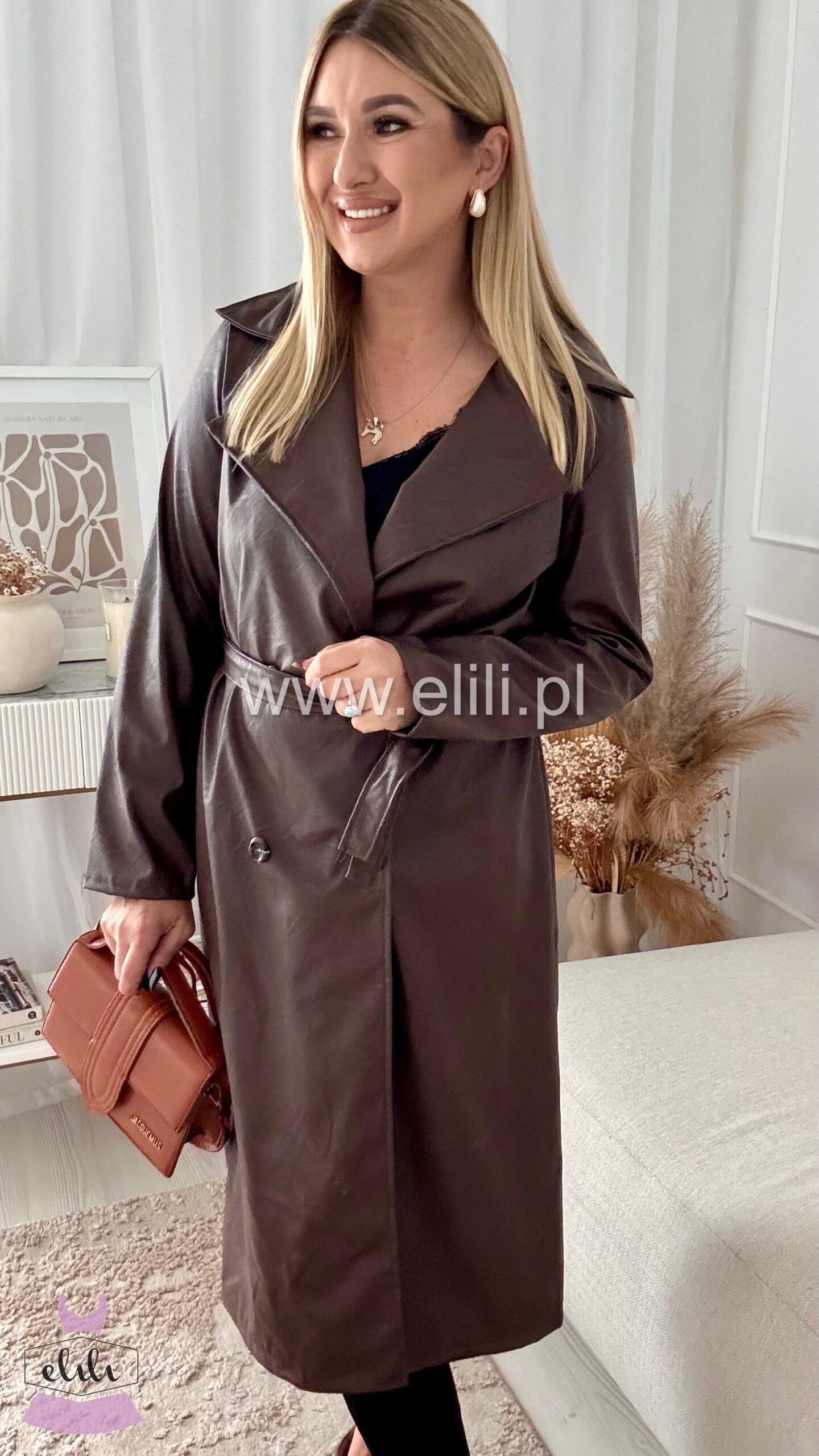 Stylowy, lekki i ponadczasowy – rozpinany delikatnie taliowany płaszcz z eko skóry. Uszyty z grubszego materiału, pięknie się układa. Posiada kieszenie